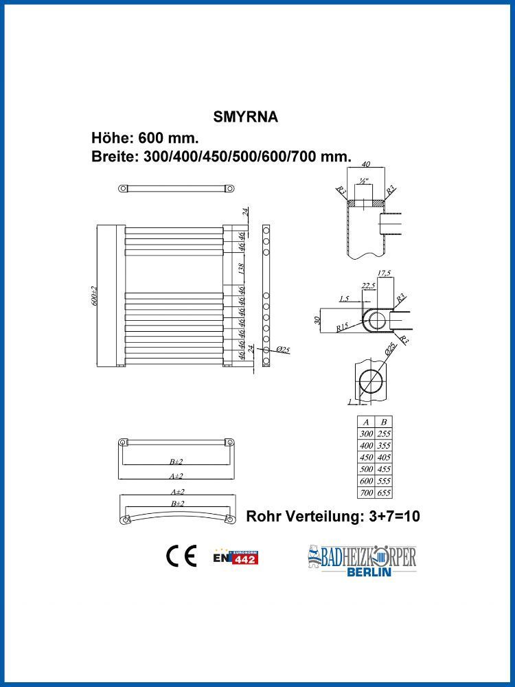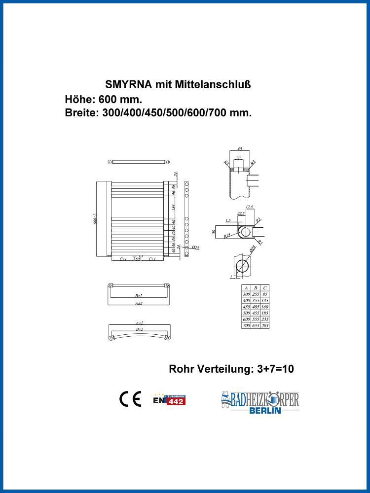 Badheizkörper SMYRNA Weiß 450 x 600 mm. Gerade oder Gebogen