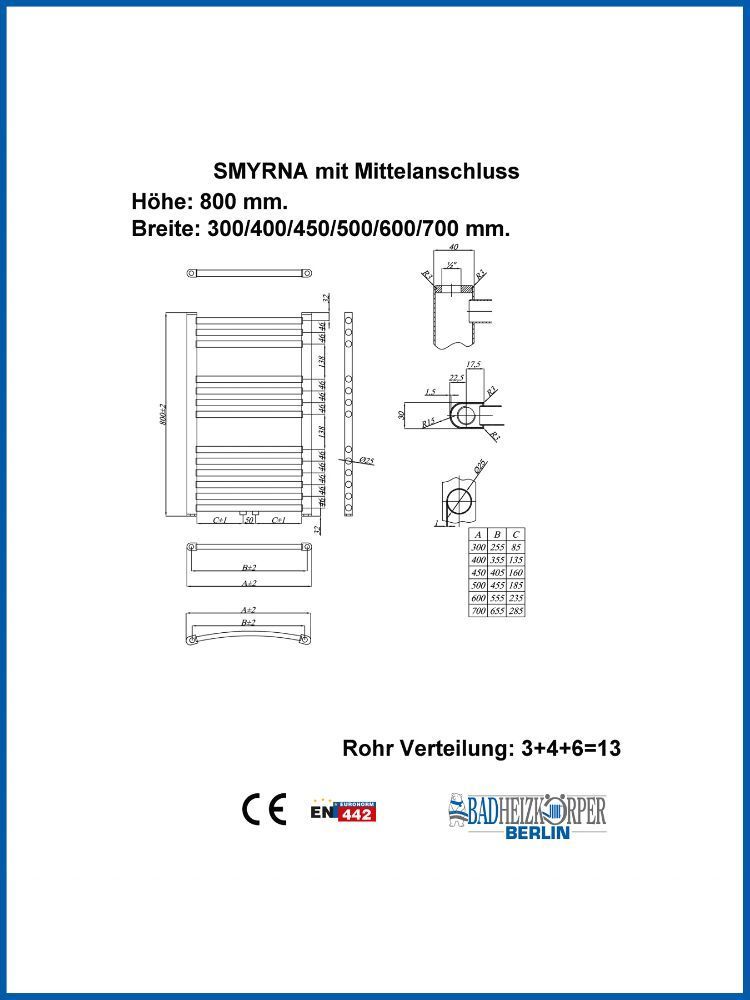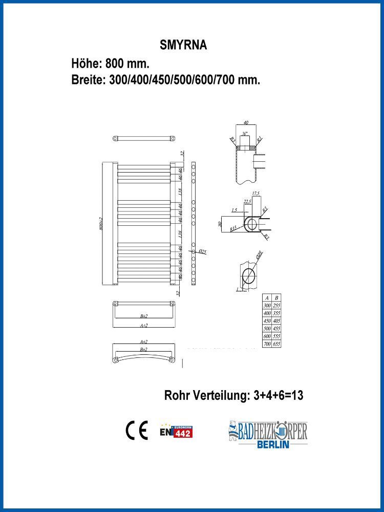 Badheizkörper SMYRNA Weiß 450 x 800 mm. Gerade oder Gebogen