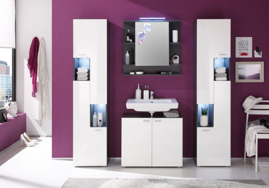 • Badezimmer Badmöbel Set weiß Hochglanz grau Badkombination mit Midischrank Bailey