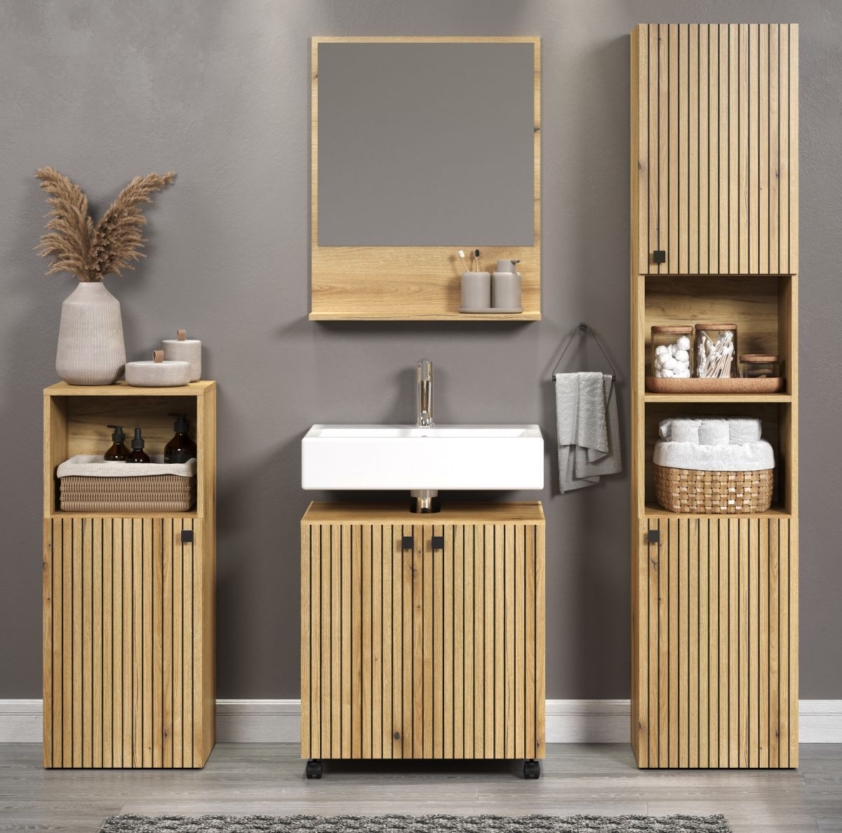 trendteam Badmöbel Komplett Set 4-tlg. in Evoke Eiche Badezimmer Badmöbel Bliss Badset 160 cm