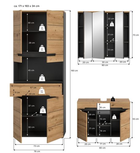Badmöbel Set 3-tlg. Badezimmer Möbel Badkombination Eiche grau Cooper Soft-Close