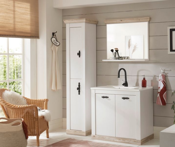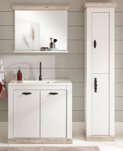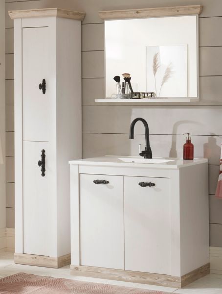 Badmöbel Set 4-tlg. MIT Waschbecken Waschtisch Hochschrank Pinie weiß Rovola 143 cm