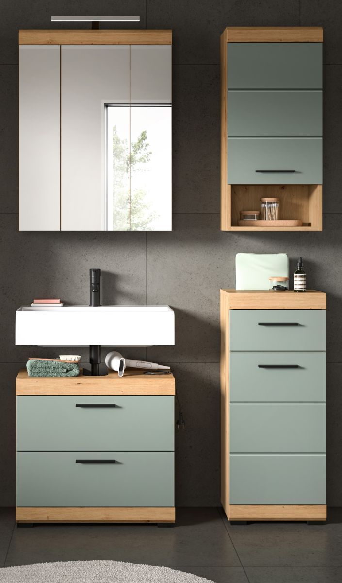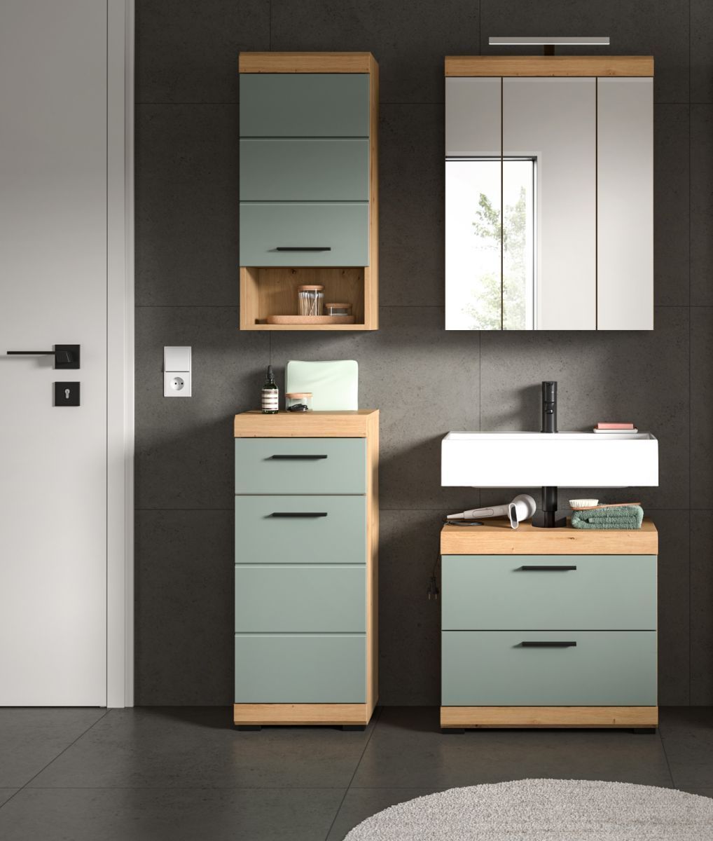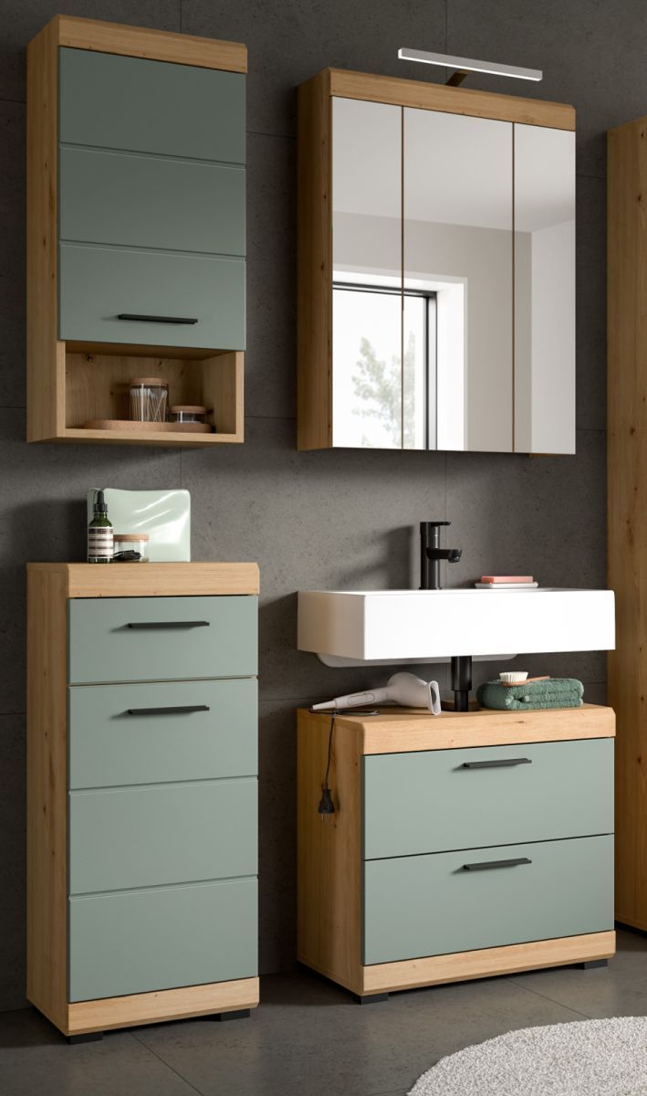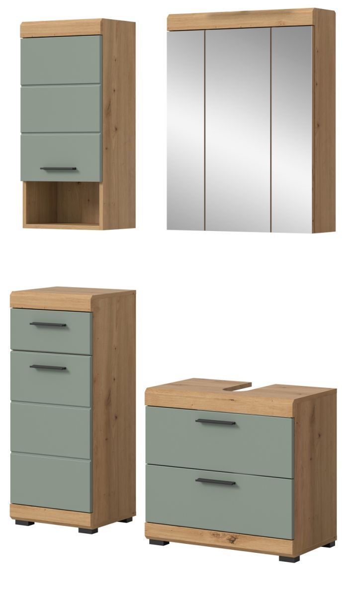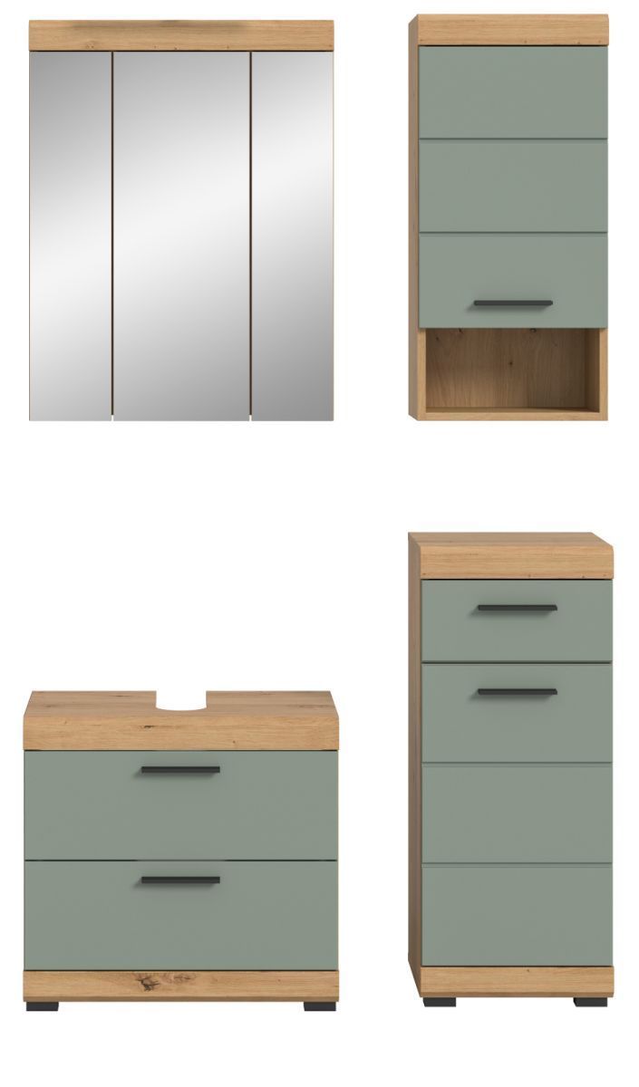 Badmöbel Set Badezimmer 4-tlg Salbei grün Eiche Möbel Spiegelschrank Shawn 112 cm