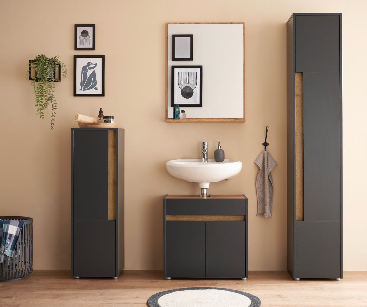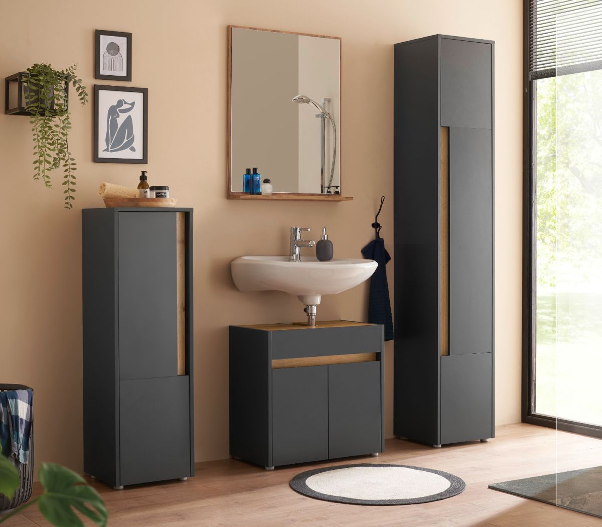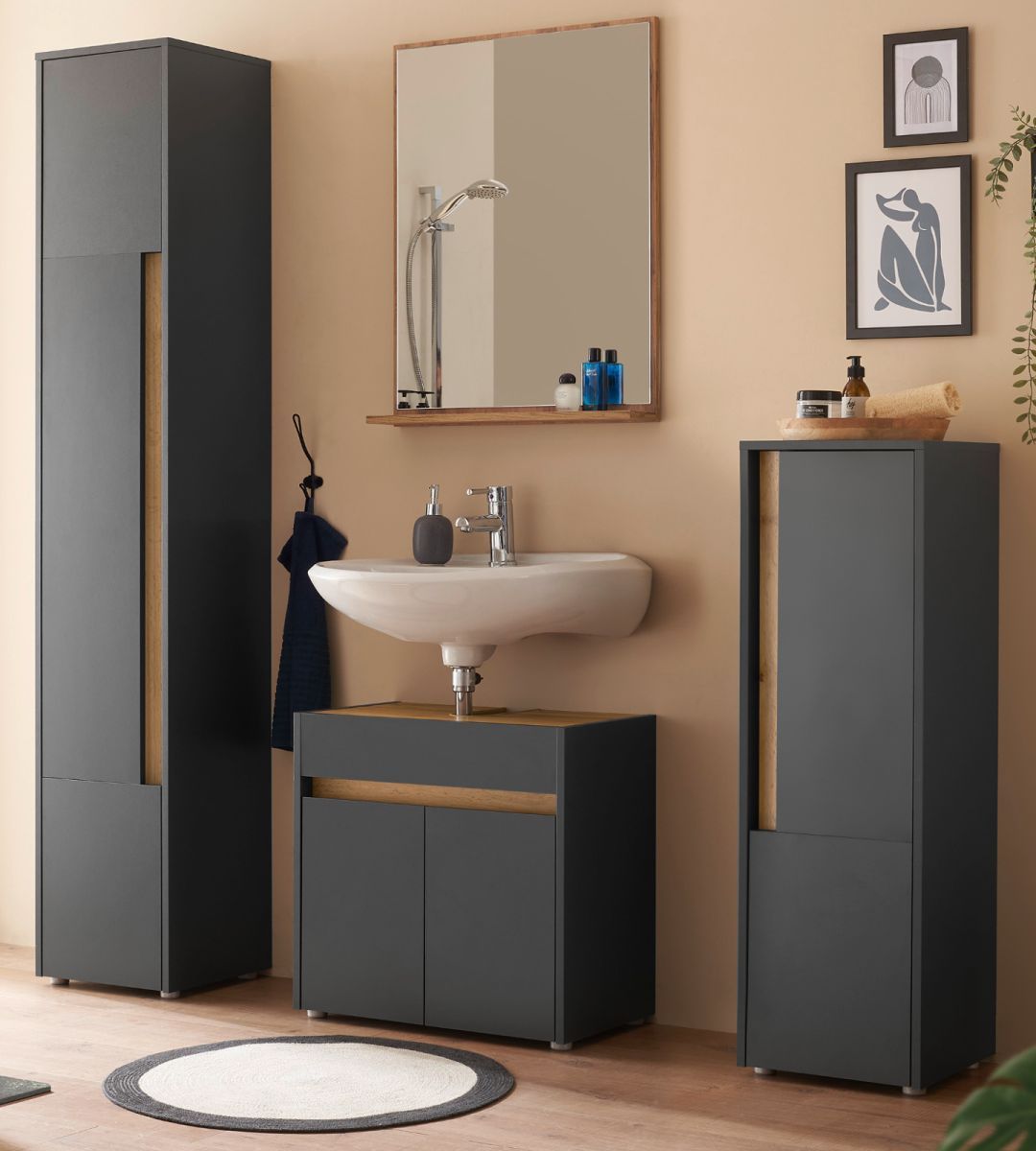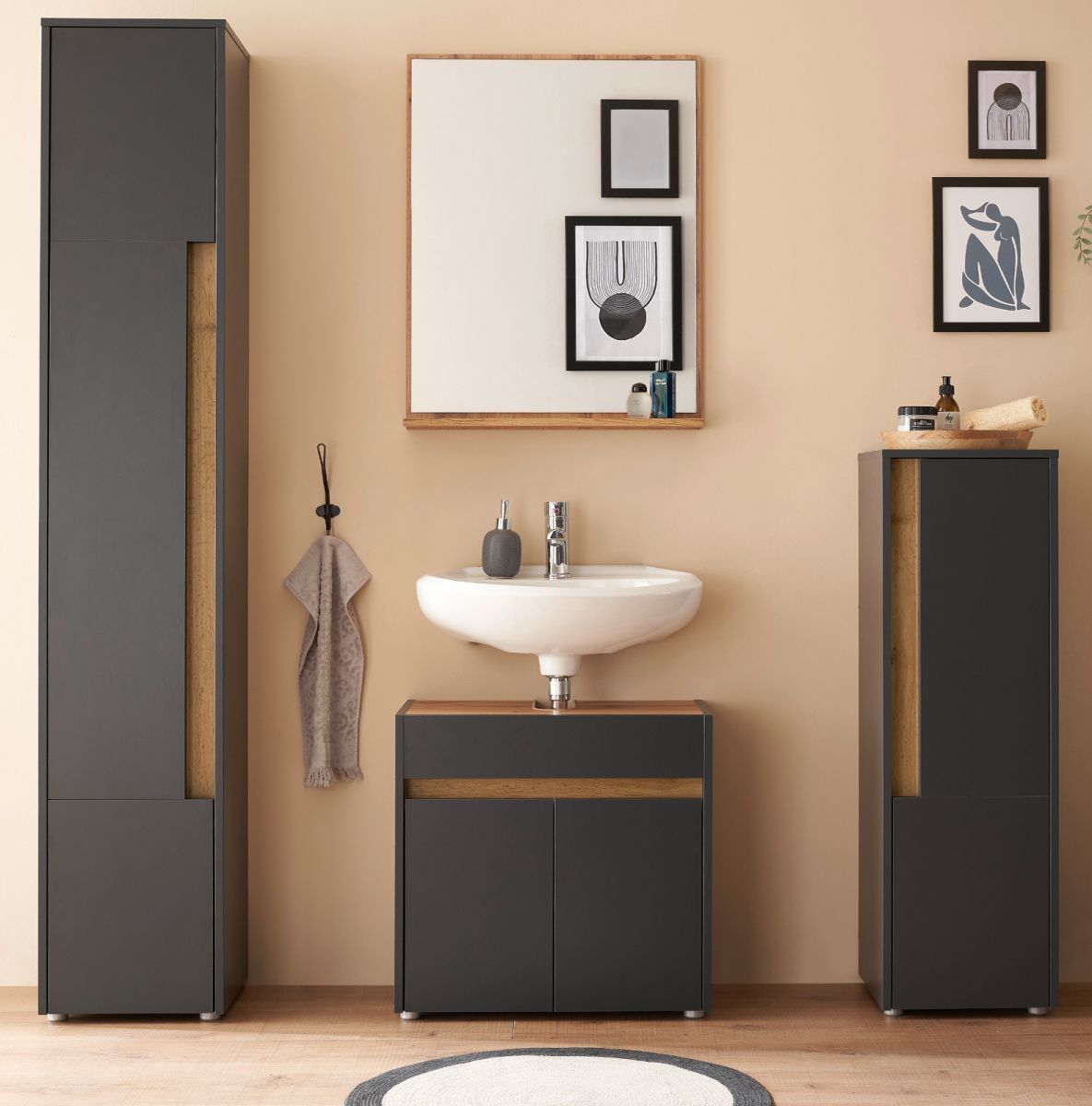 Badmöbel Set Badezimmer grau und Eiche Möbelset 4-tlg. mit Hochschrank Center 168 cm