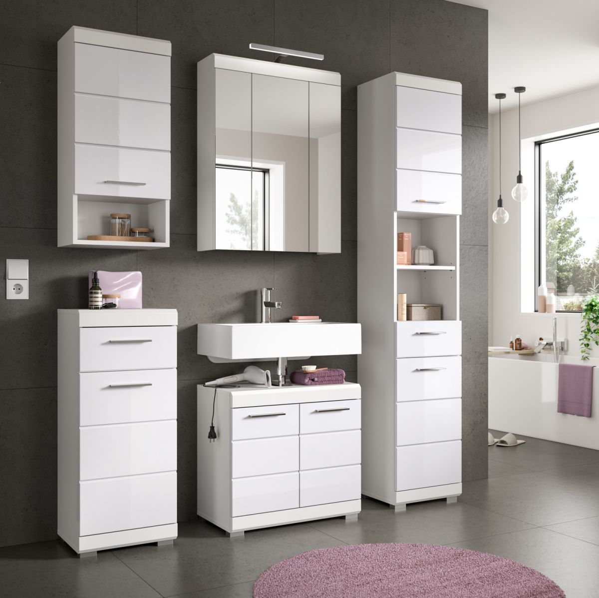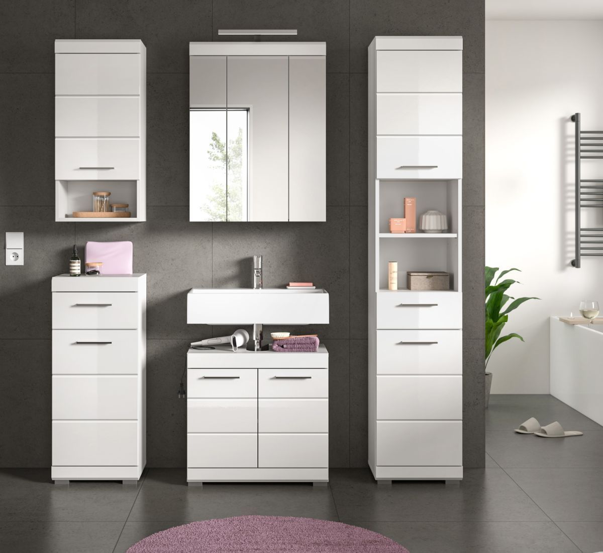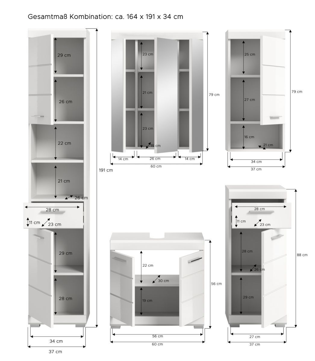 Badmöbel Set Badezimmer komplett 5-tlg. weiß Hochglanz Badkombination Möbelset Shawn