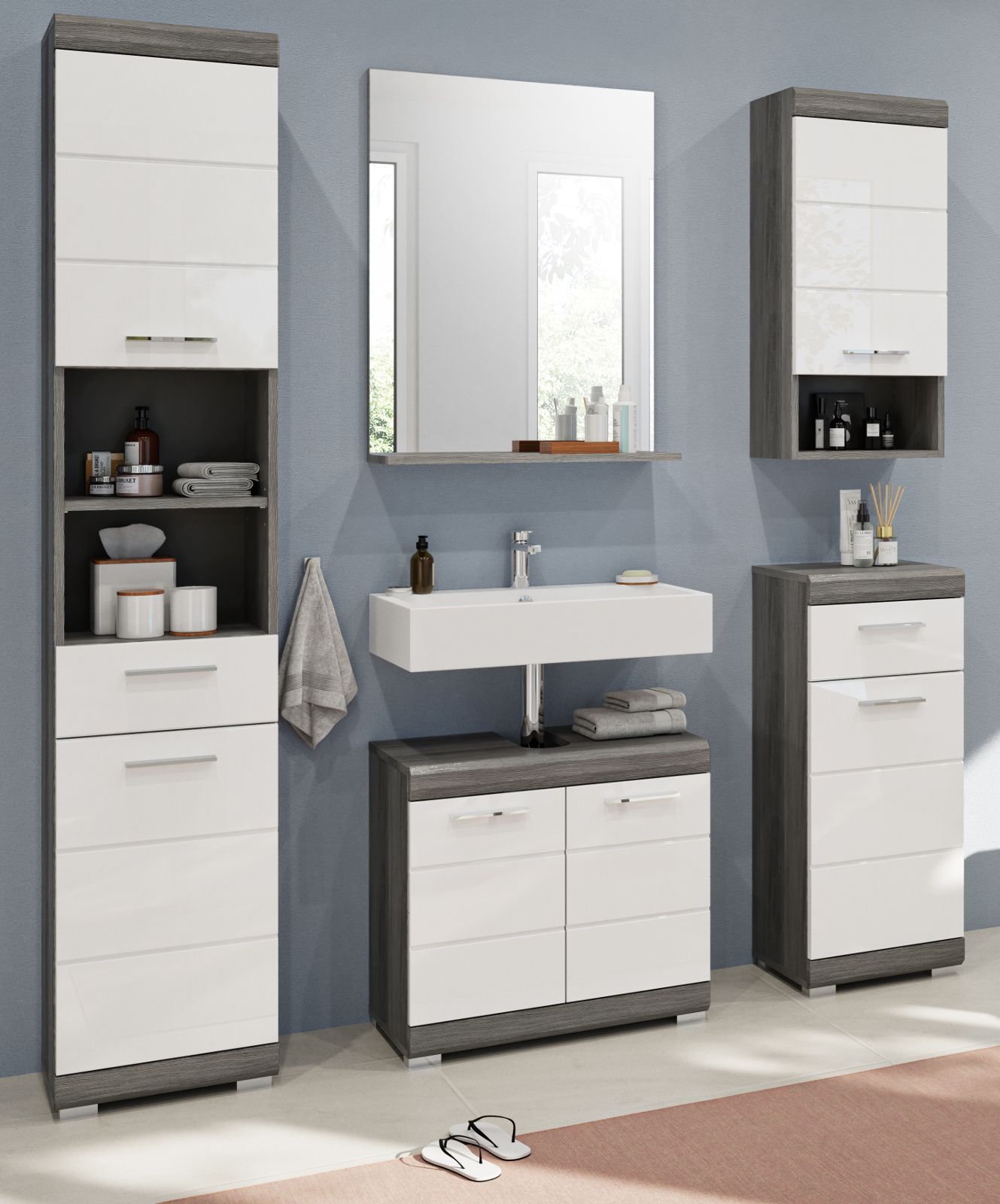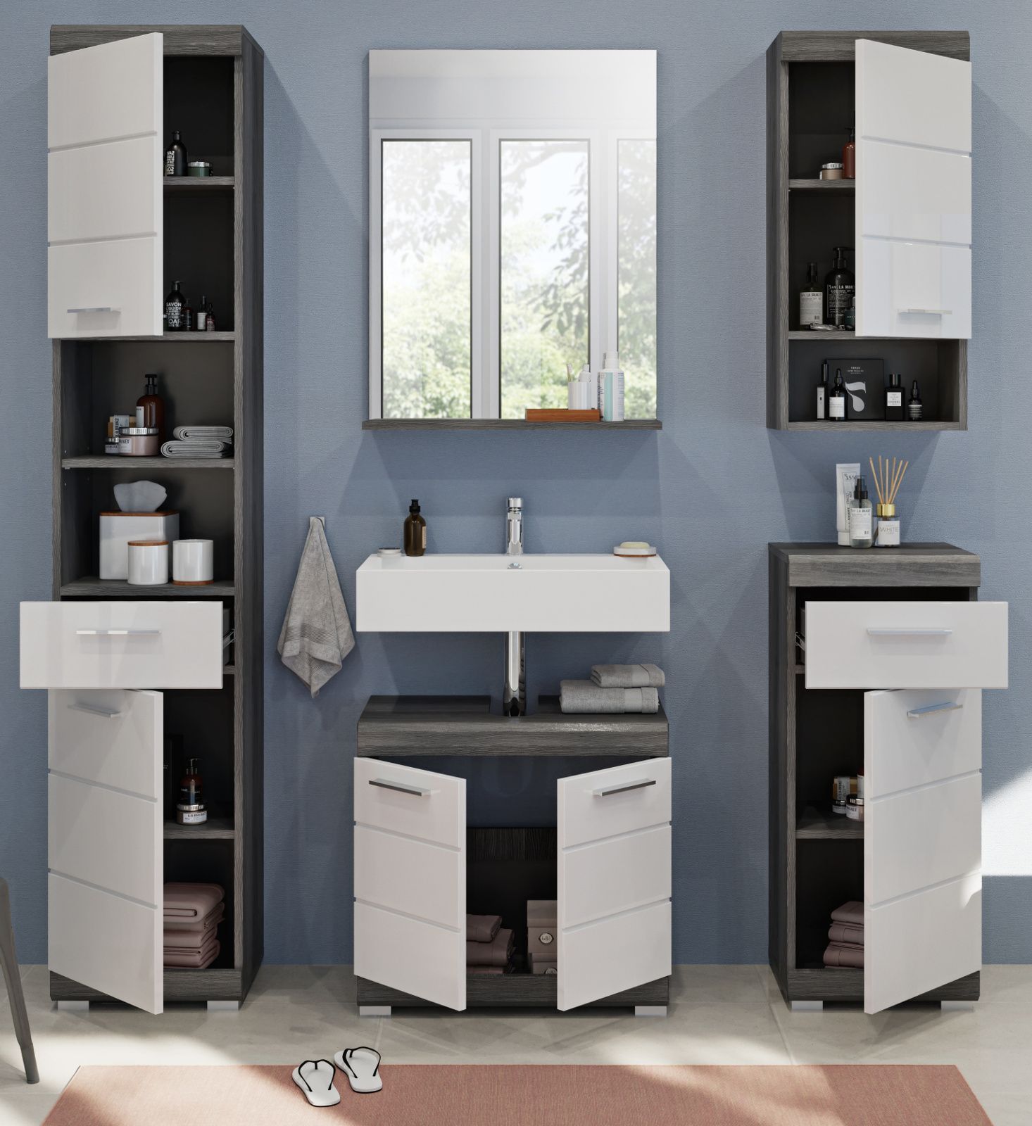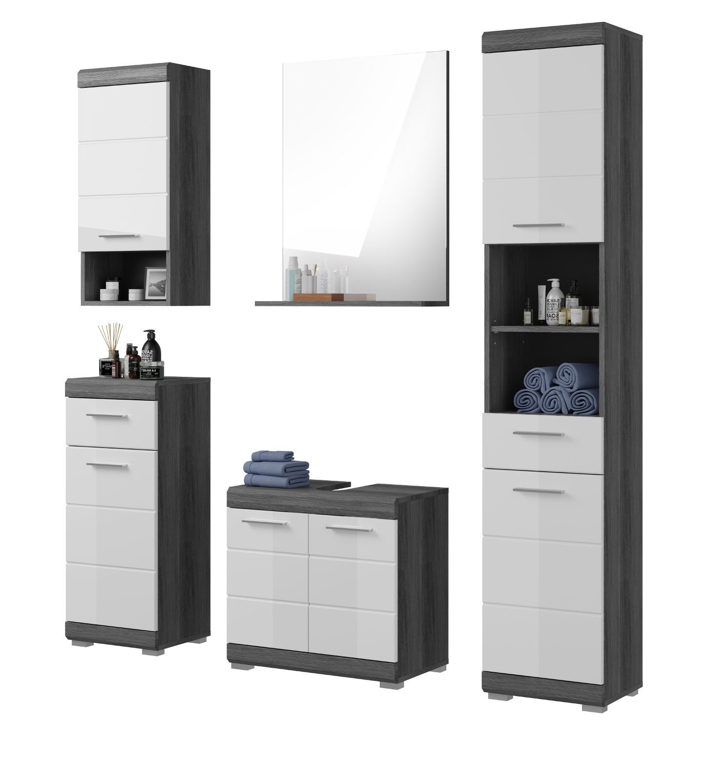 Badmöbel Set Badezimmer komplett 5-tlg. weiß Hochglanz grau Bad Möbelset Shawn