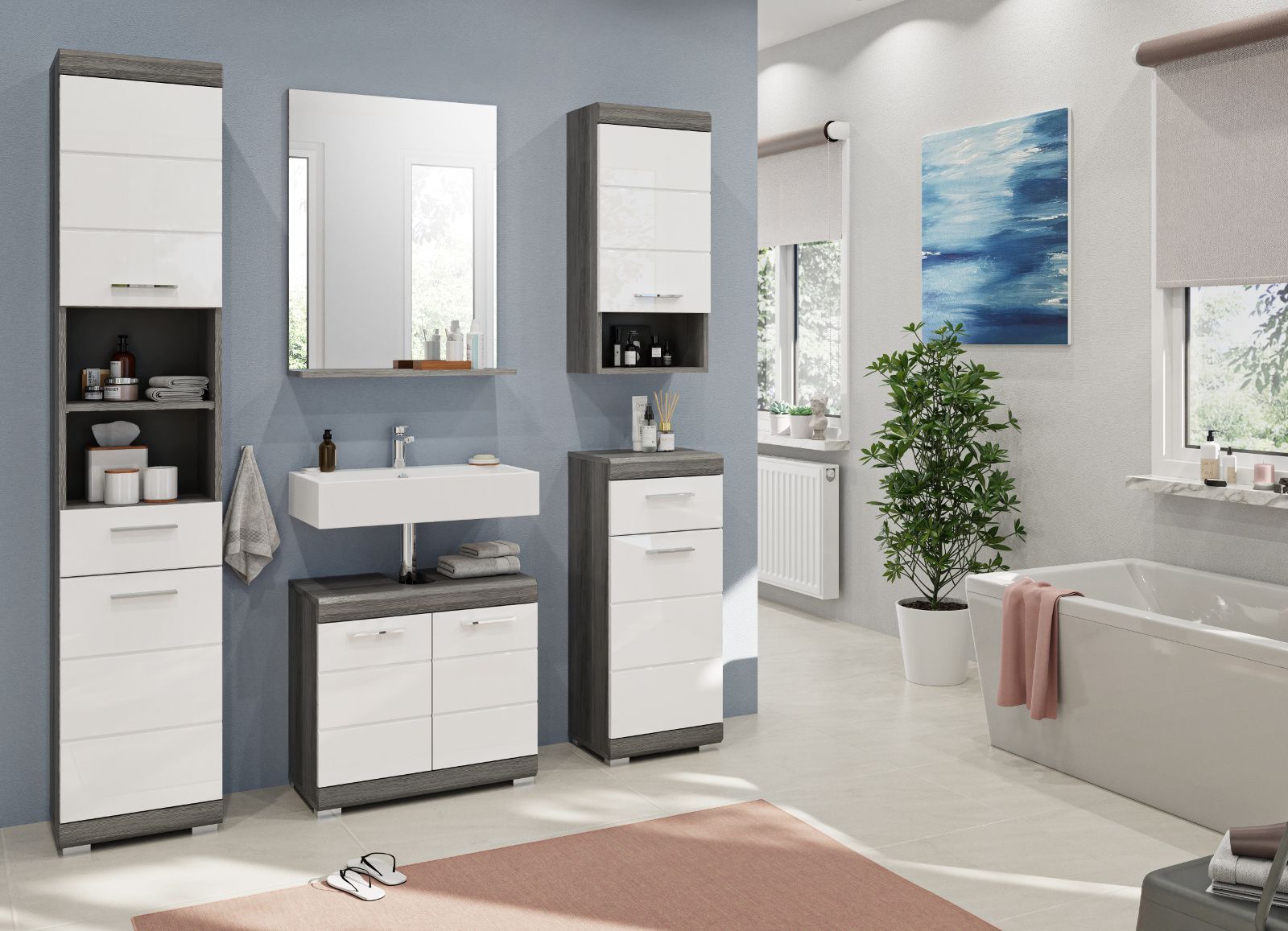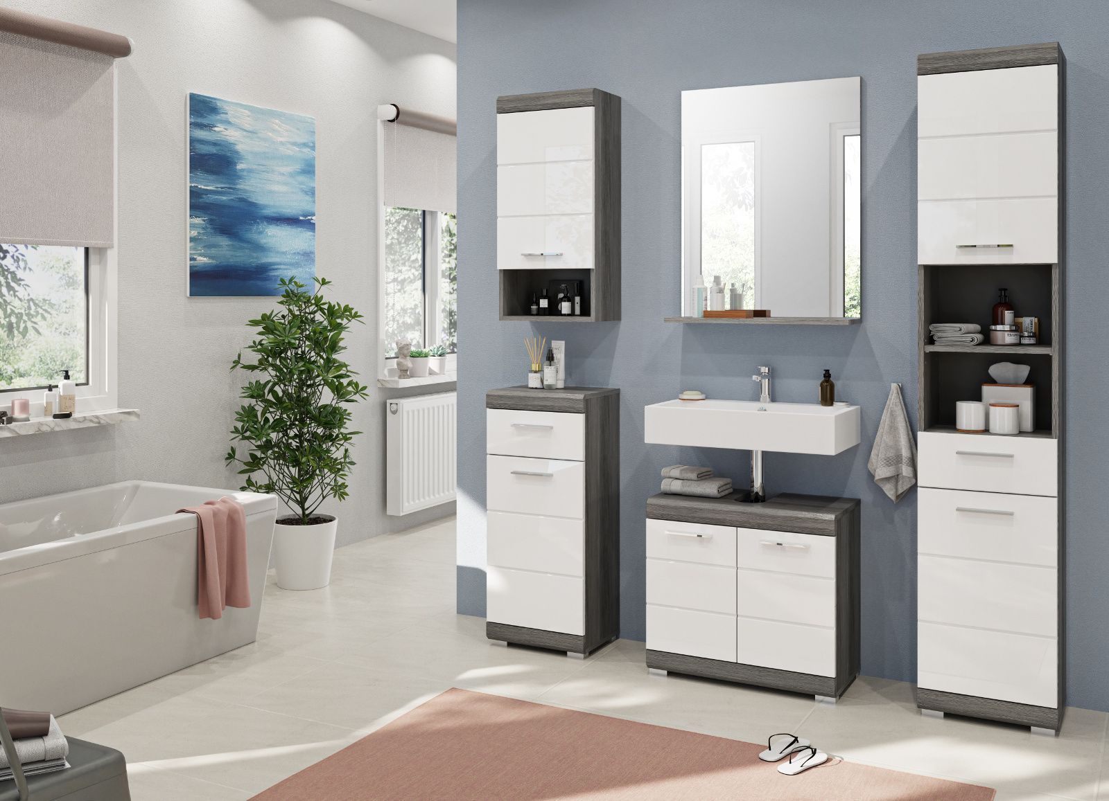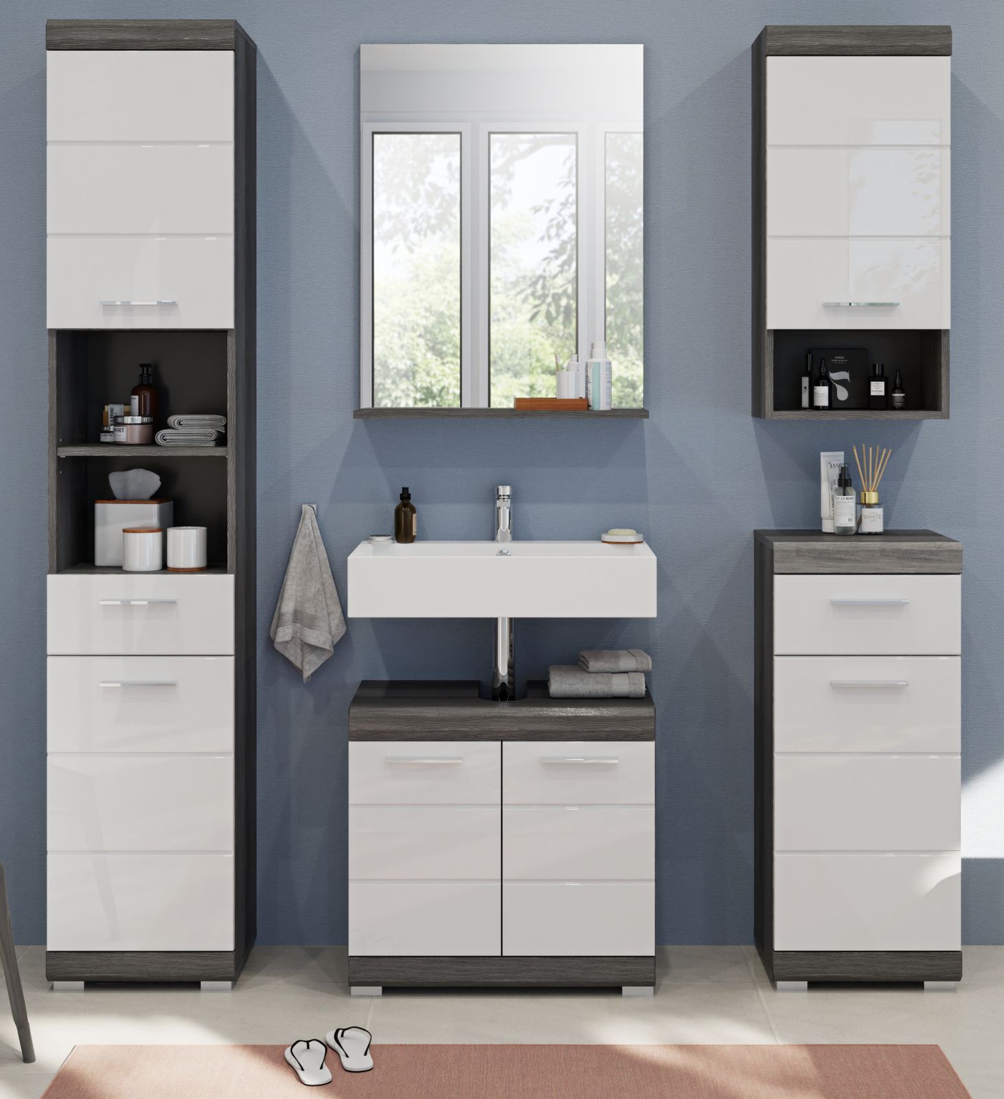 Badmöbel Set Badezimmer komplett 5-tlg. weiß Hochglanz grau Bad Möbelset Shawn
