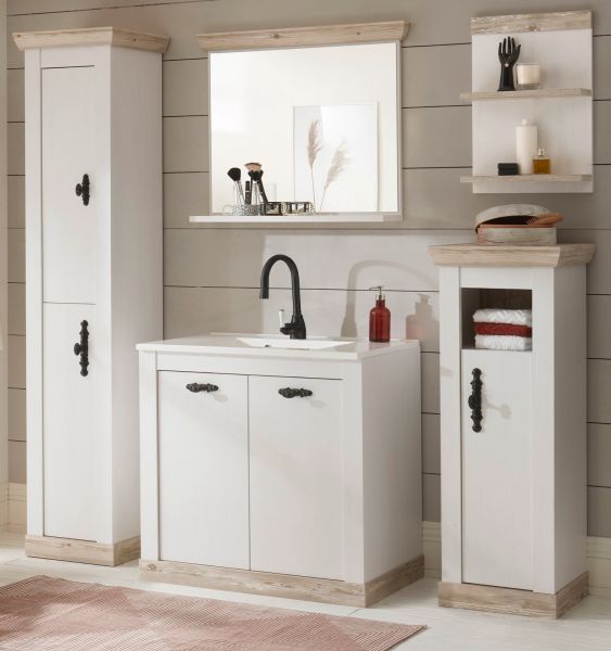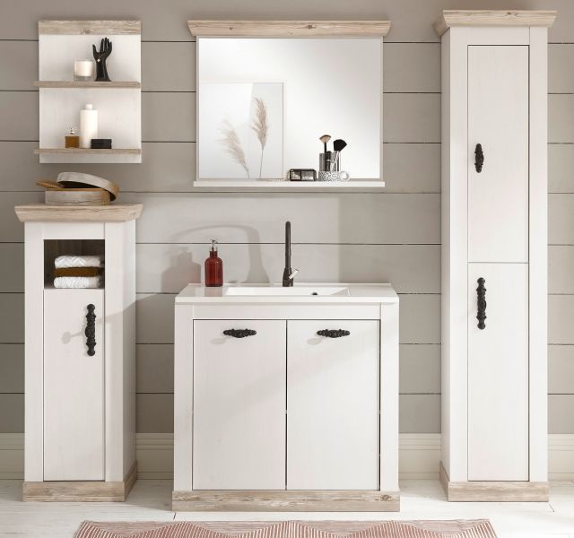 Badmöbel Set Badezimmer komplett 6-teilig weiß Pinie mit Waschbecken Rovola 205 cm