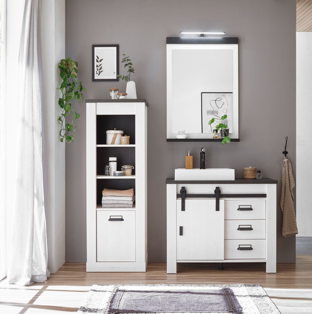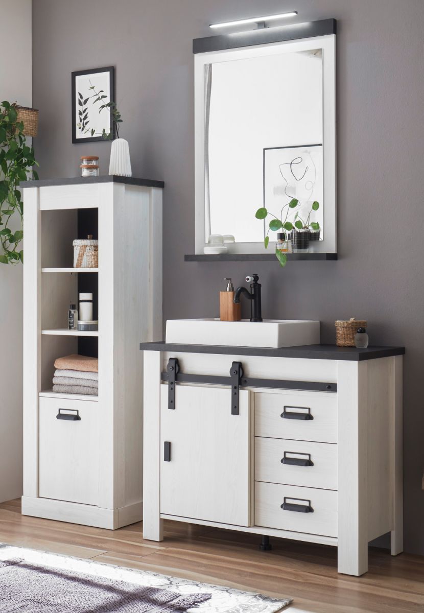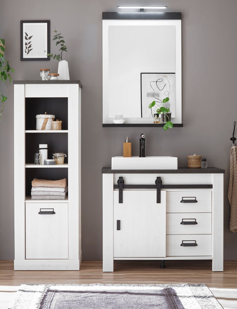 Badmöbel Set Badezimmer komplett mit Waschbecken + Beleuchtung weiß Pinie Stove