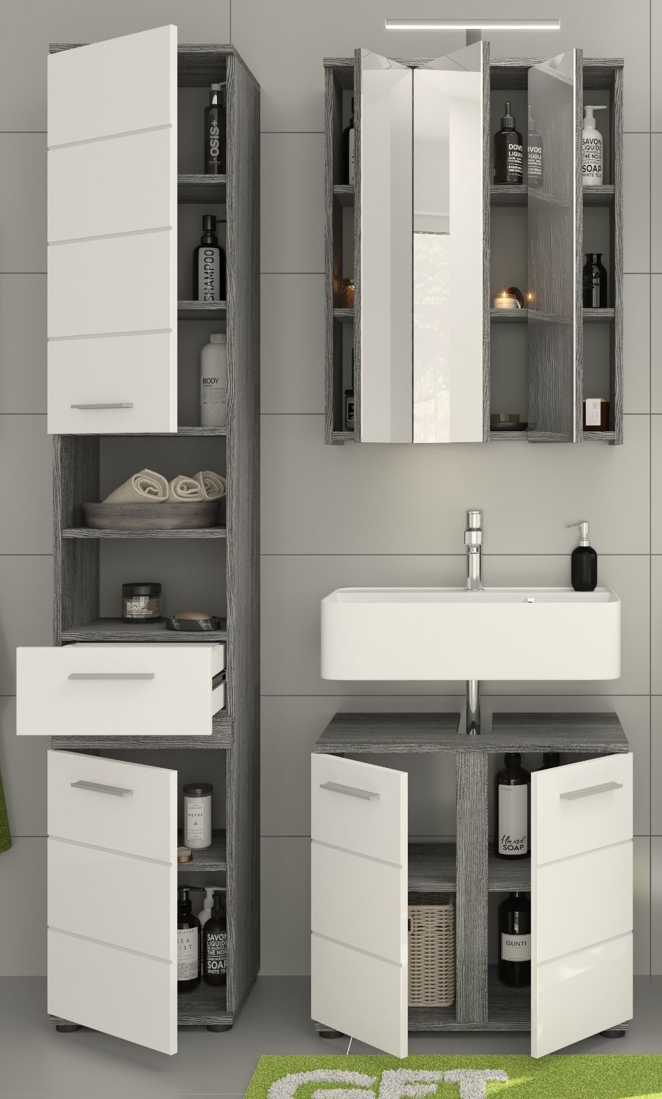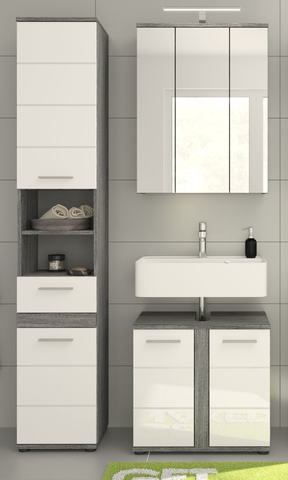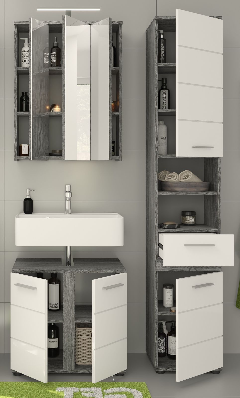 Badmöbel Set Badezimmer Möbel-Set weiß Hochglanz grau 3-teilig Beleuchtung Bailey