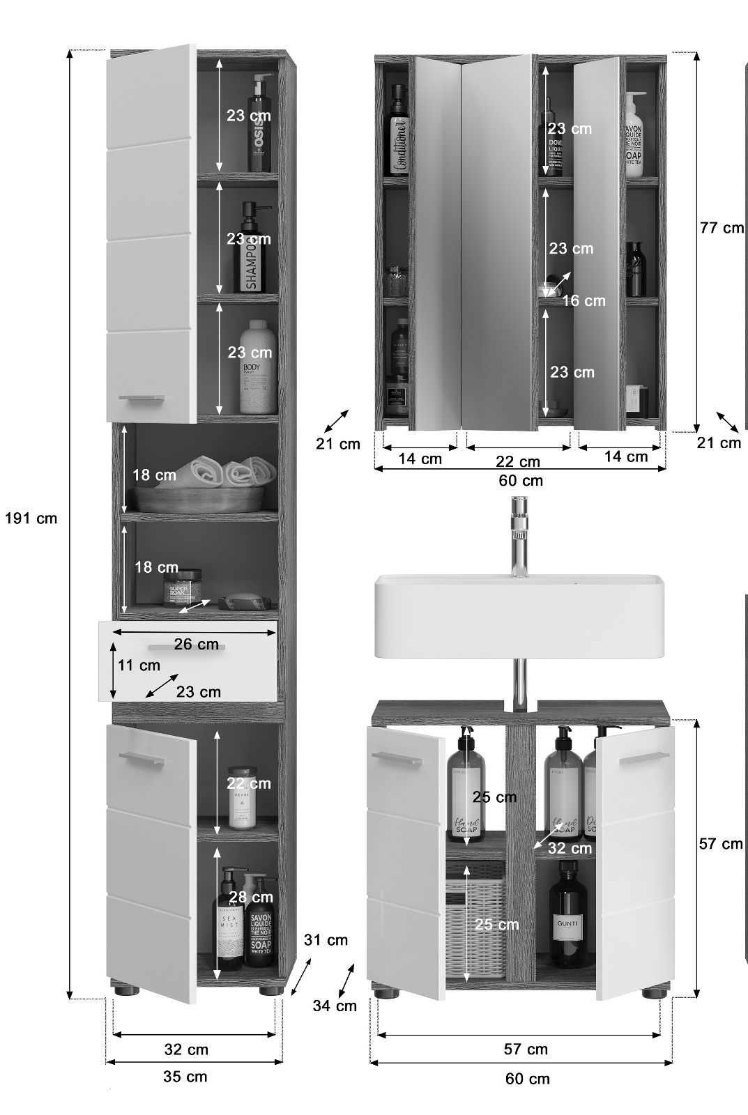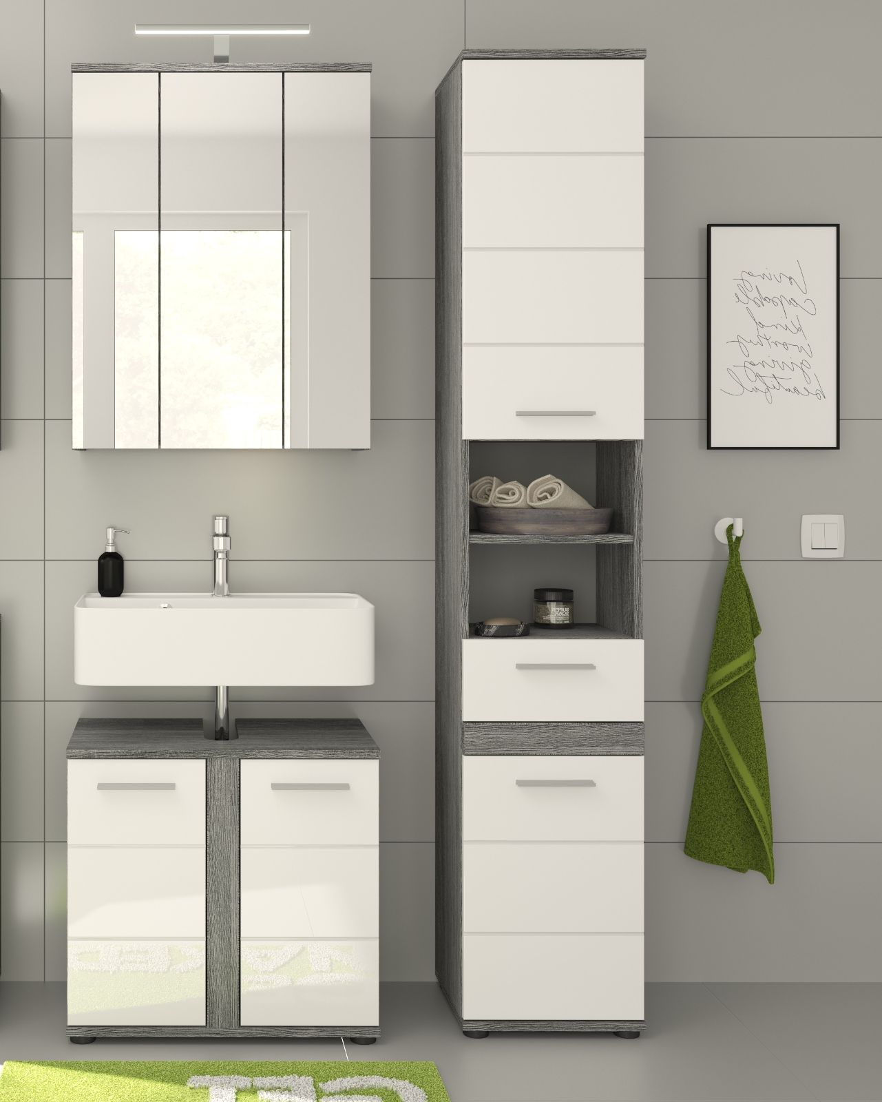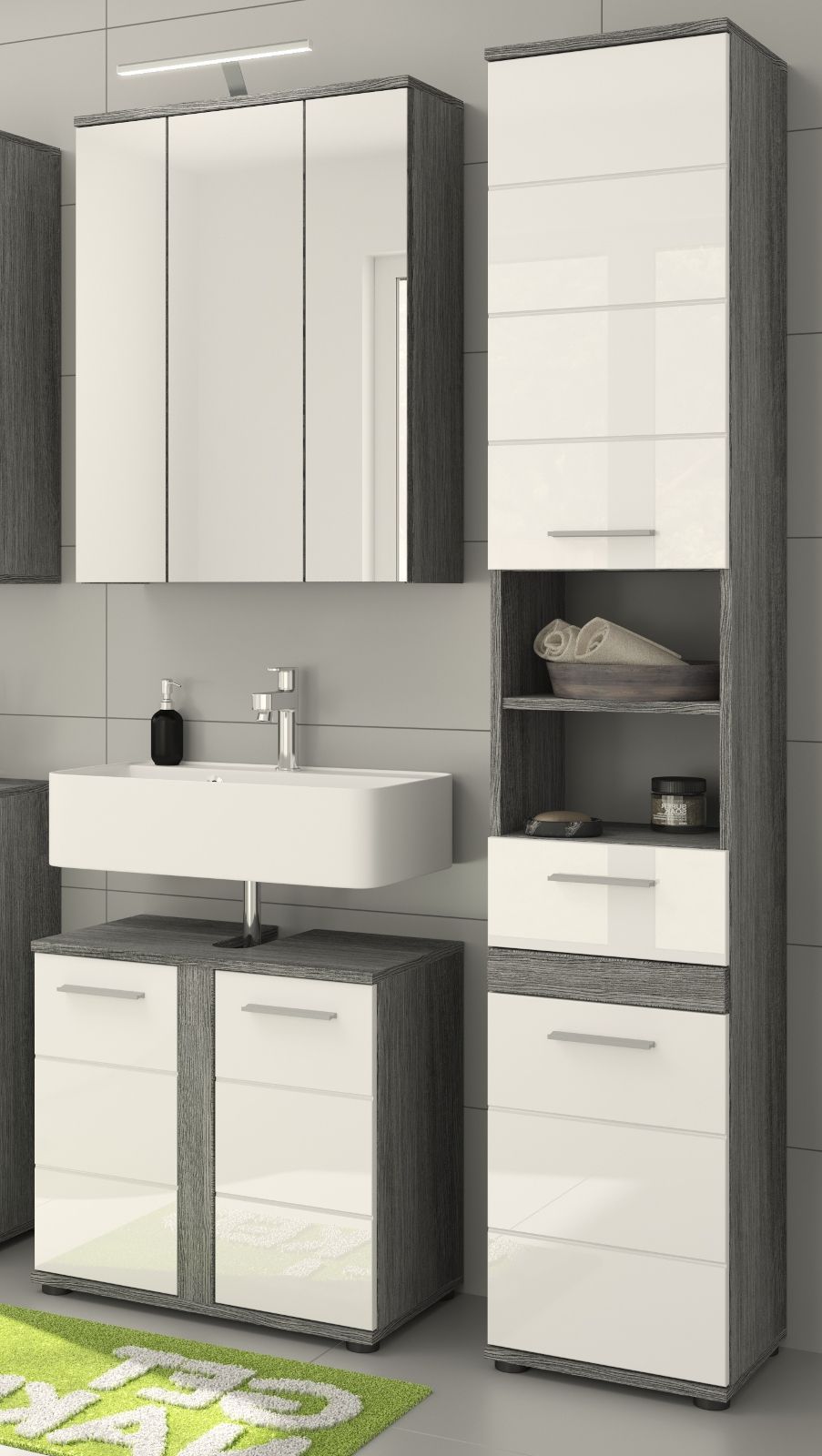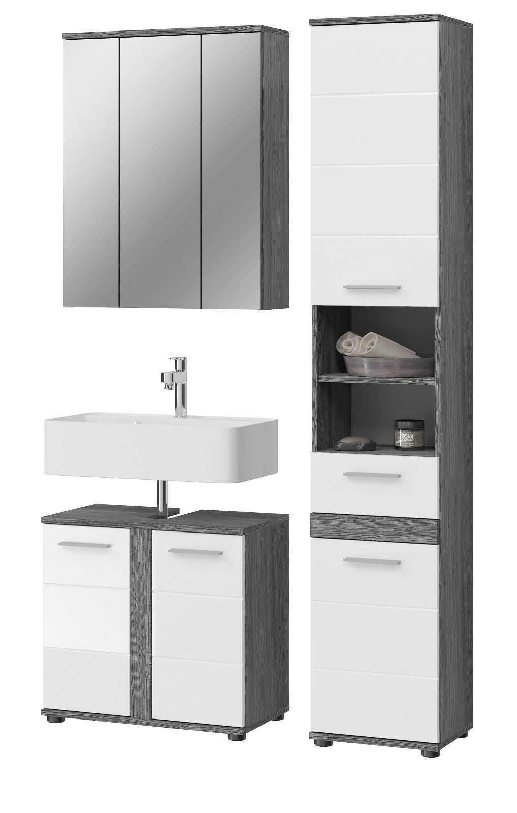 Badmöbel Set Badezimmer Möbel-Set weiß Hochglanz grau 3-teilig Beleuchtung Bailey