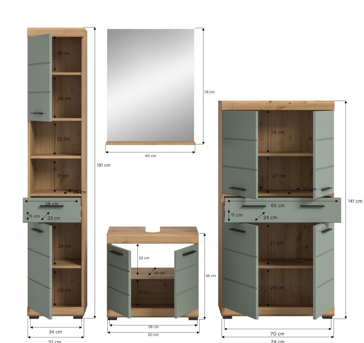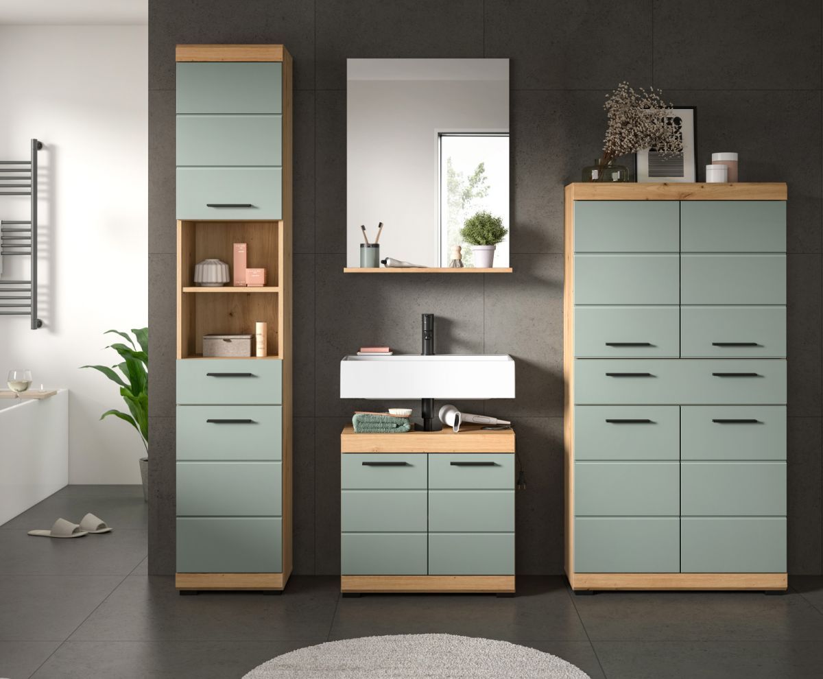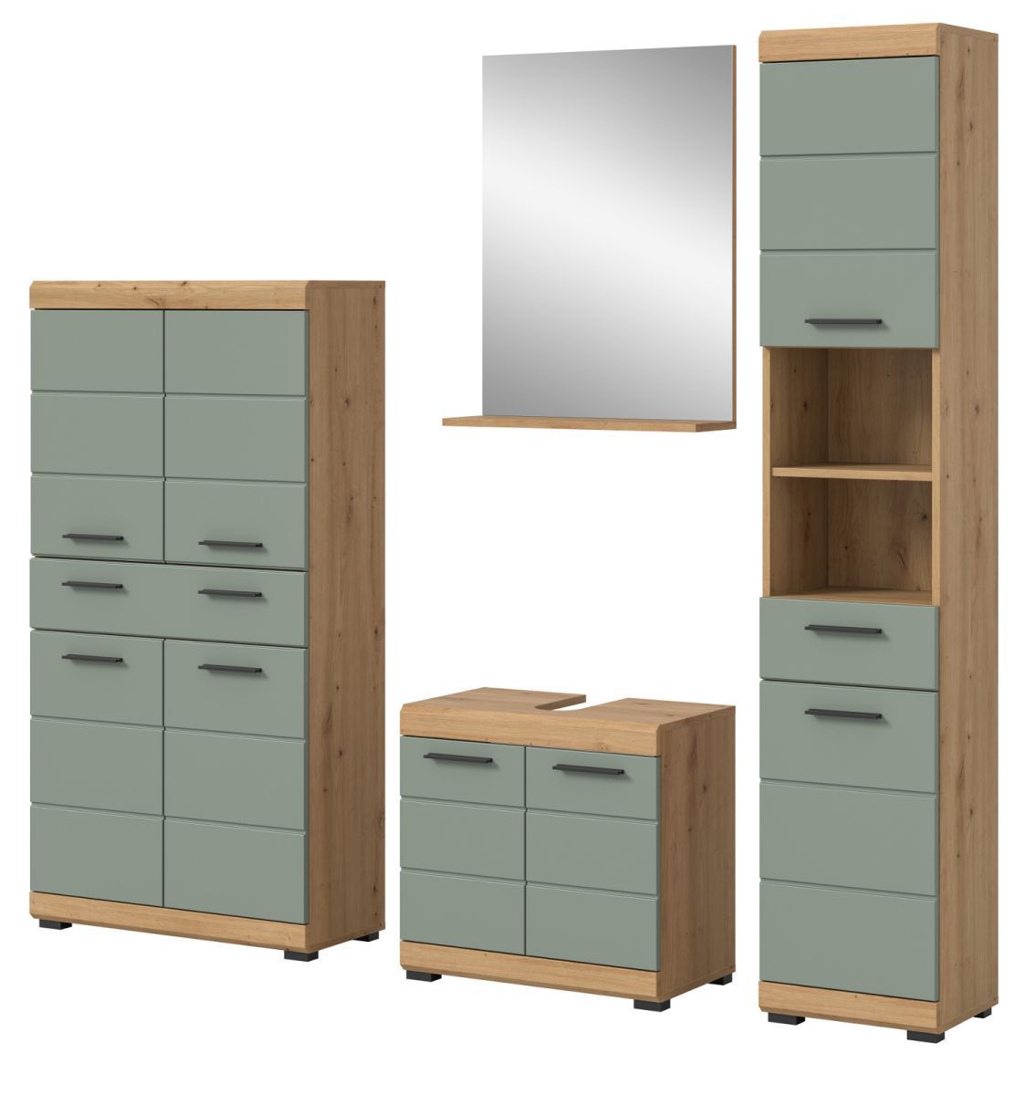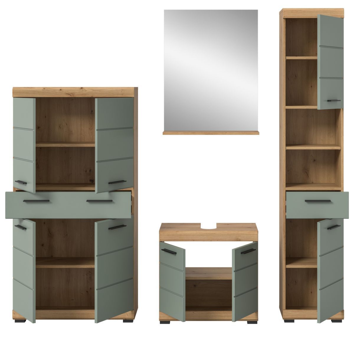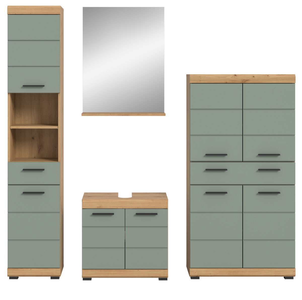 Badmöbel Set Badezimmer Salbei grün Eiche Möbelset 4-tlg mit Midischrank Shawn 200 cm