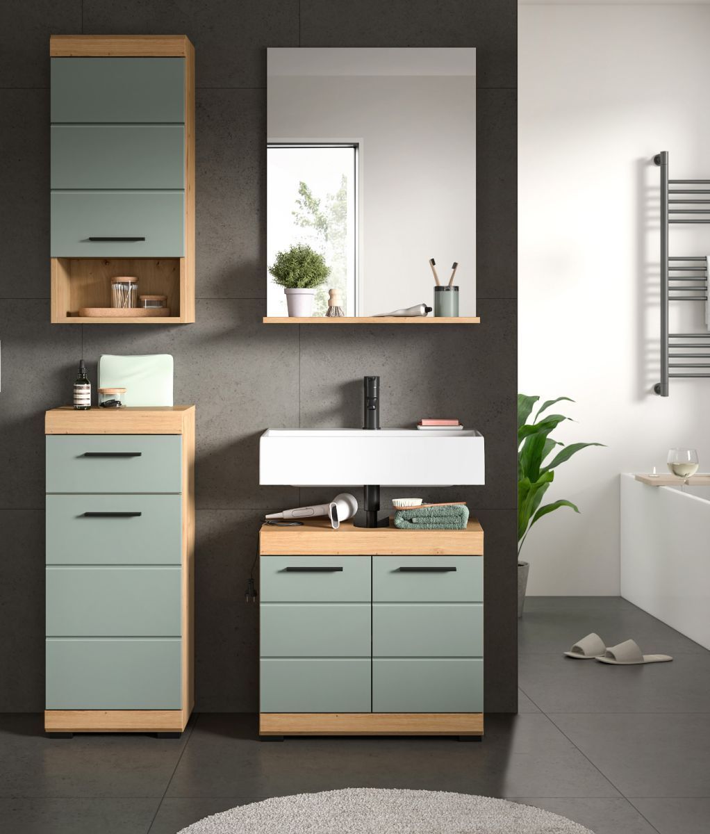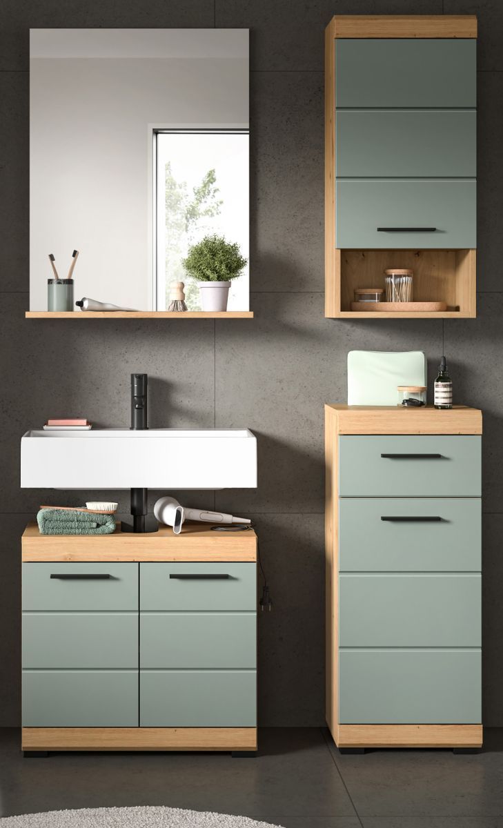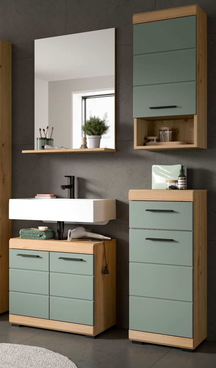 Badmöbel Set Badezimmer Schrankset 4-tlg Salbei grün Eiche Bad Möbelset 112 cm Shawn