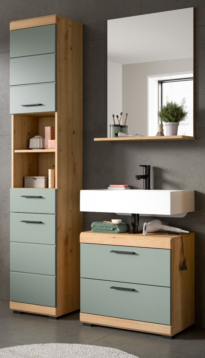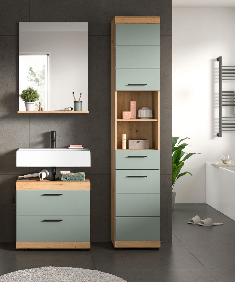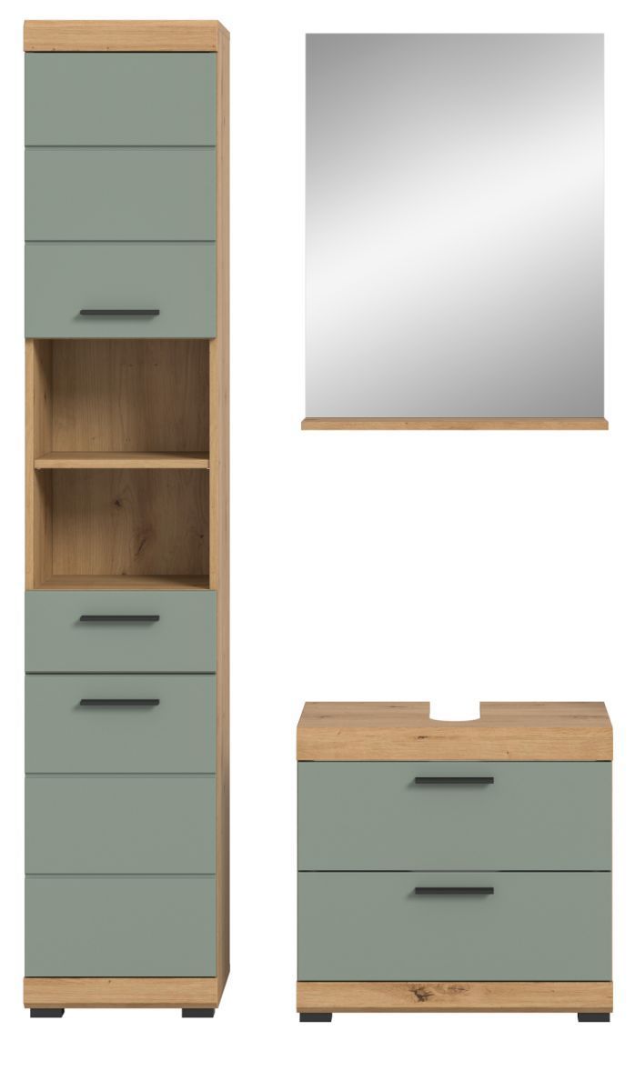 Badmöbel Set Badezimmer Schrankset Hochschrank Salbei grün Eiche Möbel Shawn 112 cm