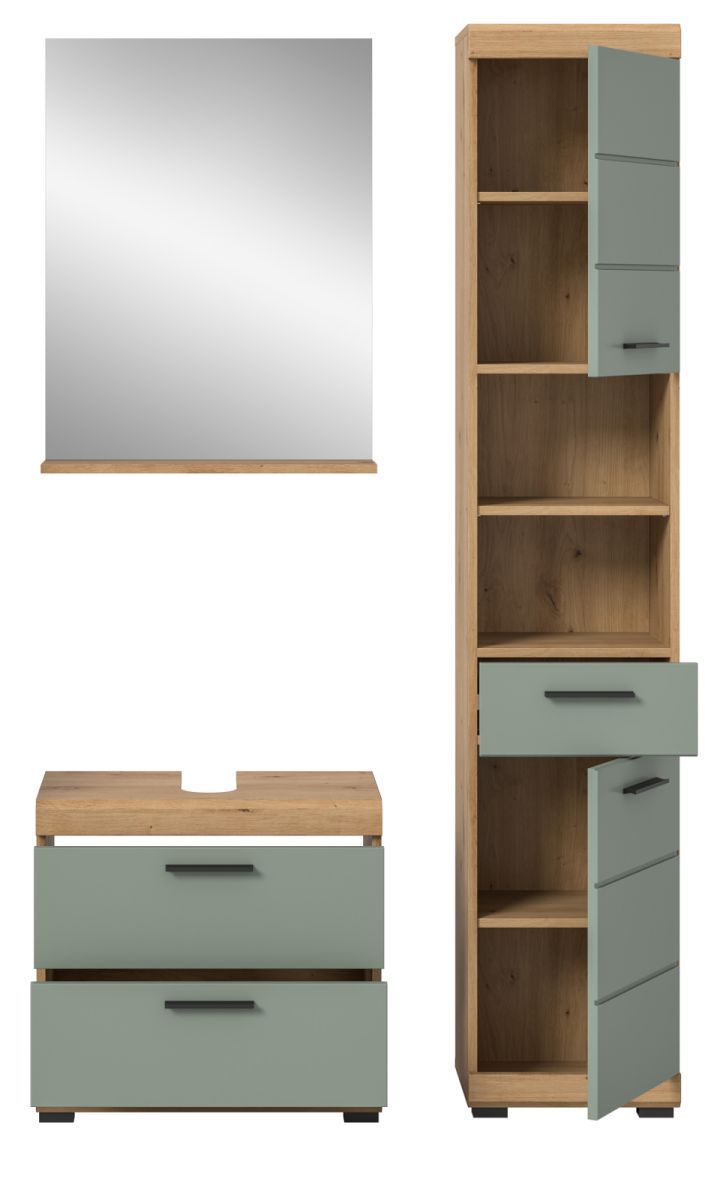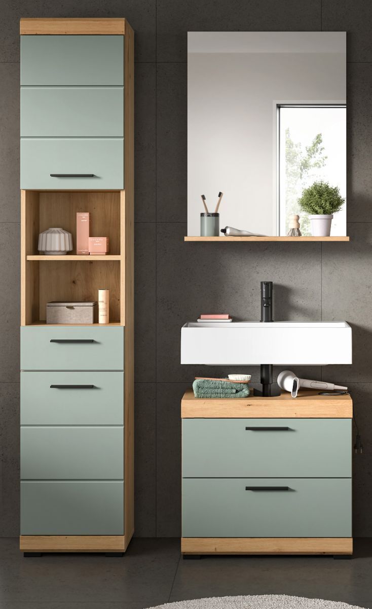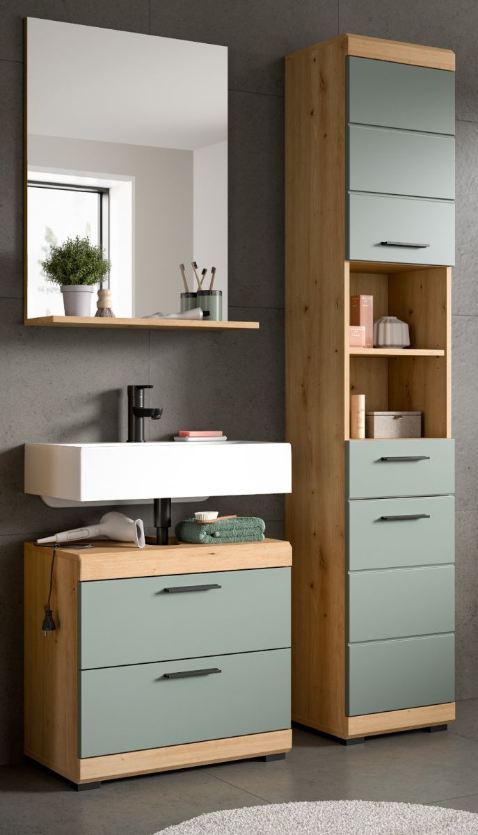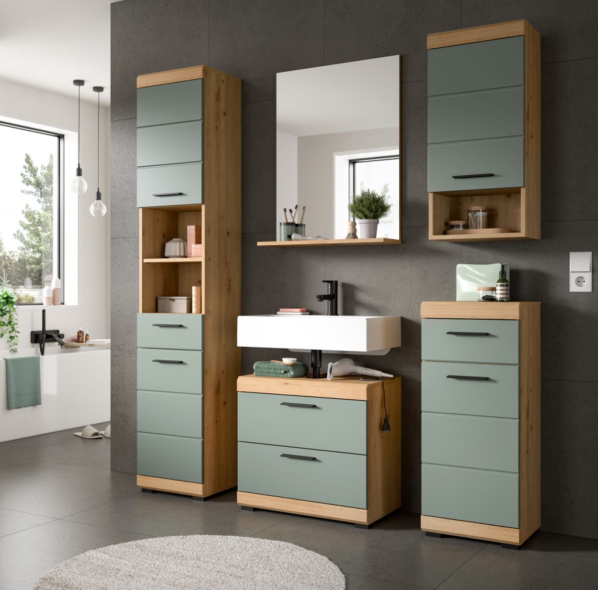 Badmöbel Set Badezimmer Schrankset Hochschrank Salbei grün Eiche Möbel Shawn 112 cm