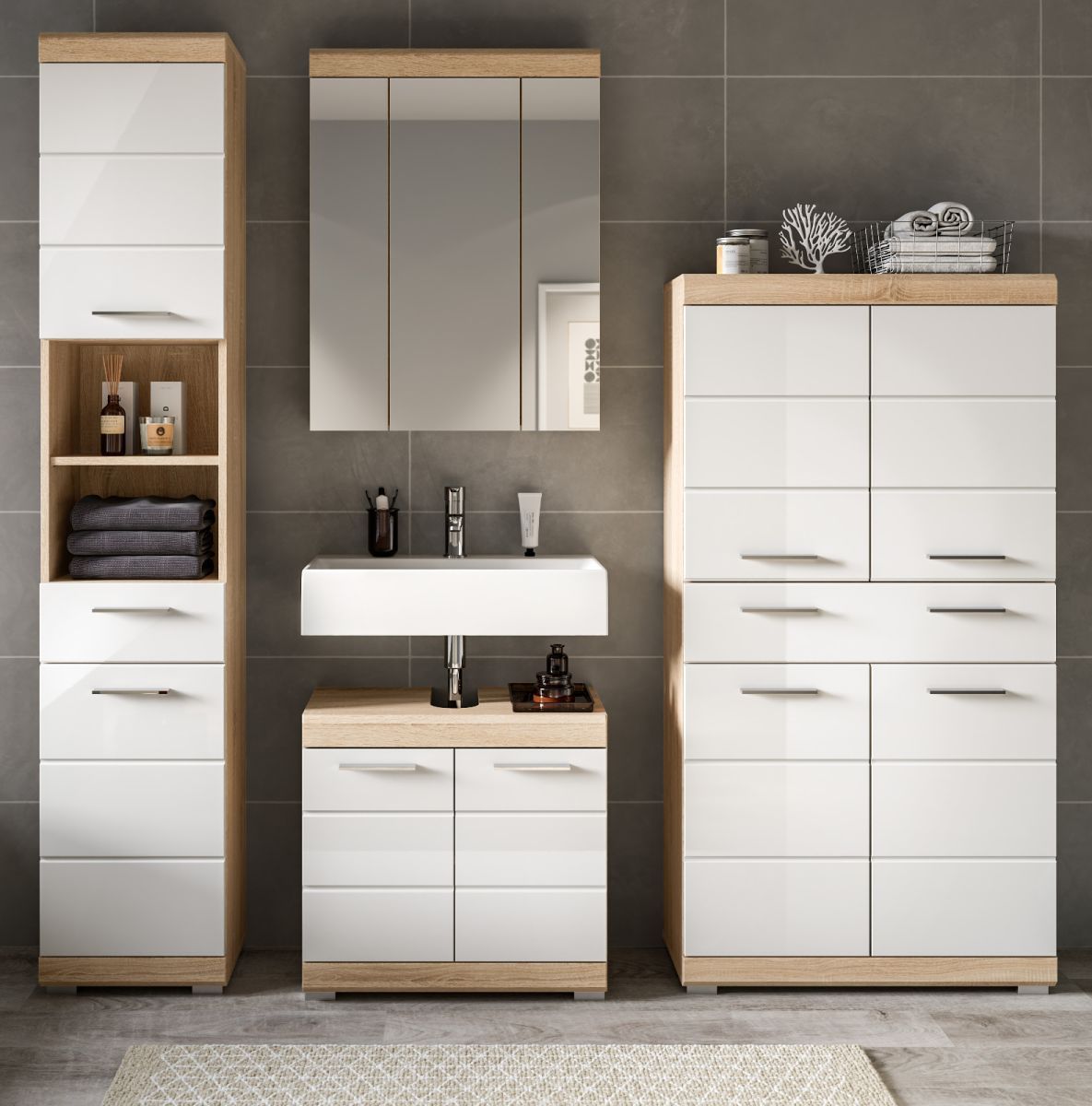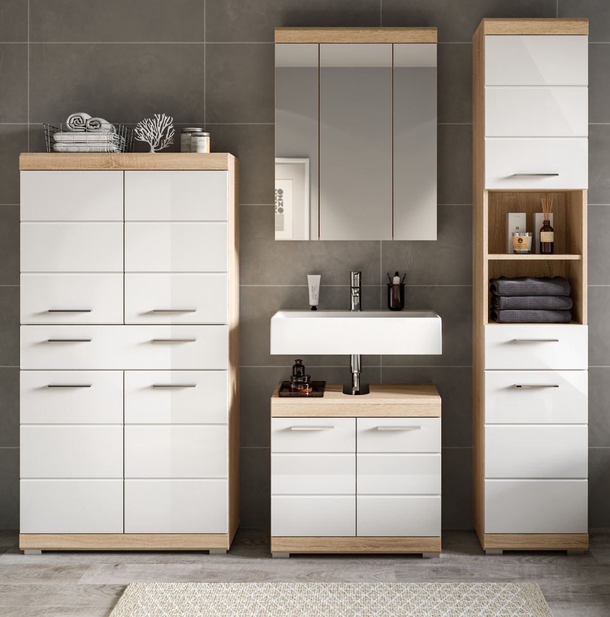 Badmöbel Set Badezimmer weiß Hochglanz Eiche Möbelset 4-tlg mit Midischrank Mambo