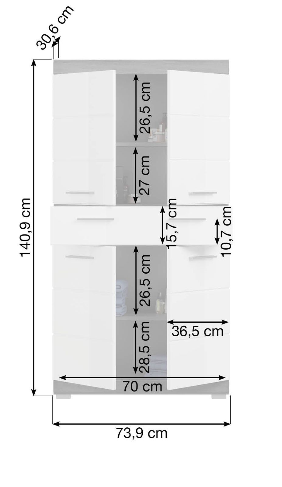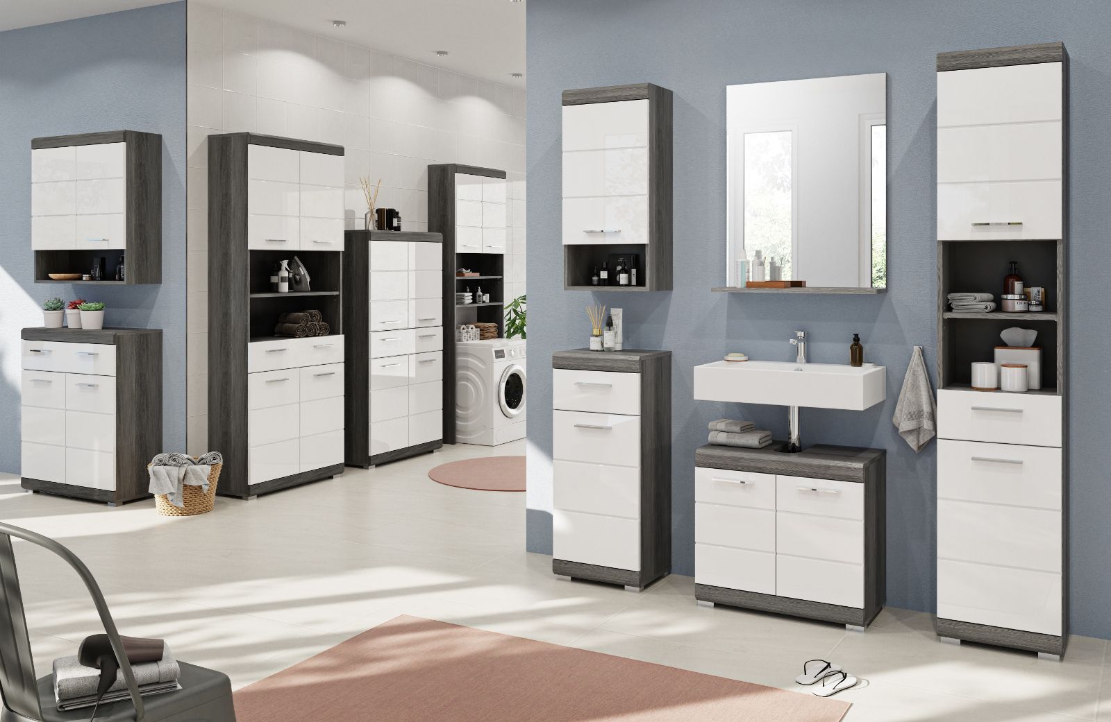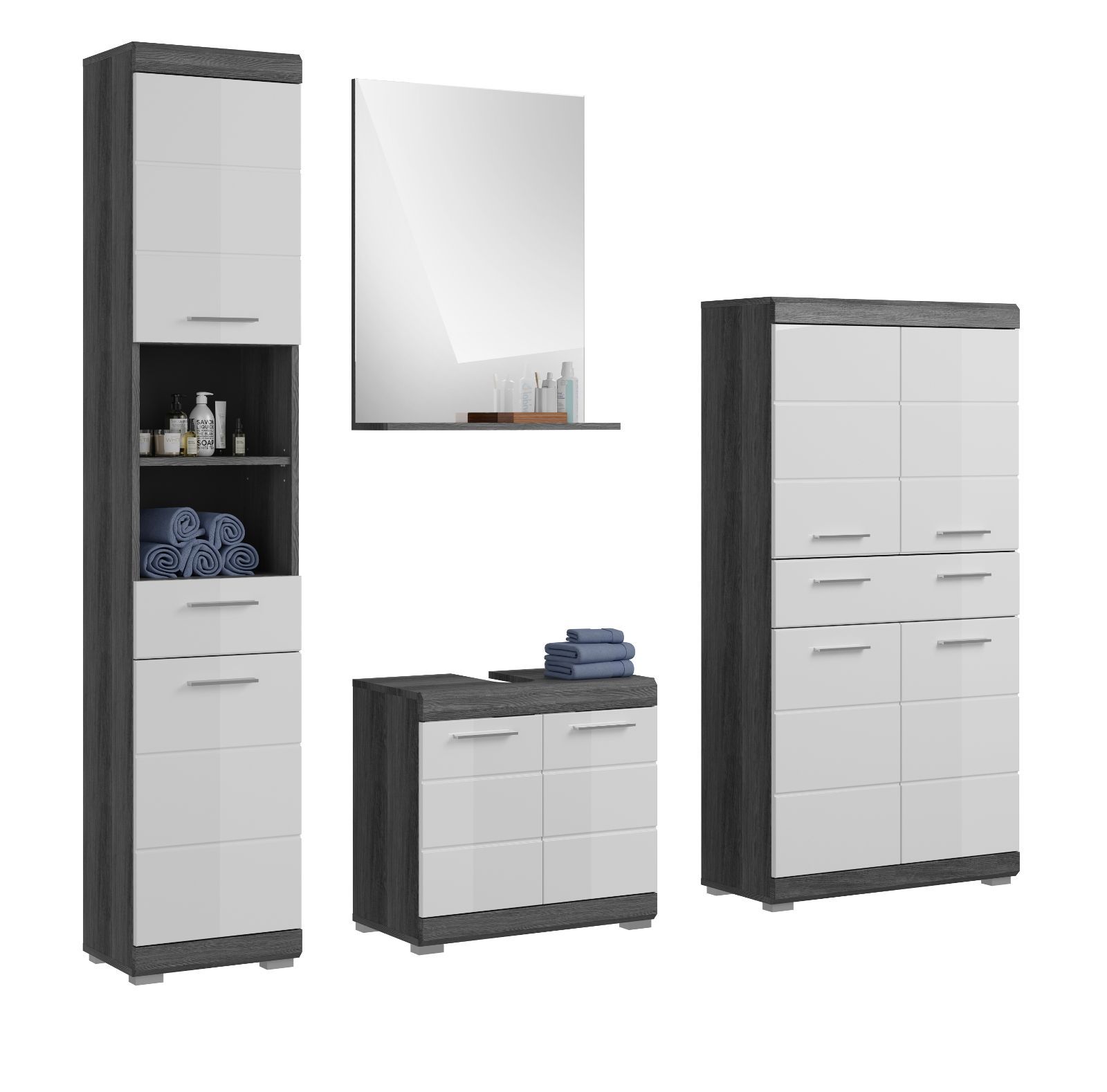 Badmöbel Set Badezimmer weiß Hochglanz grau Möbelset 4-tlg mit Midischrank Shawn