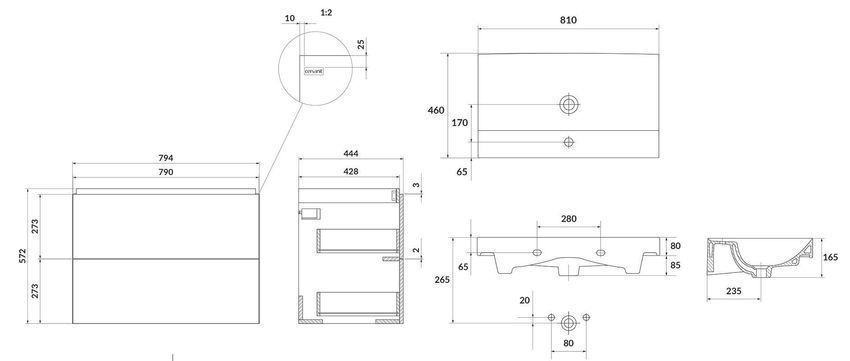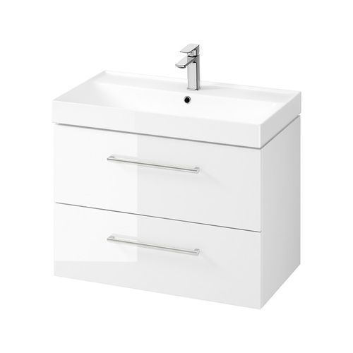 Badmöbel Set Badezimmerschrank mit Keramikwaschbecken LARGA 80 Weiß, Silber Griffe