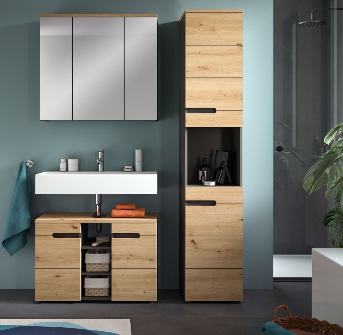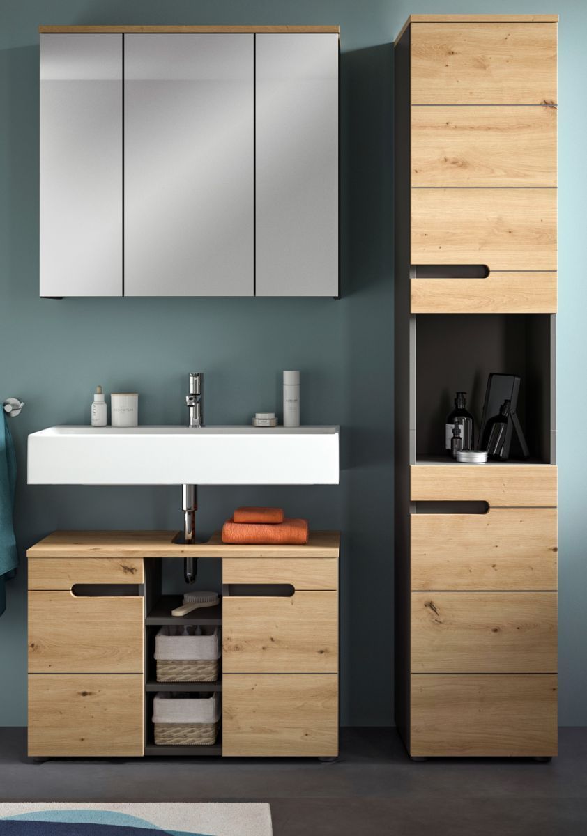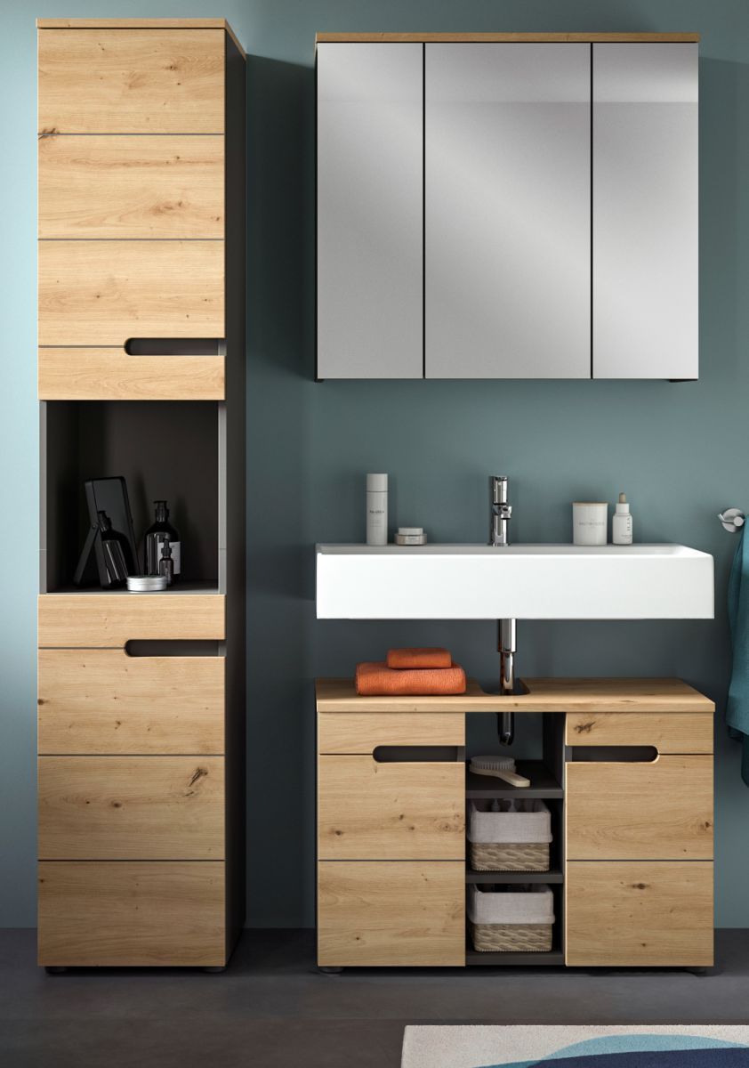 Badmöbel Set Eiche grau Badezimmer Möbel 3-teilig mit Hochschrank Cooper Soft-Close
