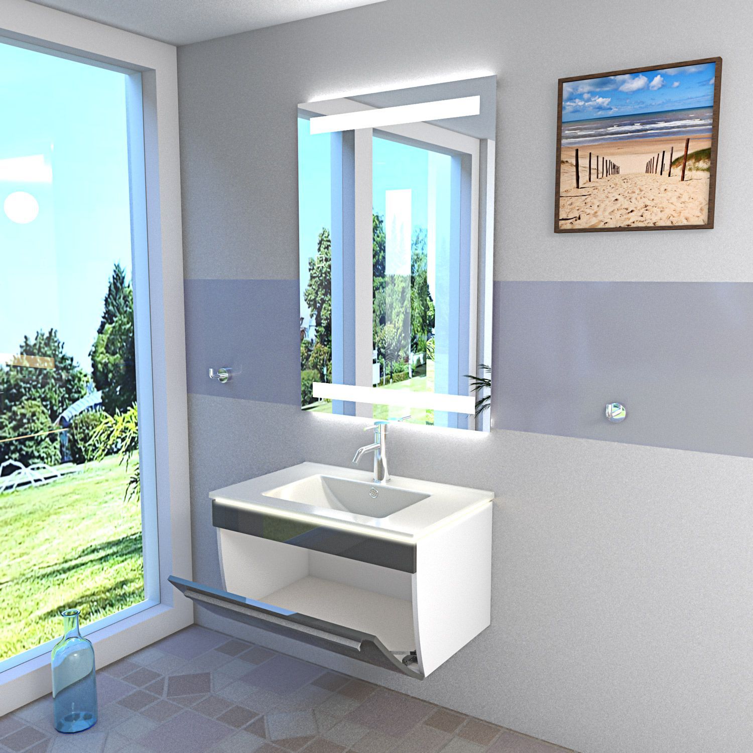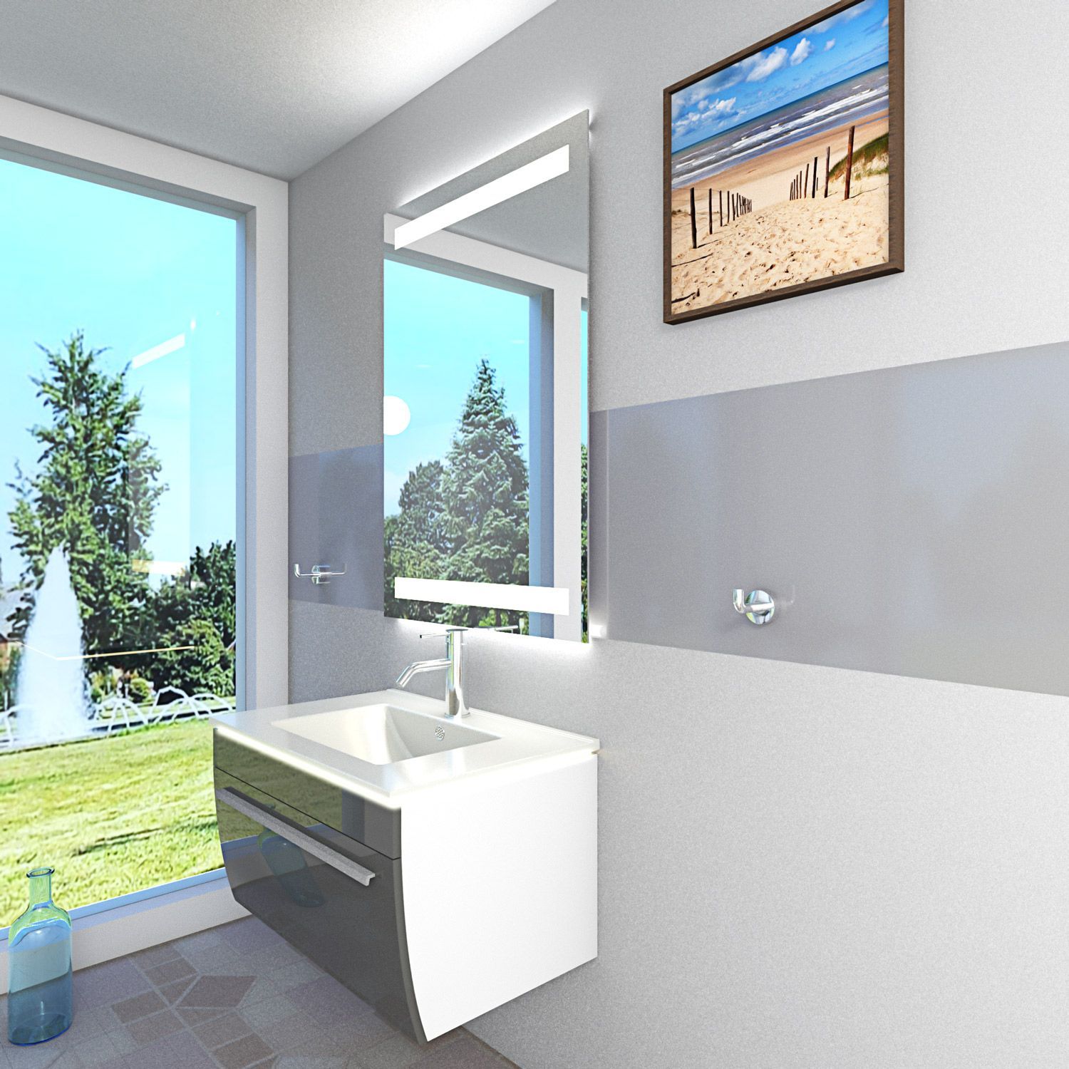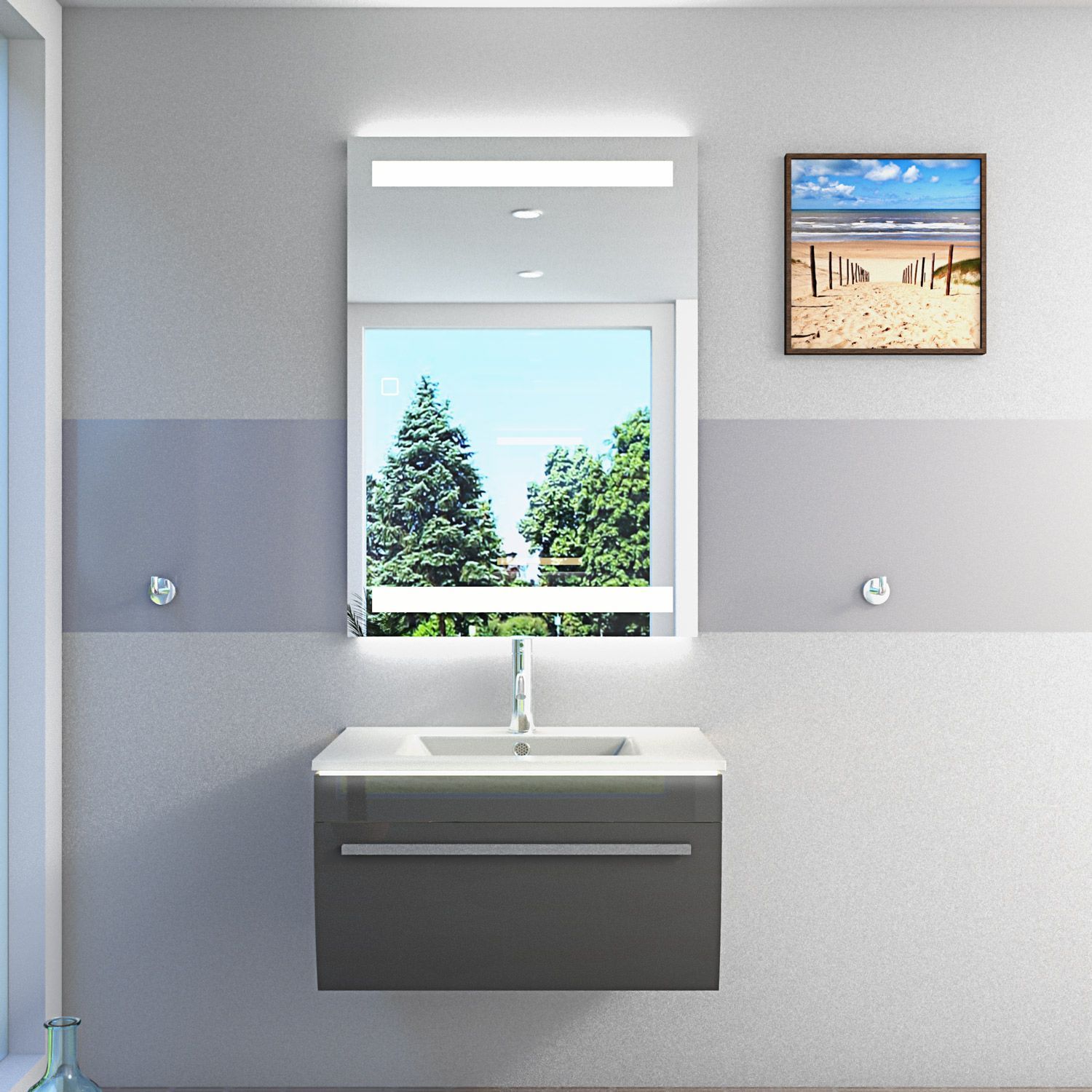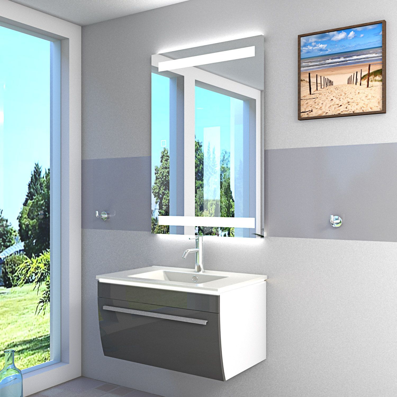 Badmöbel Set Gently 3 V1 Weiß/Grau MDF Waschtisch 70cm mit Leuchtspiegel LSP09