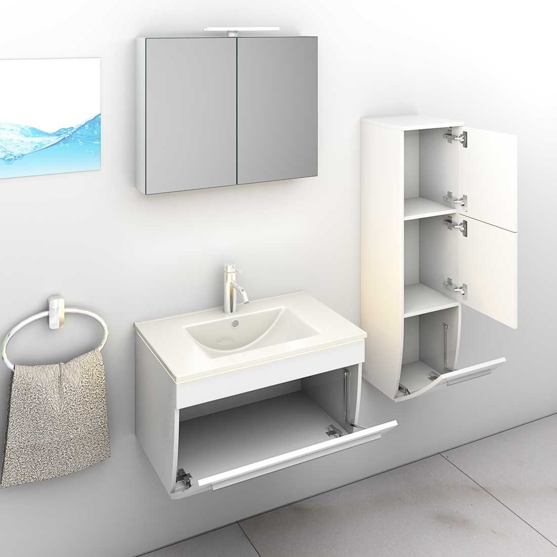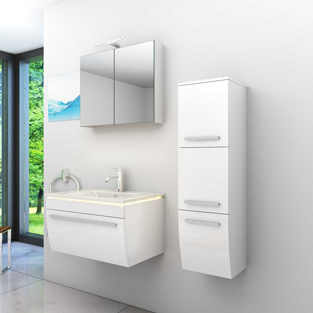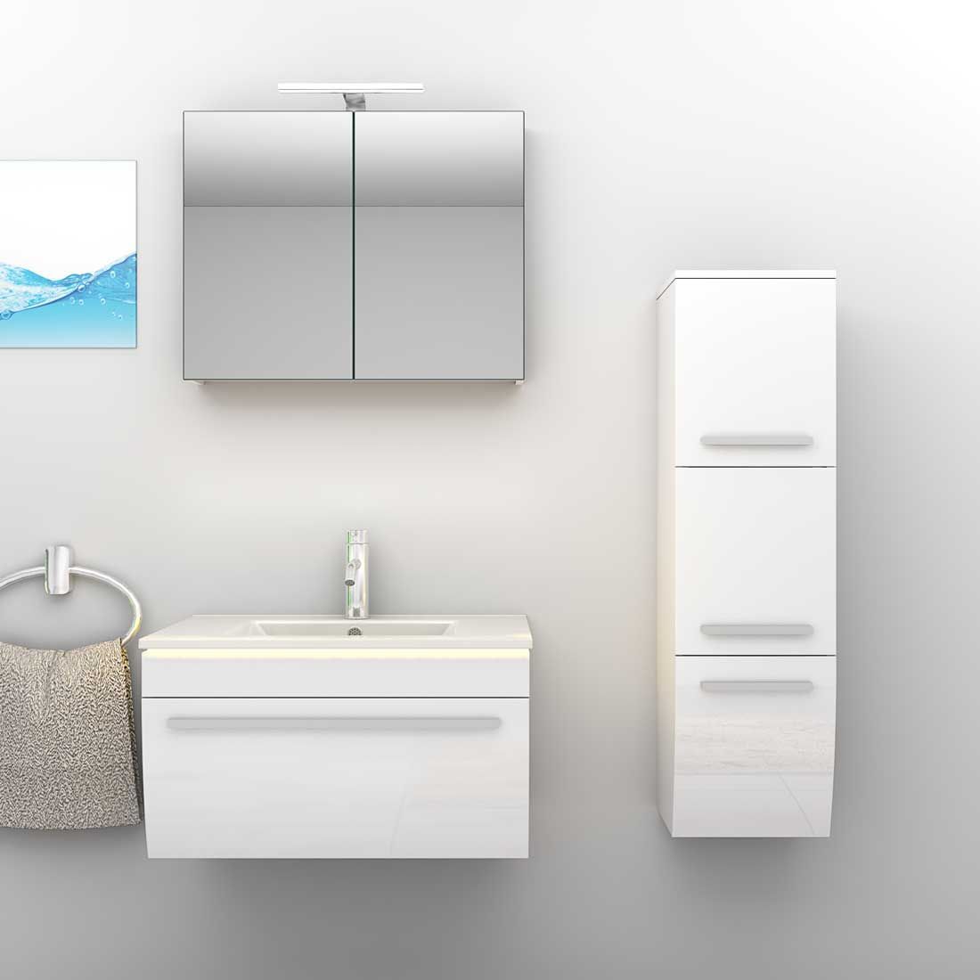 Badmöbel Set Gently 3 V2-R Weiß Badezimmermöbel Badspiegel Waschtisch 80 cm