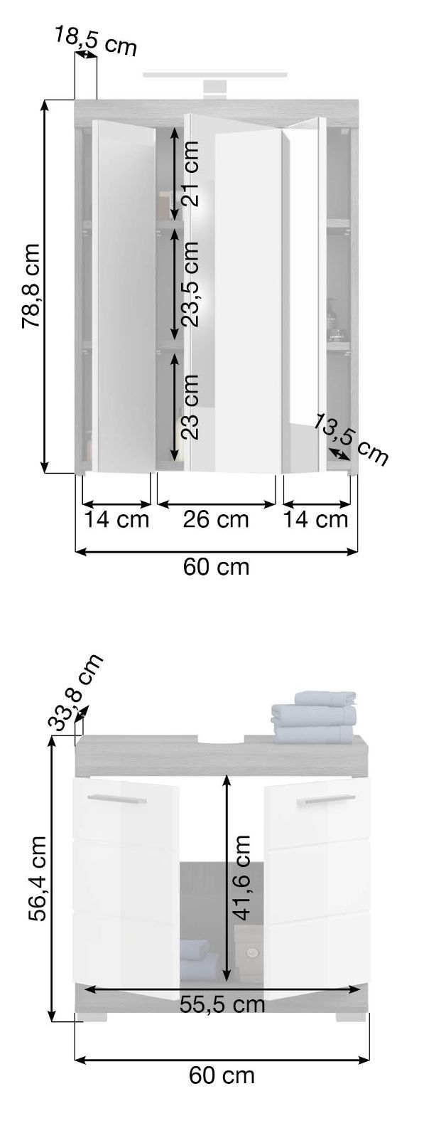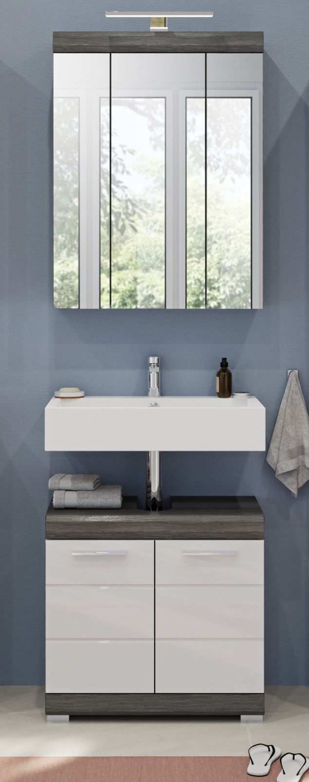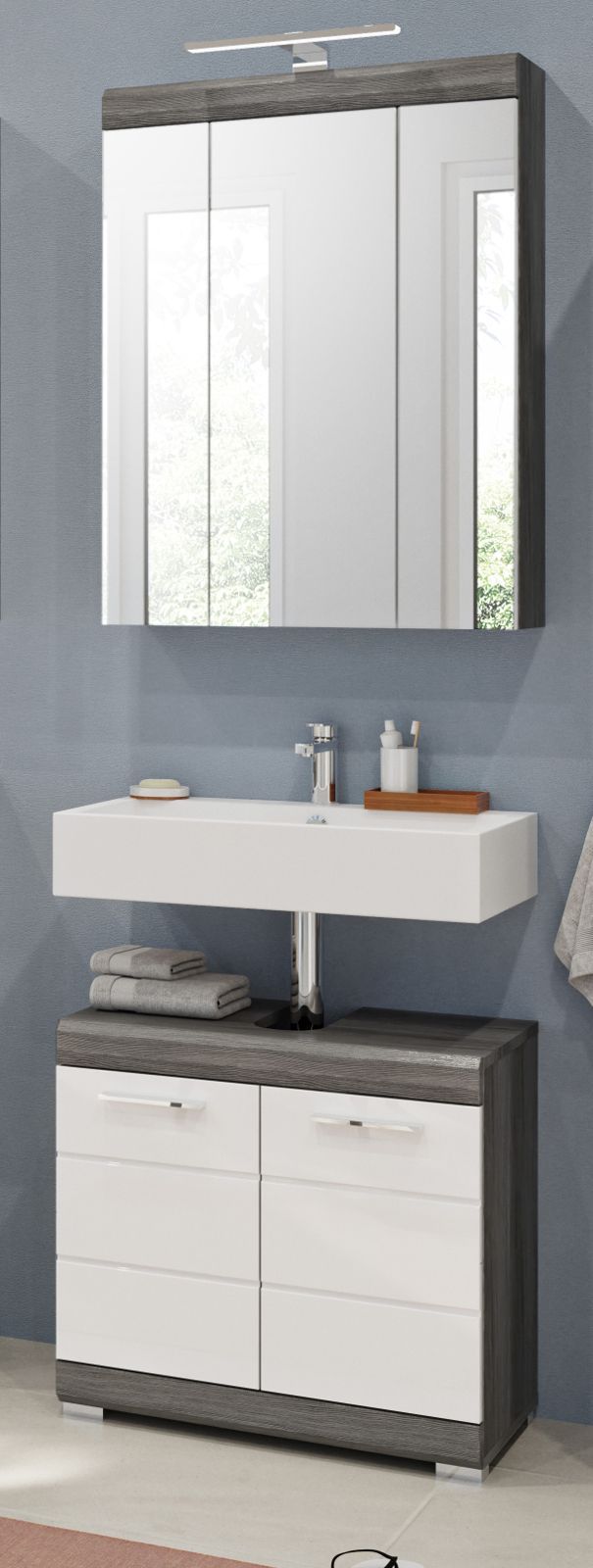Badmöbel Set in weiß Hochglanz grau Waschbeckenunterschrank Spiegelschrank Shawn