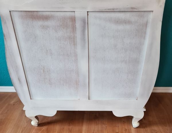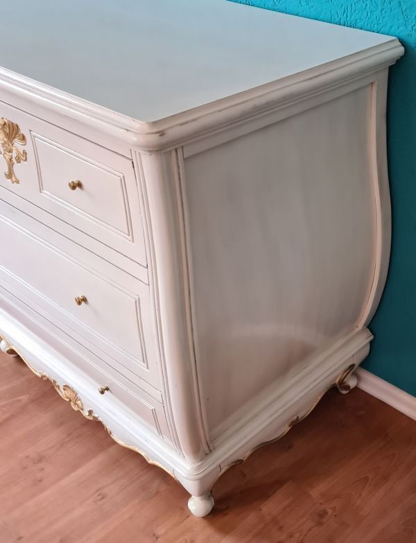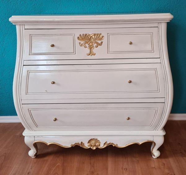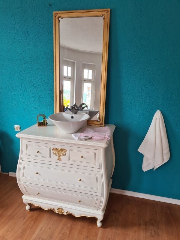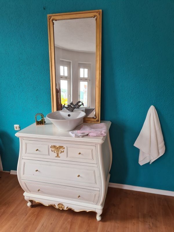 Badmöbel-Set bestehend aus eine Kommode Unterschrank, Spiegel und Waschtisch. Sehr dekorativ und praktisch ist diese bauchige Kommode mit zwei Schubfächern. Sie wurde aus Mahagoni-Holz und im antikem Weiß-Goldton gehalten. Die Seitenteile sind nicht aus Massivholz gefertigt. Der Spiegel ist ebenfall