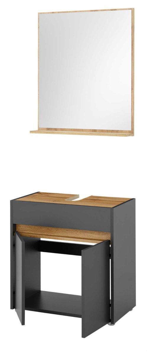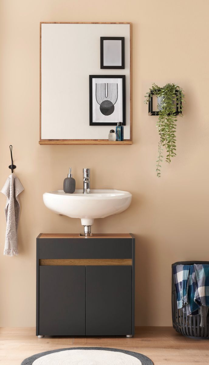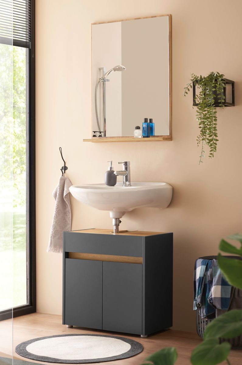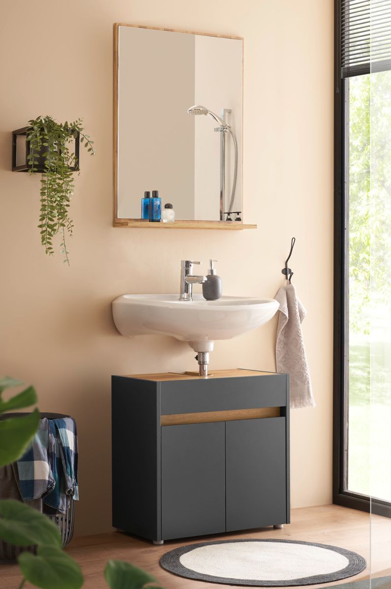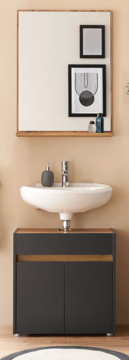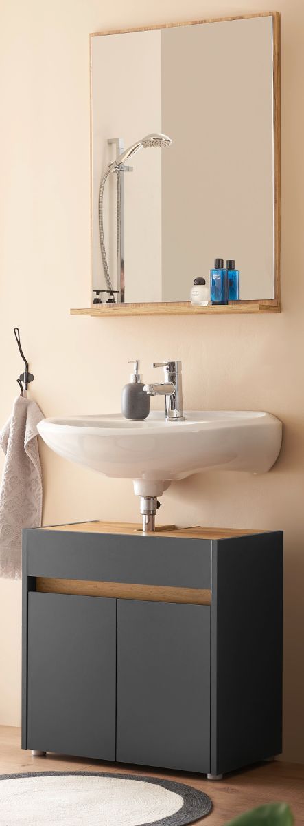 Badmöbel Set mit Waschbeckenunterschrank Badspiegel 60 cm grau und Eiche Center