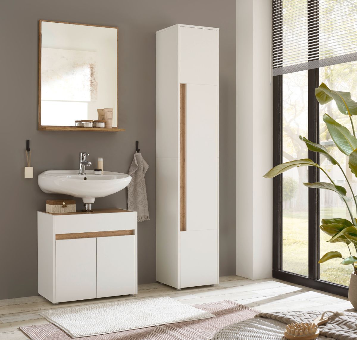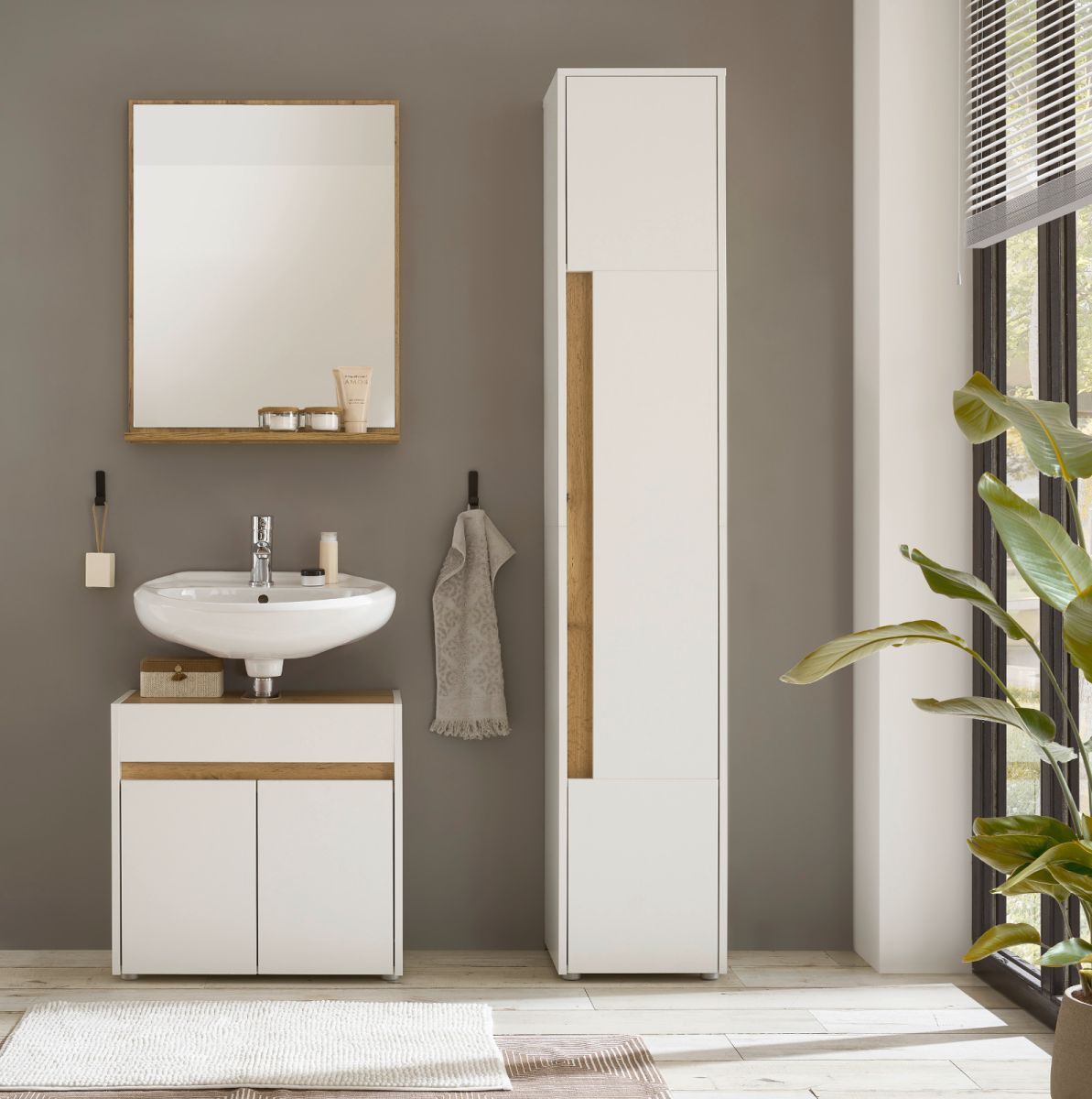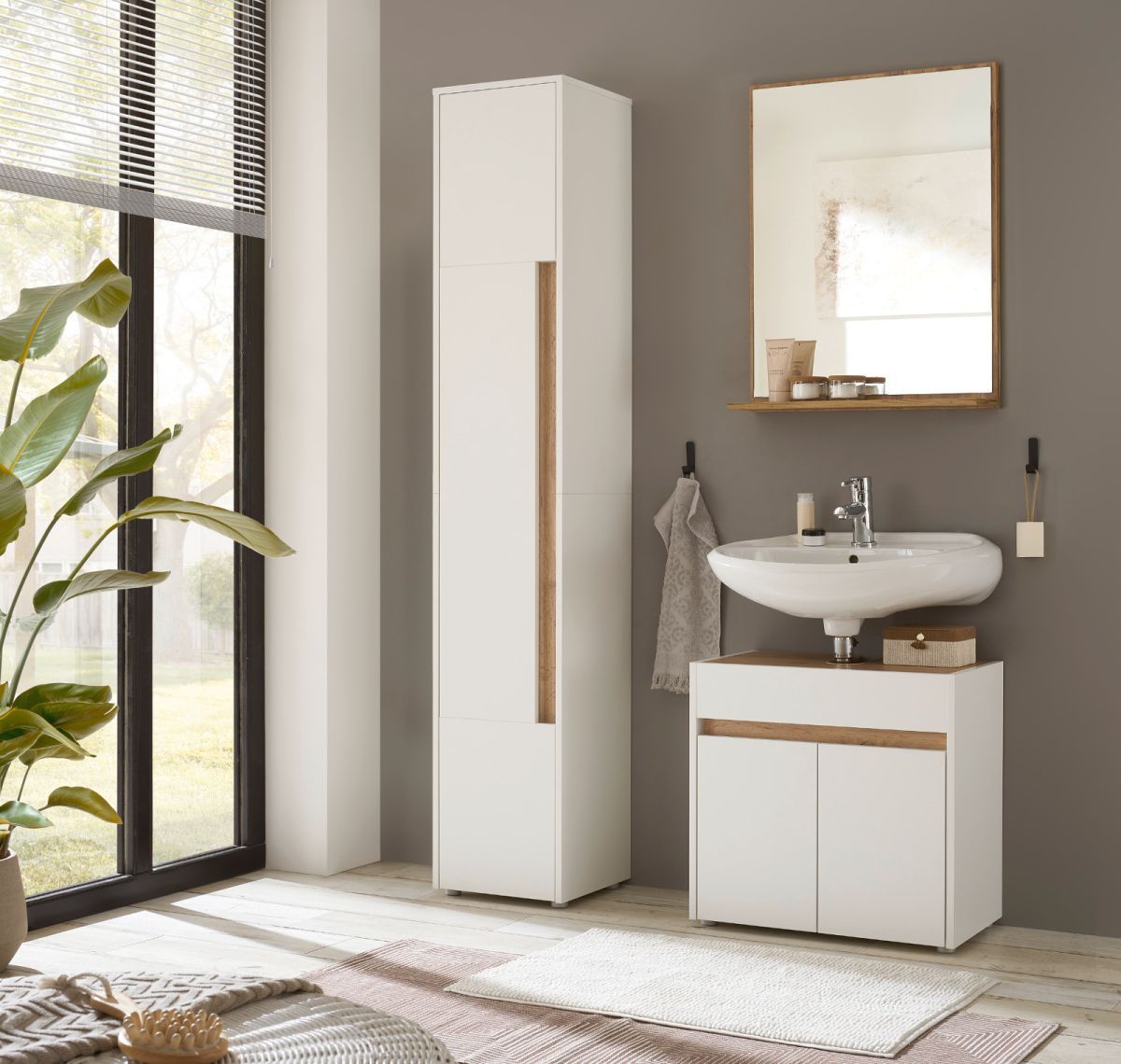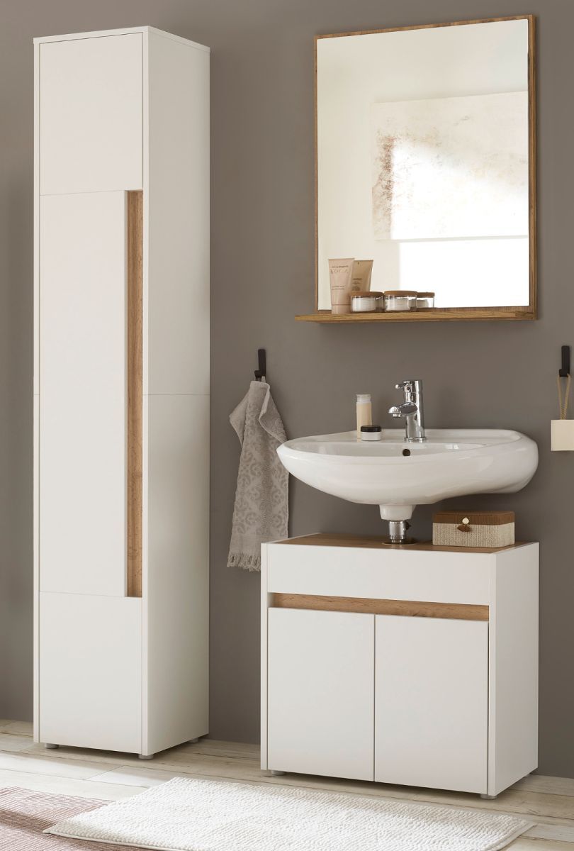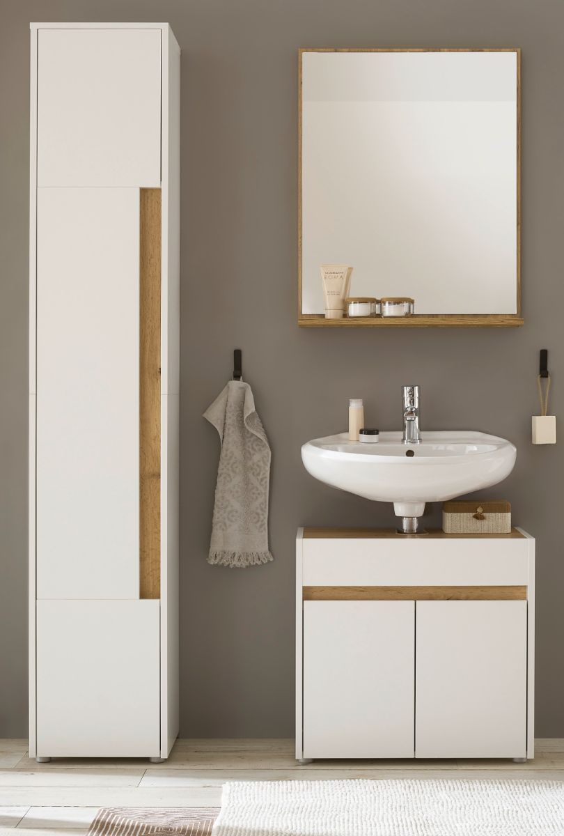 Badmöbel Set mit Waschbeckenunterschrank Hochschrank Spiegel in weiß und Eiche Center
