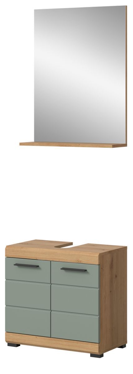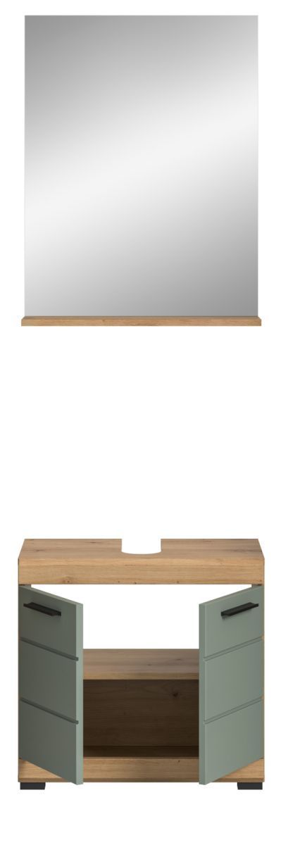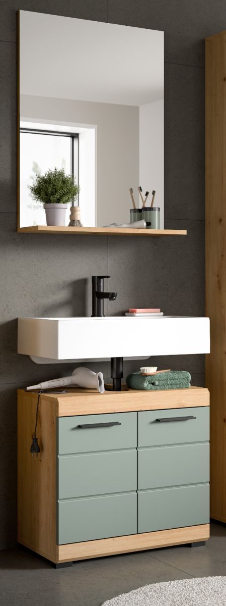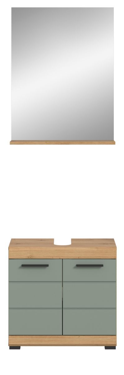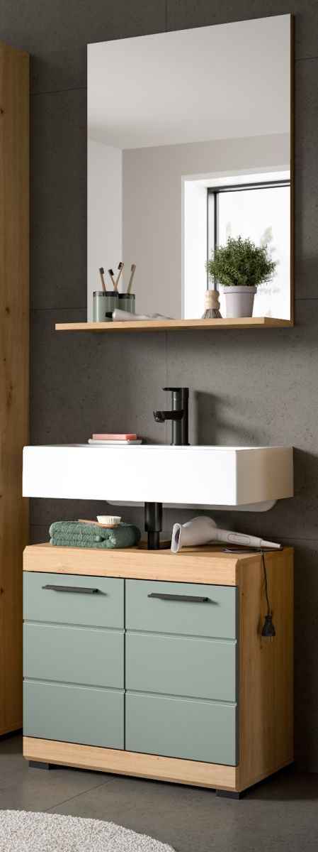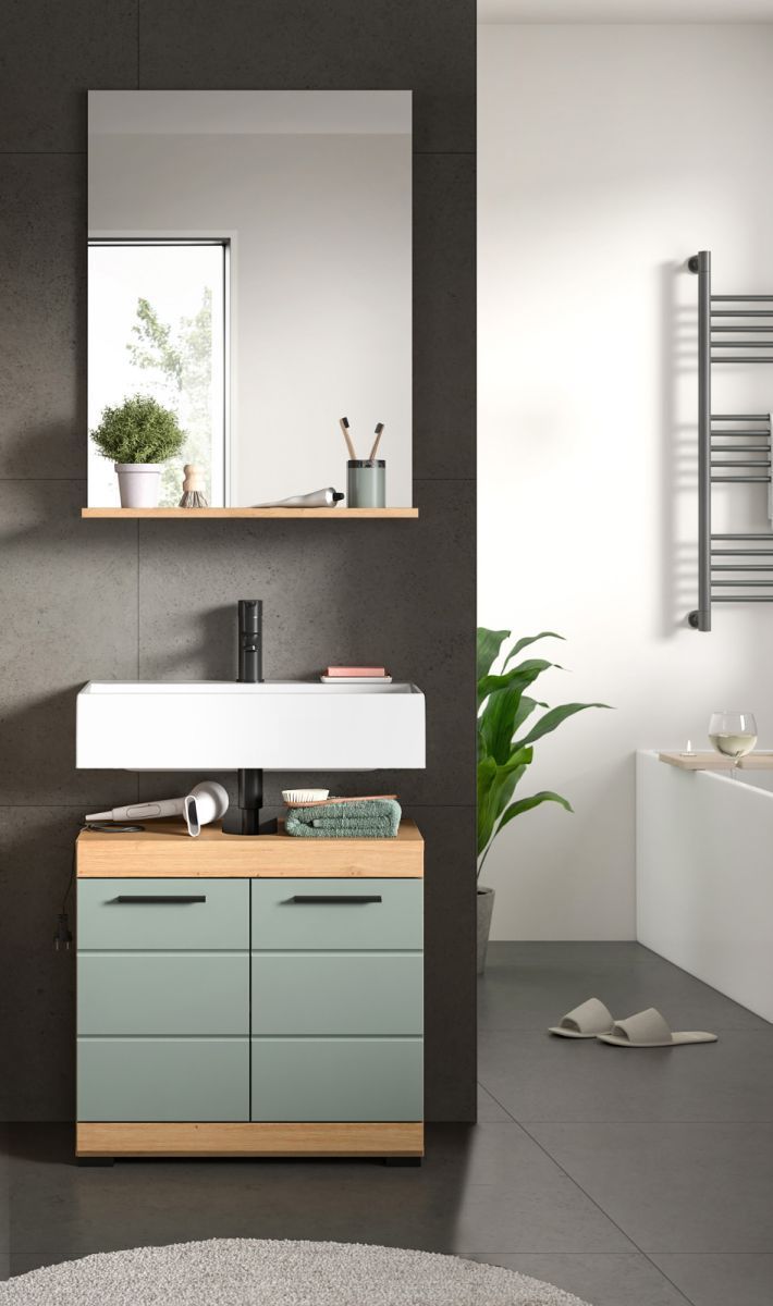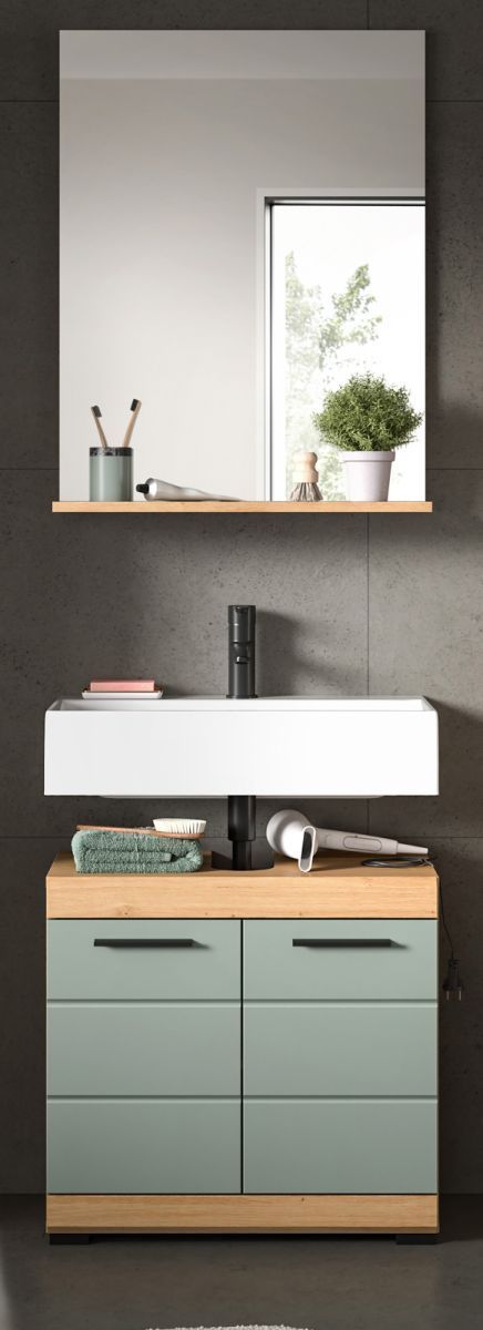 Badmöbel Set mit Waschbeckenunterschrank Spiegel Salbei grün Eiche 60 cm Bad Shawn