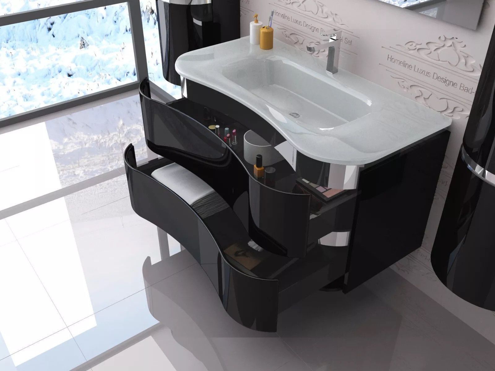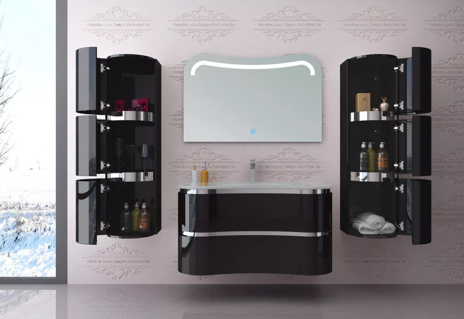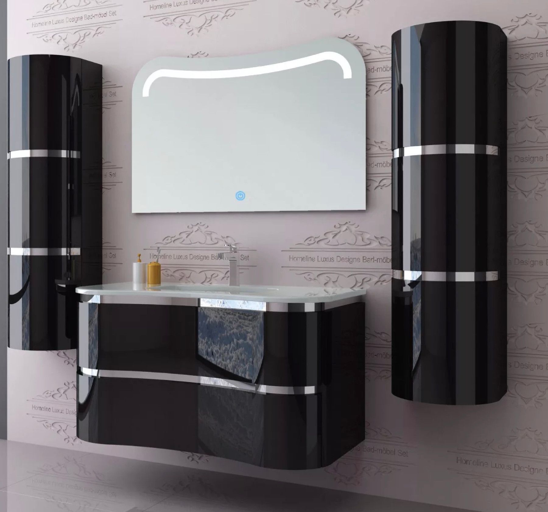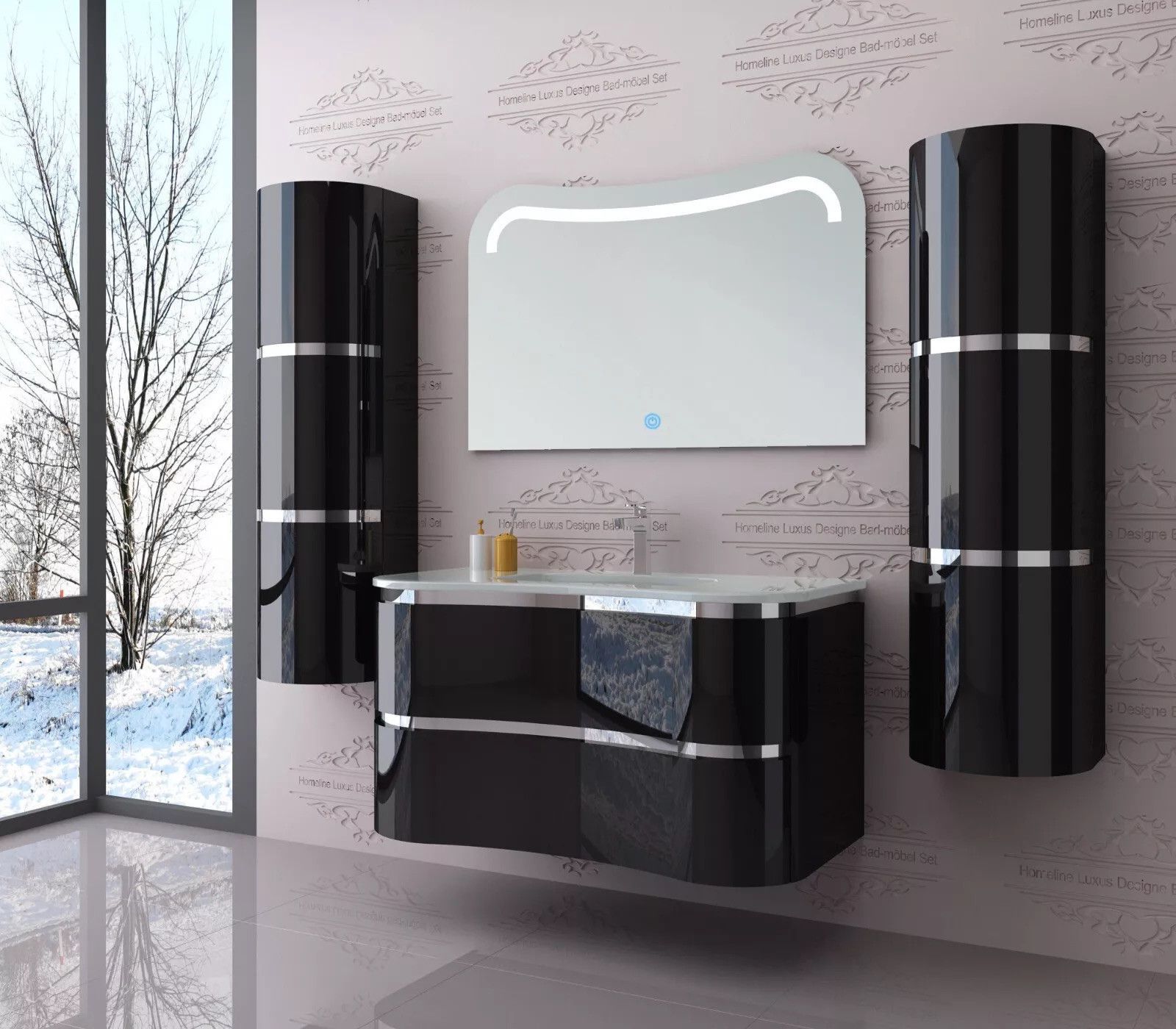 Badmöbel Set Schwarz Lackiert Hochglanz Badezimmermöbel 90 cm Lady Bad mit LED Tauch