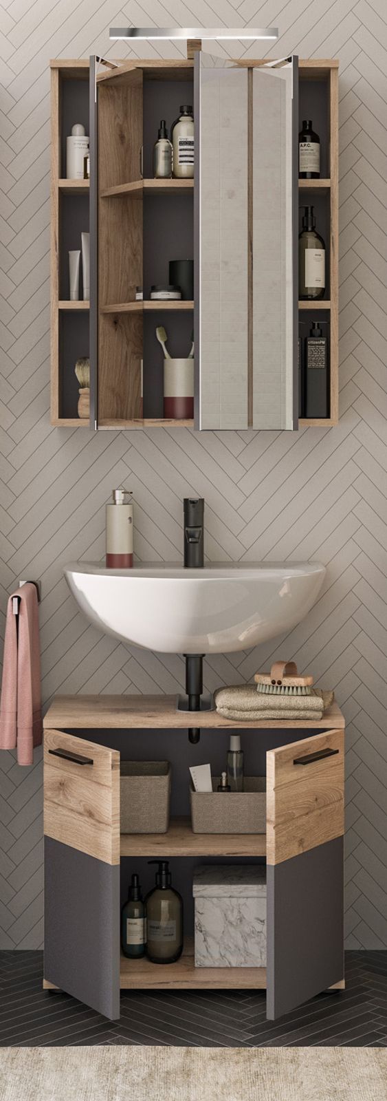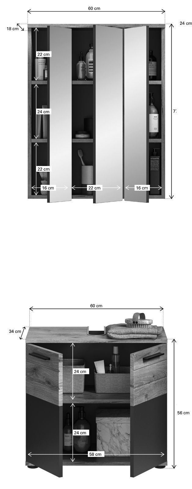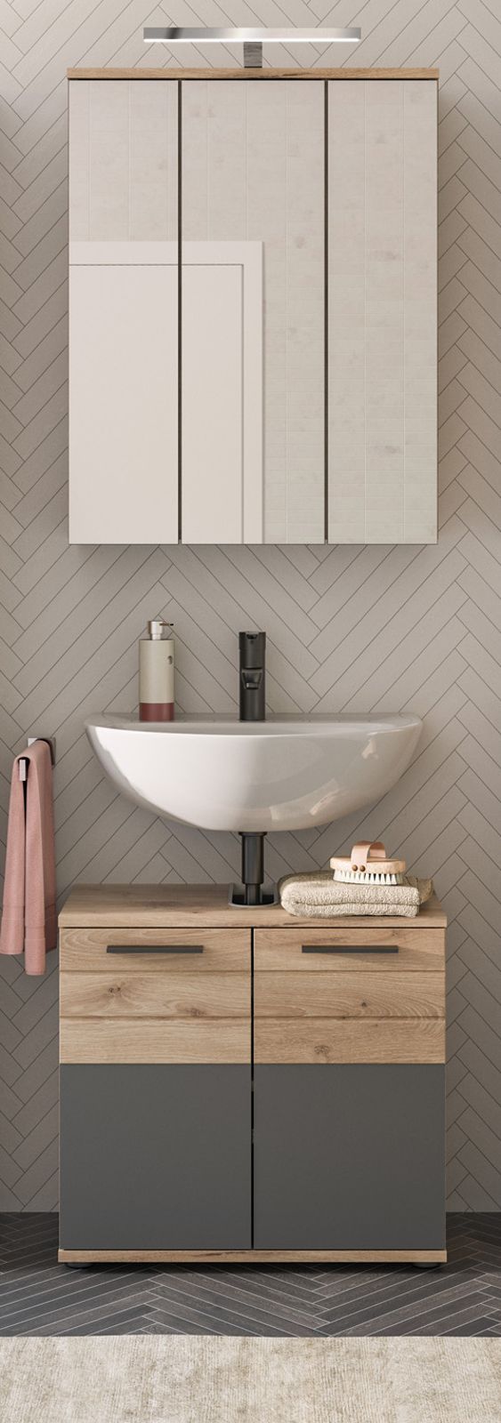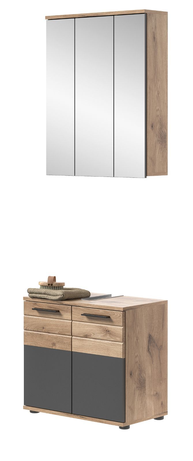 Badmöbel Set Waschbeckenunterschrank Spiegelschrank Eiche grau Soft-Close Tomaso