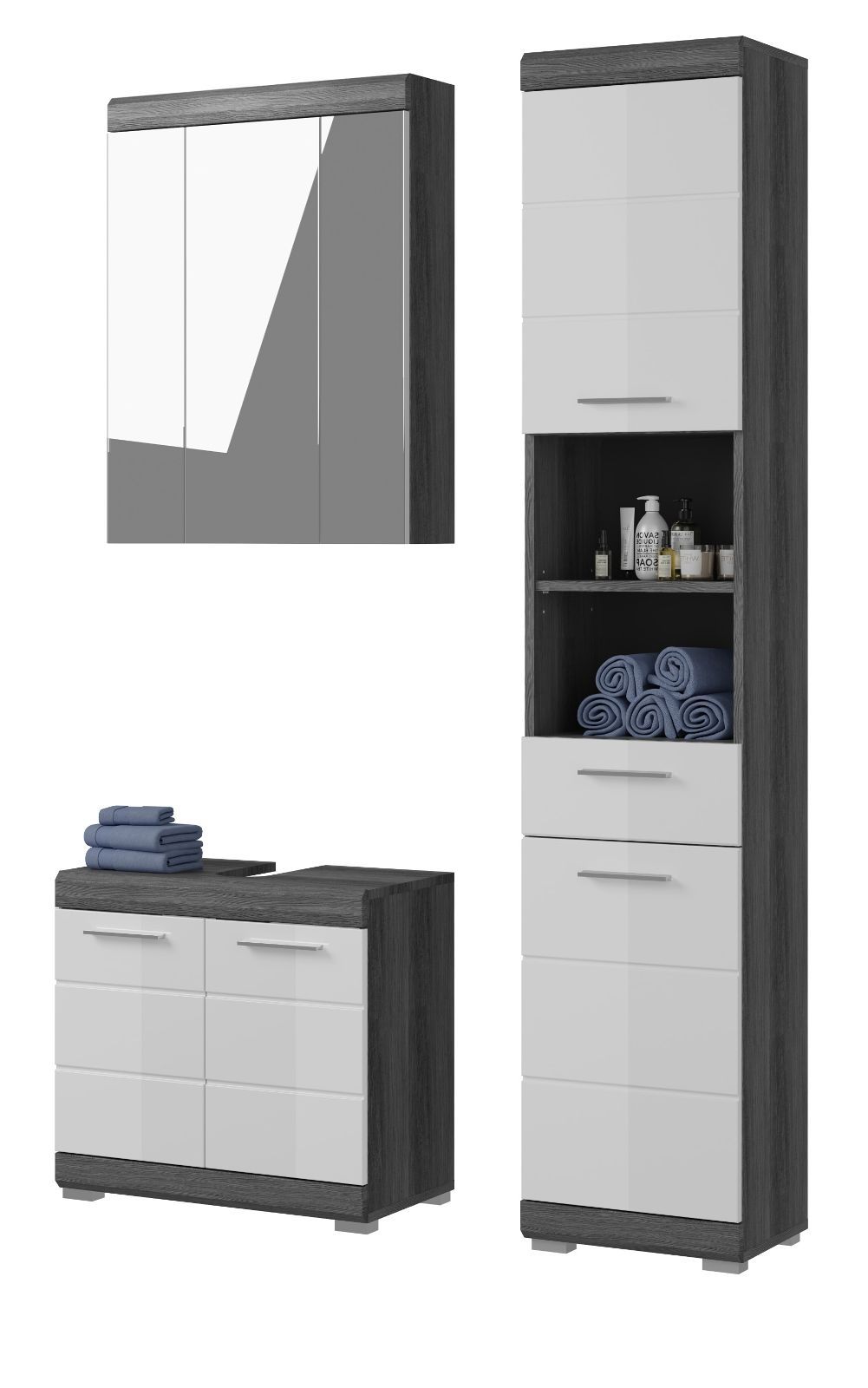 Badmöbel Set Waschbeckenunterschrank Spiegelschrank Schrank weiß Hochglanz Shawn