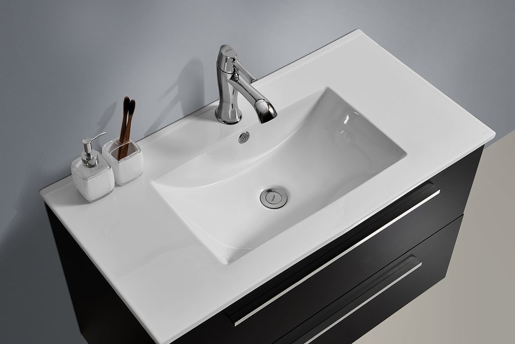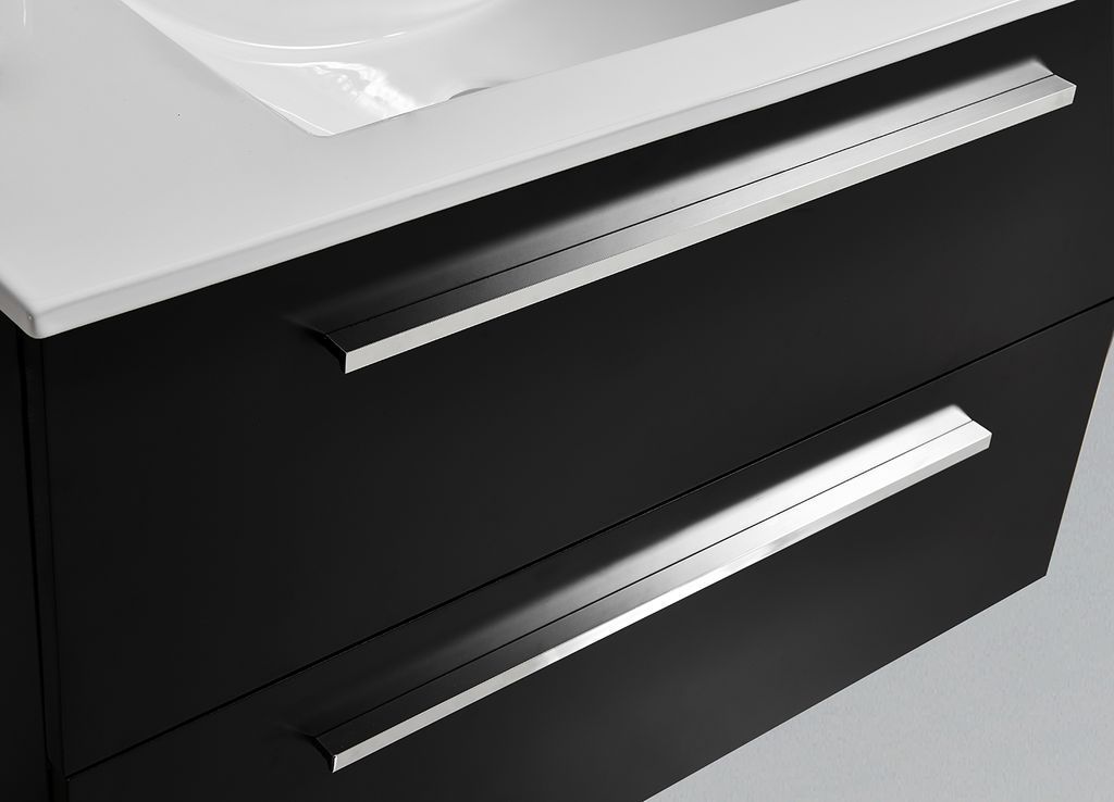 moderner Unterschrank MDF-Holz hochwertig in mattem schwarz lackiert Waschtisch inkl. Überlauf aus hochwertigem Keramik Griffe aus Aluminium hochwertige Soft-Close Scharniere leichte Montage, auch ohne Fachkenntnisse ohne Armatur und Ablaufgarnitur passende Spiegel und LED-Spiegel der Serie OPORTO b