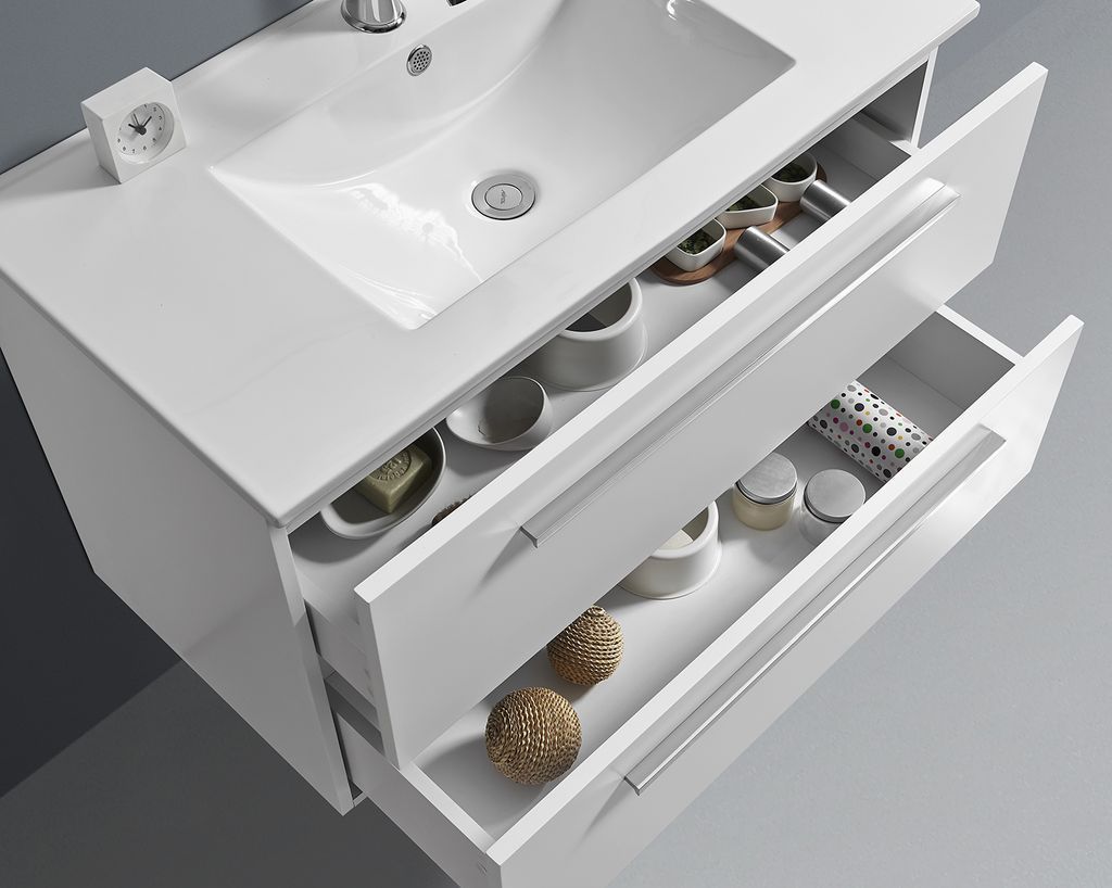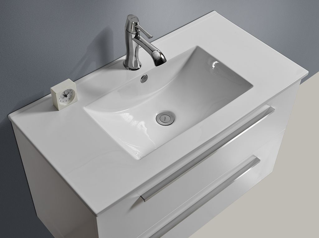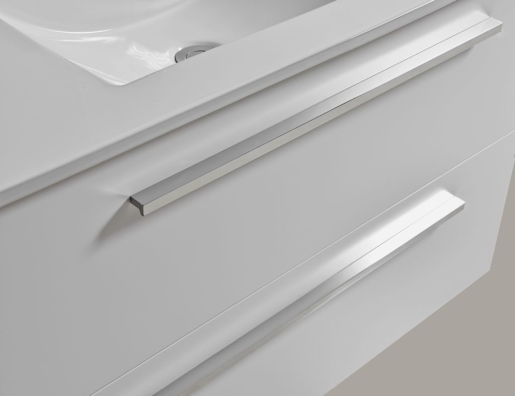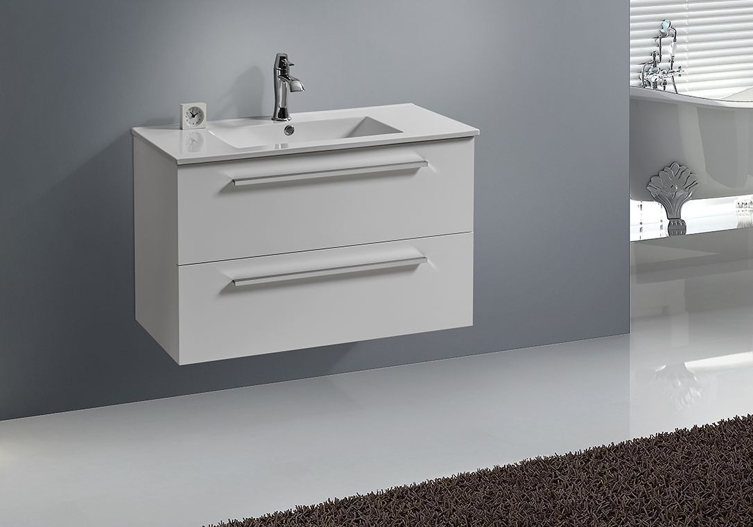 moderner Unterschrank MDF-Holz hochwertig in mattem weiß lackiert Waschtisch inkl. Überlauf aus hochwertigem Keramik Griffe aus Aluminium hochwertige Soft-Close Scharniere leichte Montage, auch ohne Fachkenntnisse ohne Armatur und Ablaufgarnitur passende Spiegel und LED-Spiegel der Serie OPORTO bei