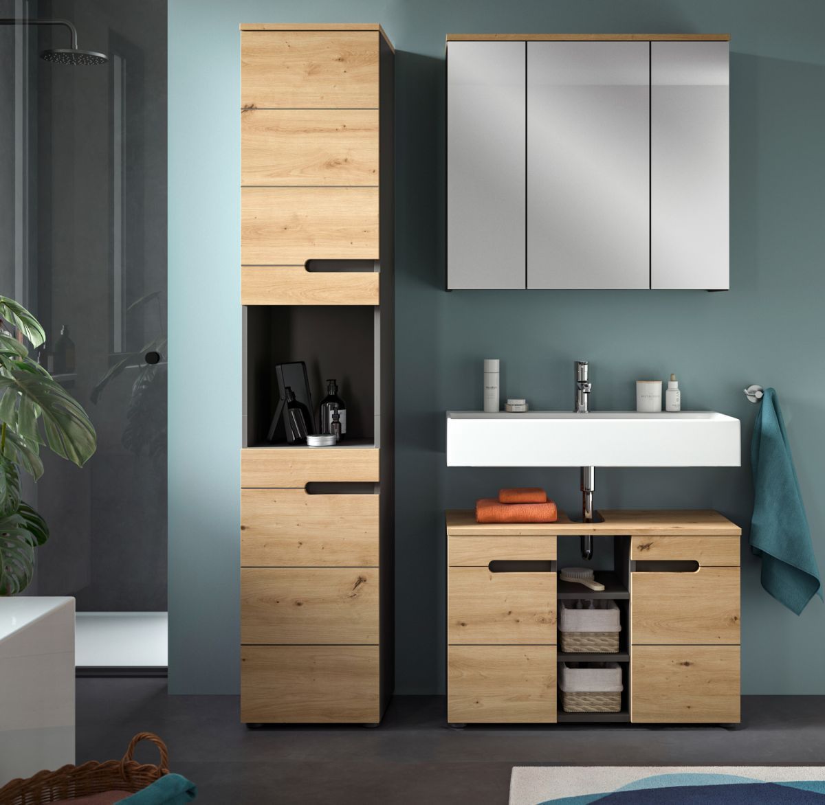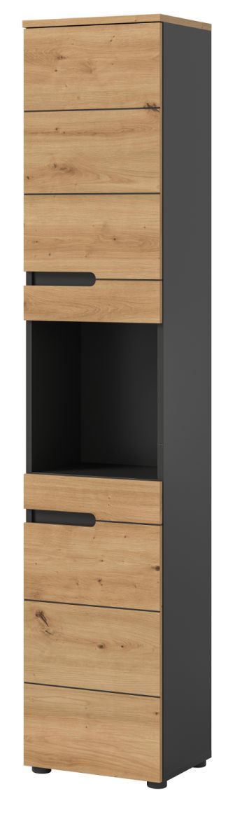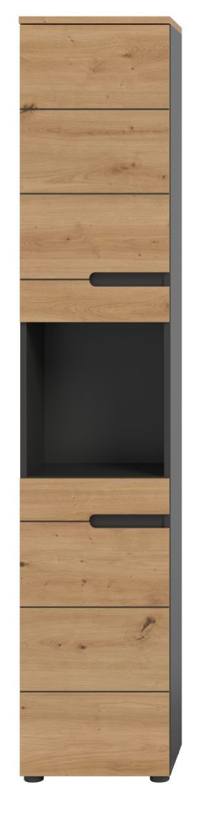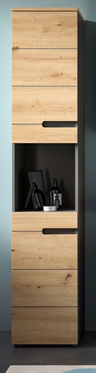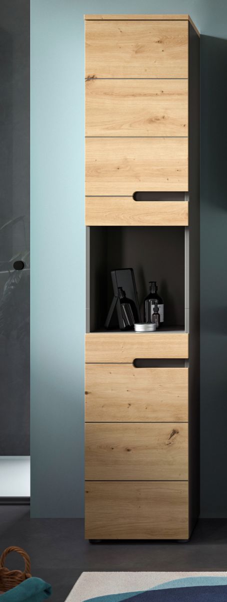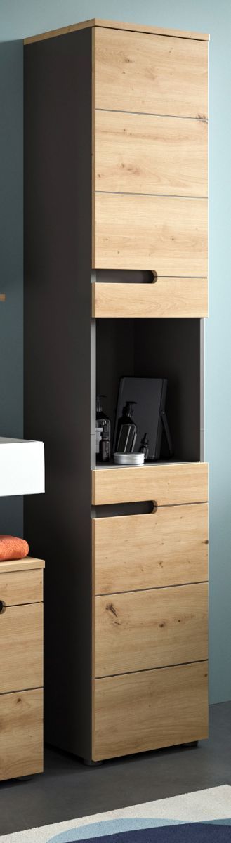 Badschrank Badezimmer Hochschrank Soft-Close Eiche grau Badmöbel Cooper 38 x 193 cm