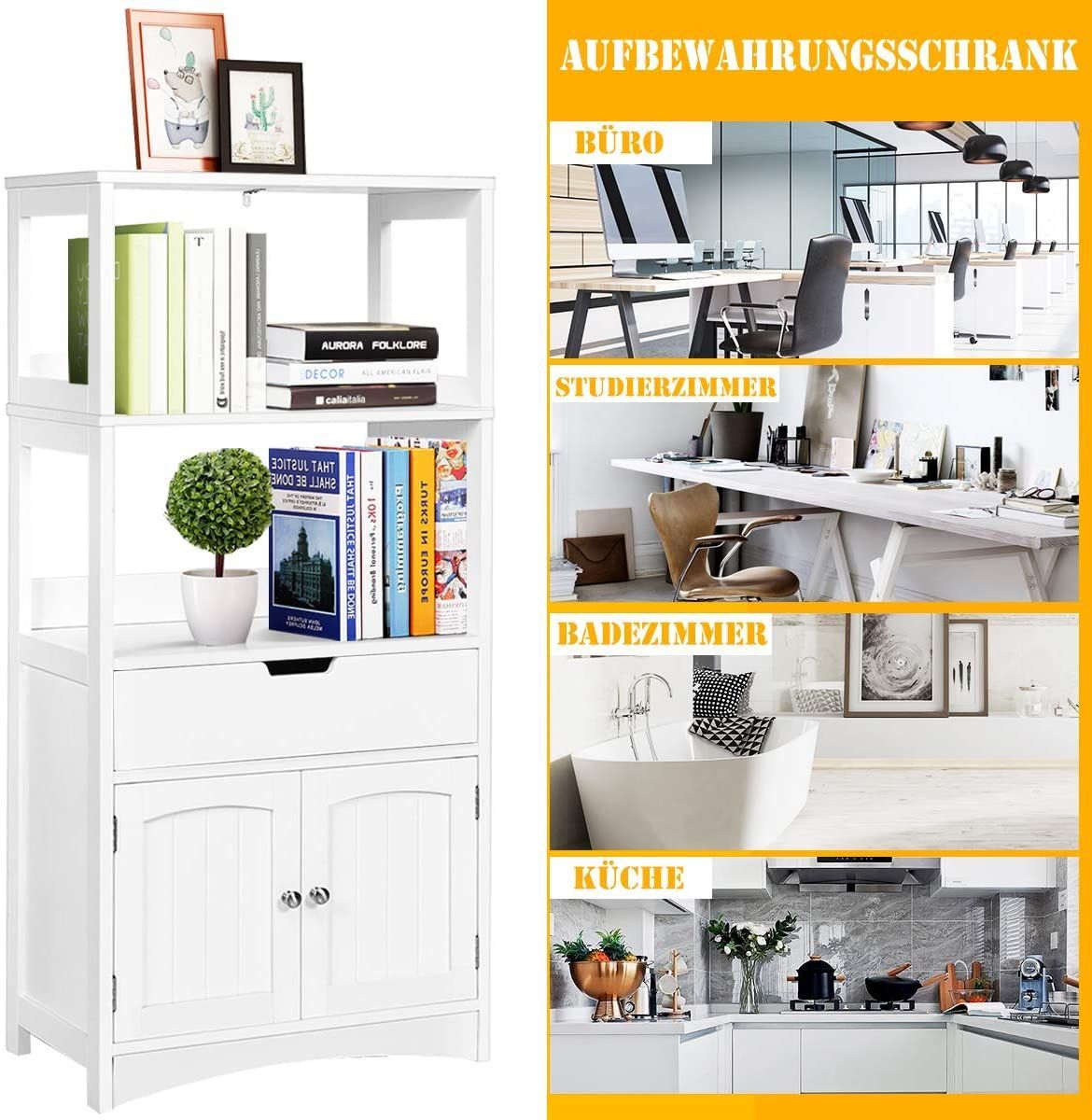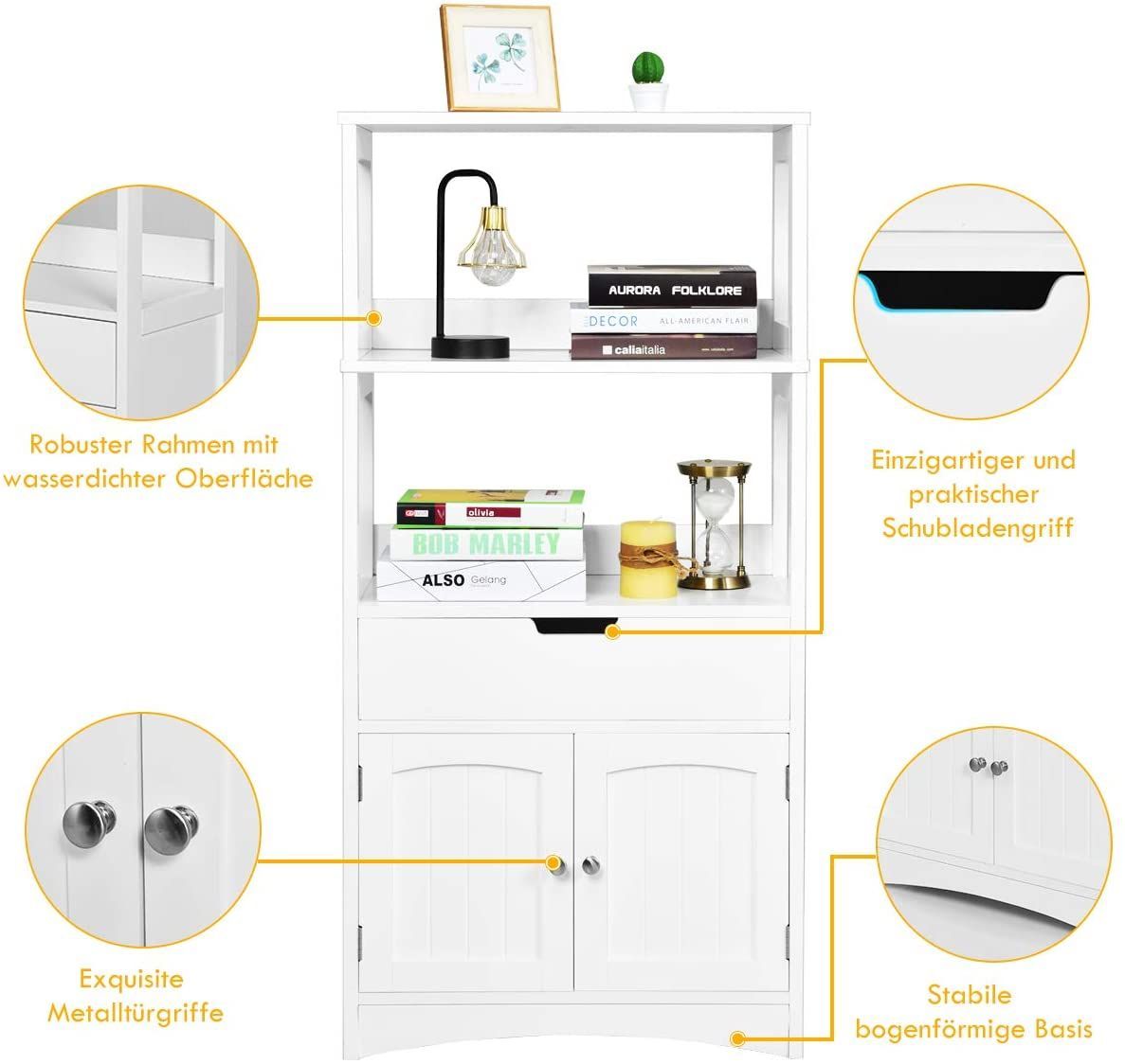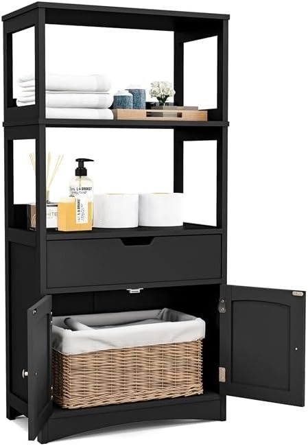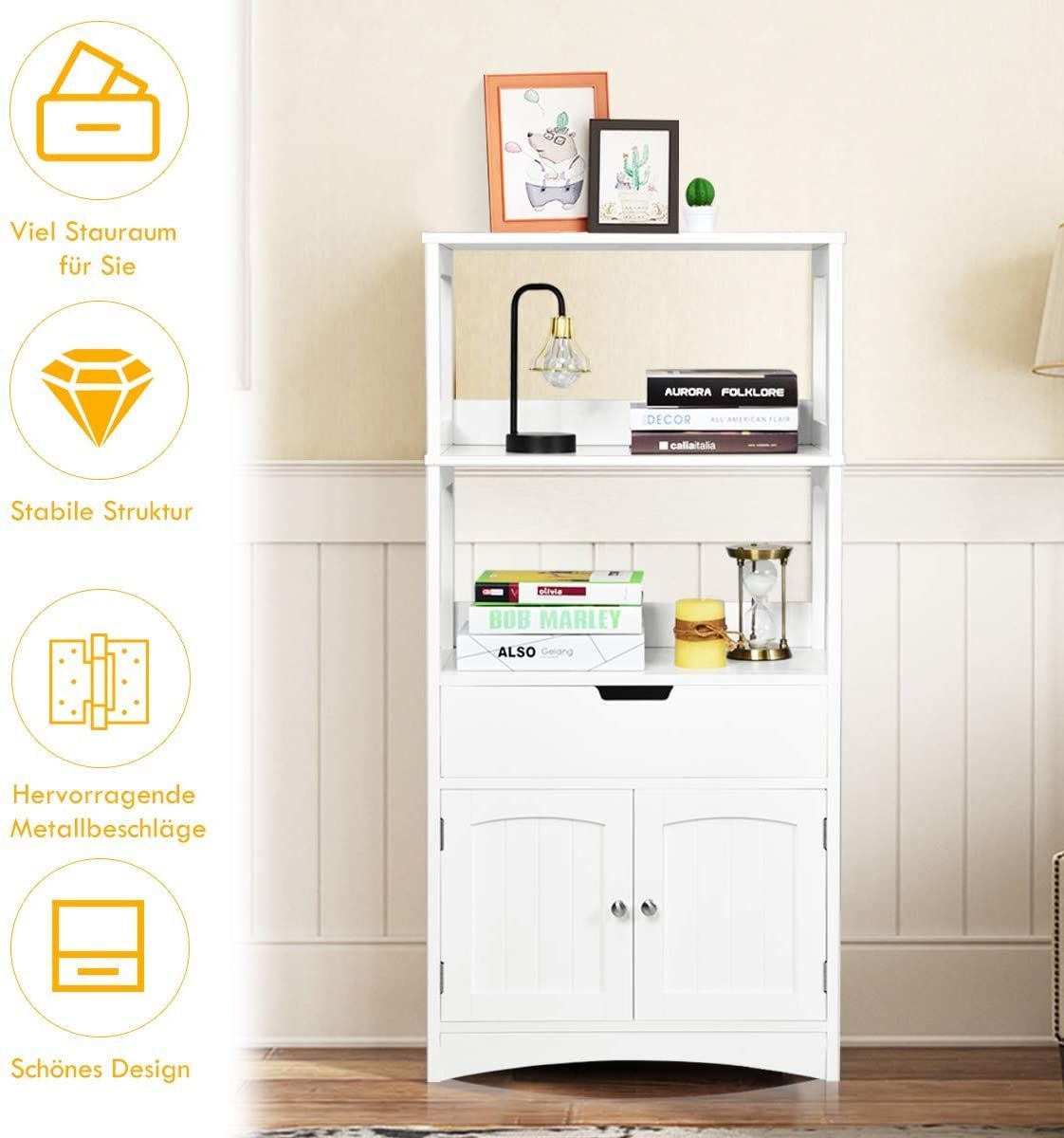 Badschrank mit Schublade, Hochschrank mit 2 offenen Regalen & Türschrank, Badkommode