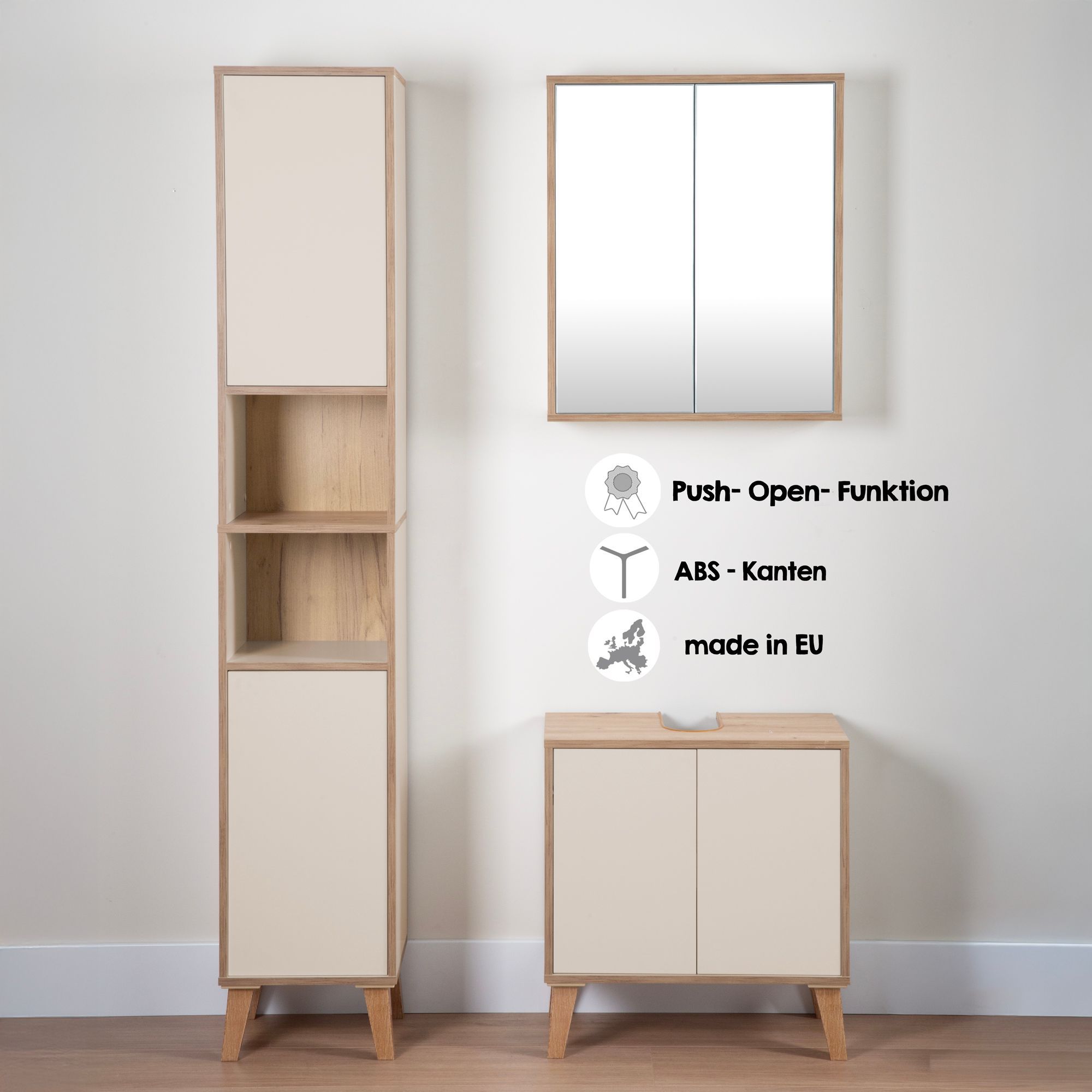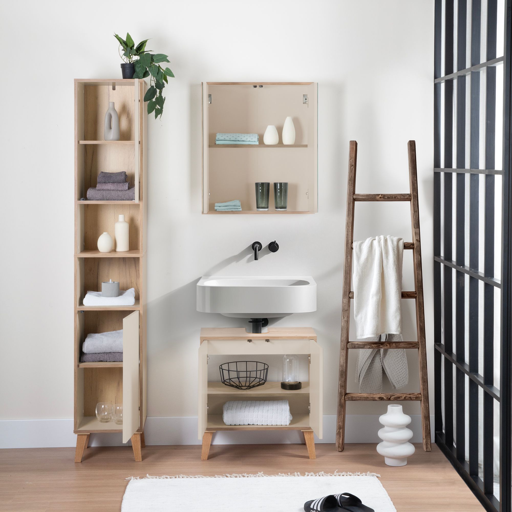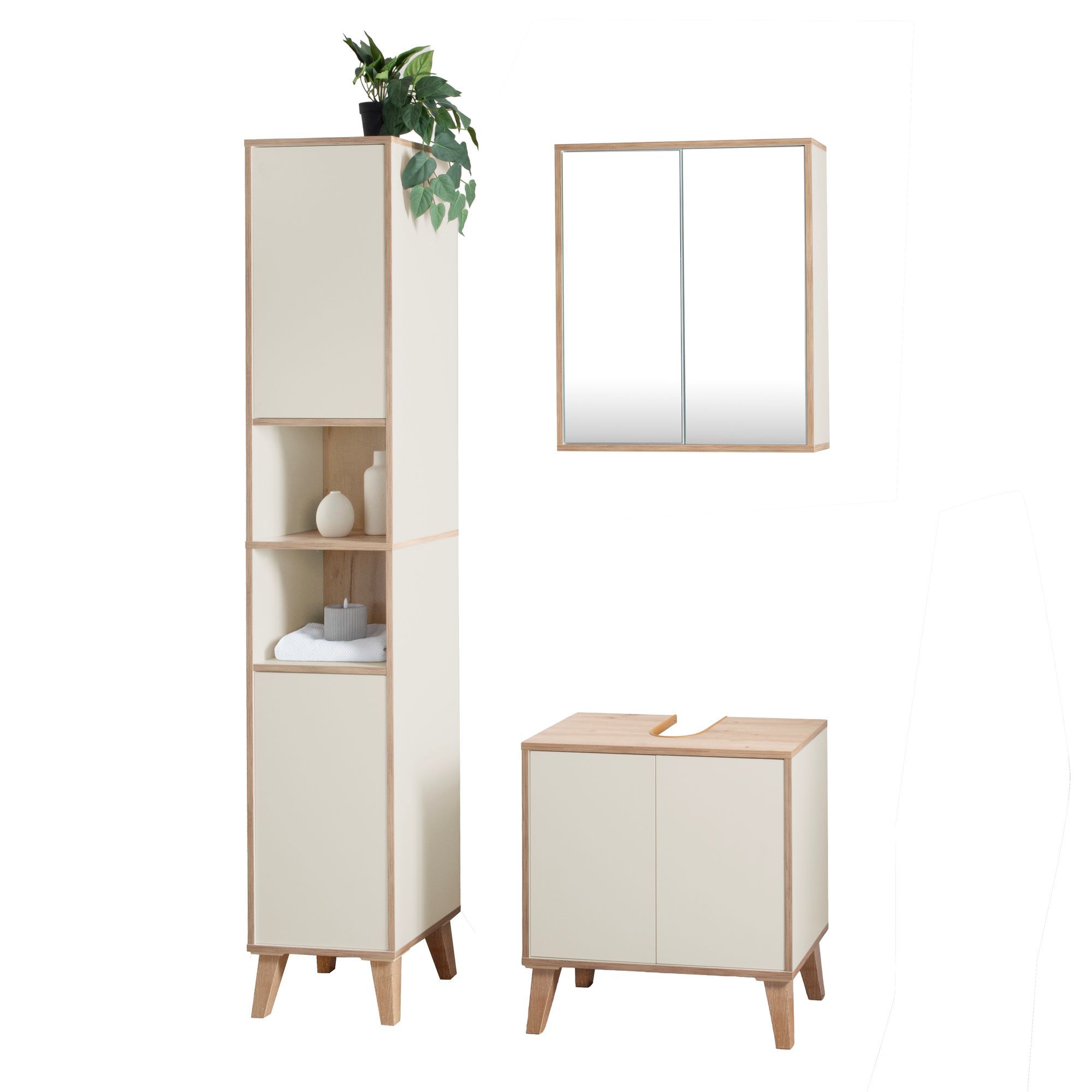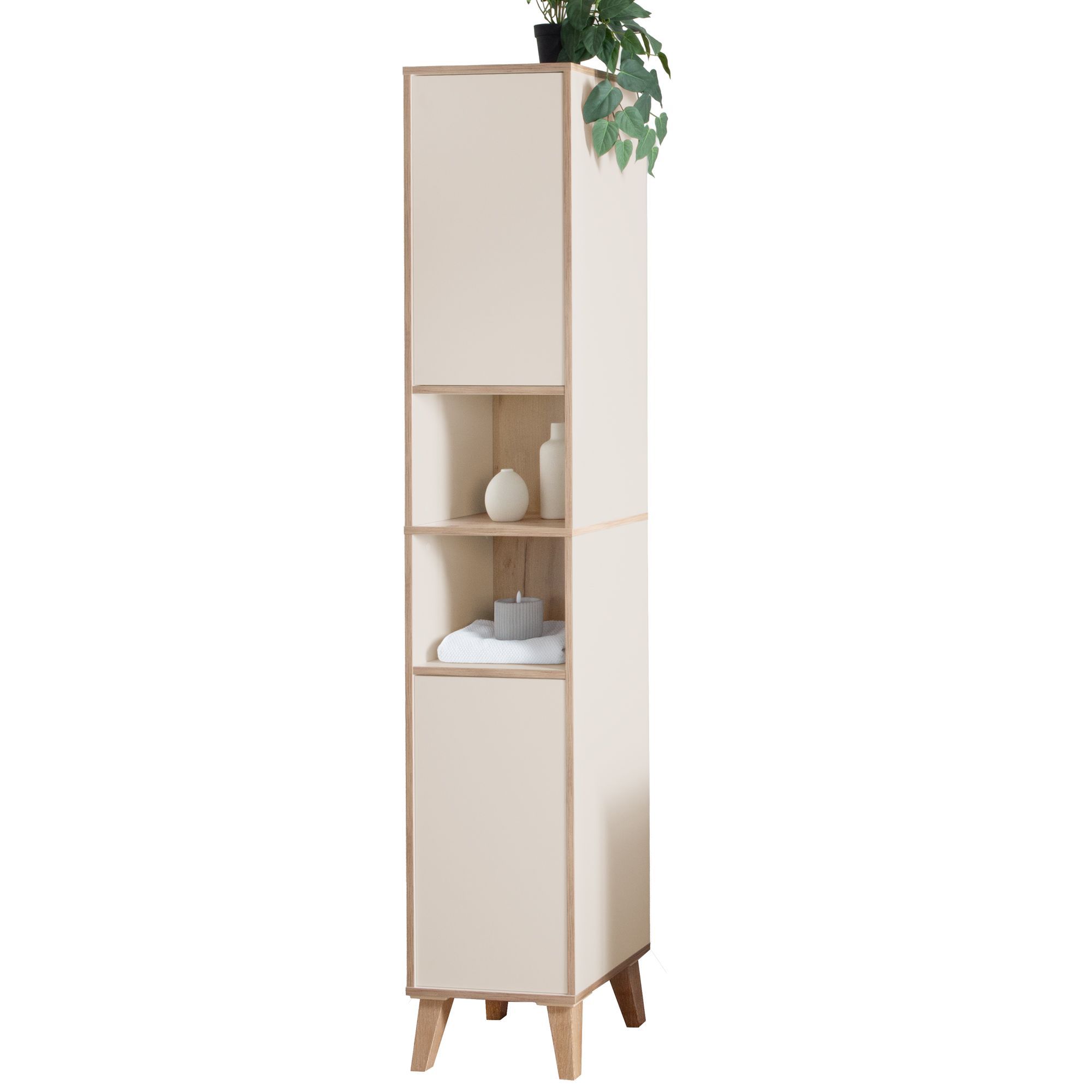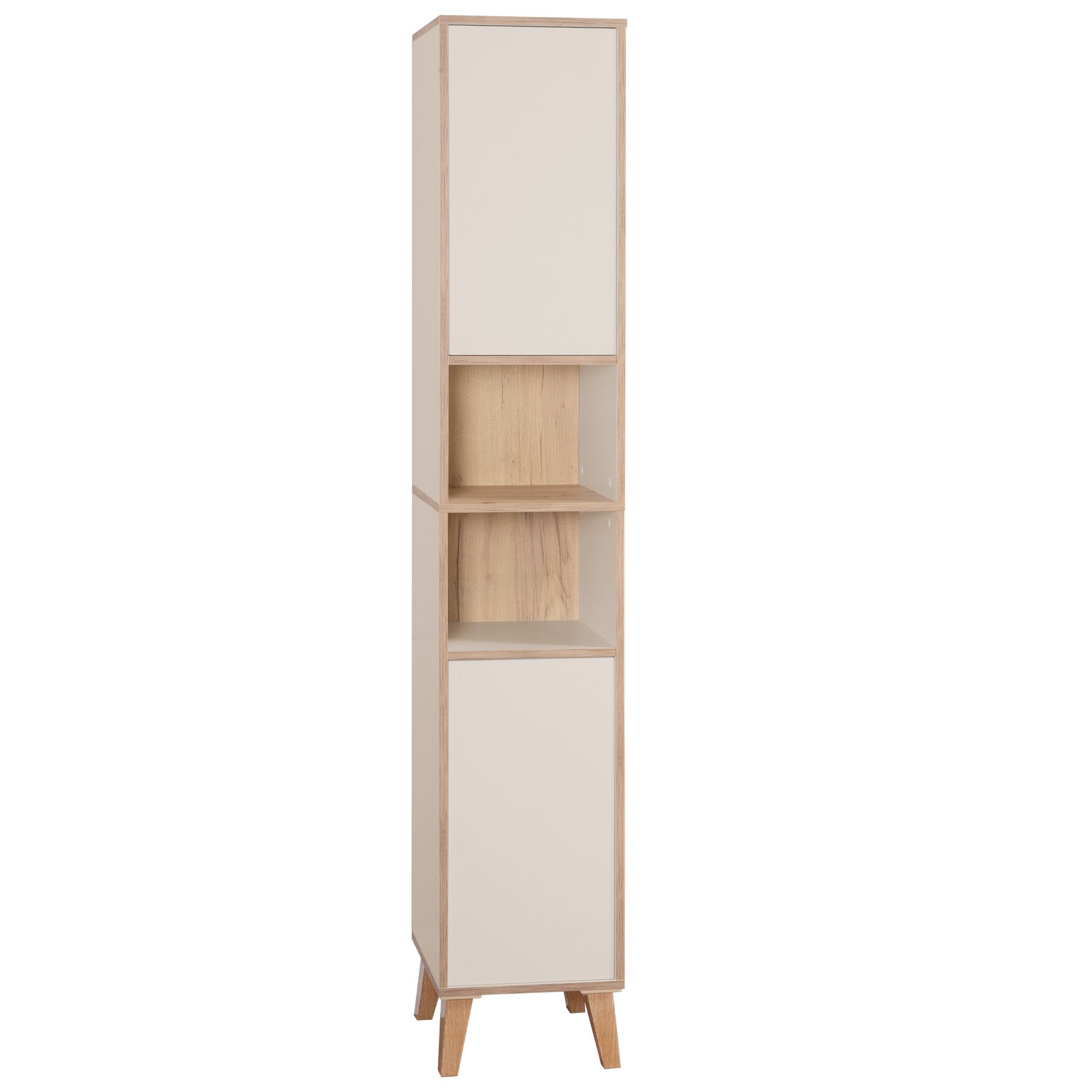 Badschrank MORENA mit 2 Türen und 2 offenen Fächern, cashmere/Eiche