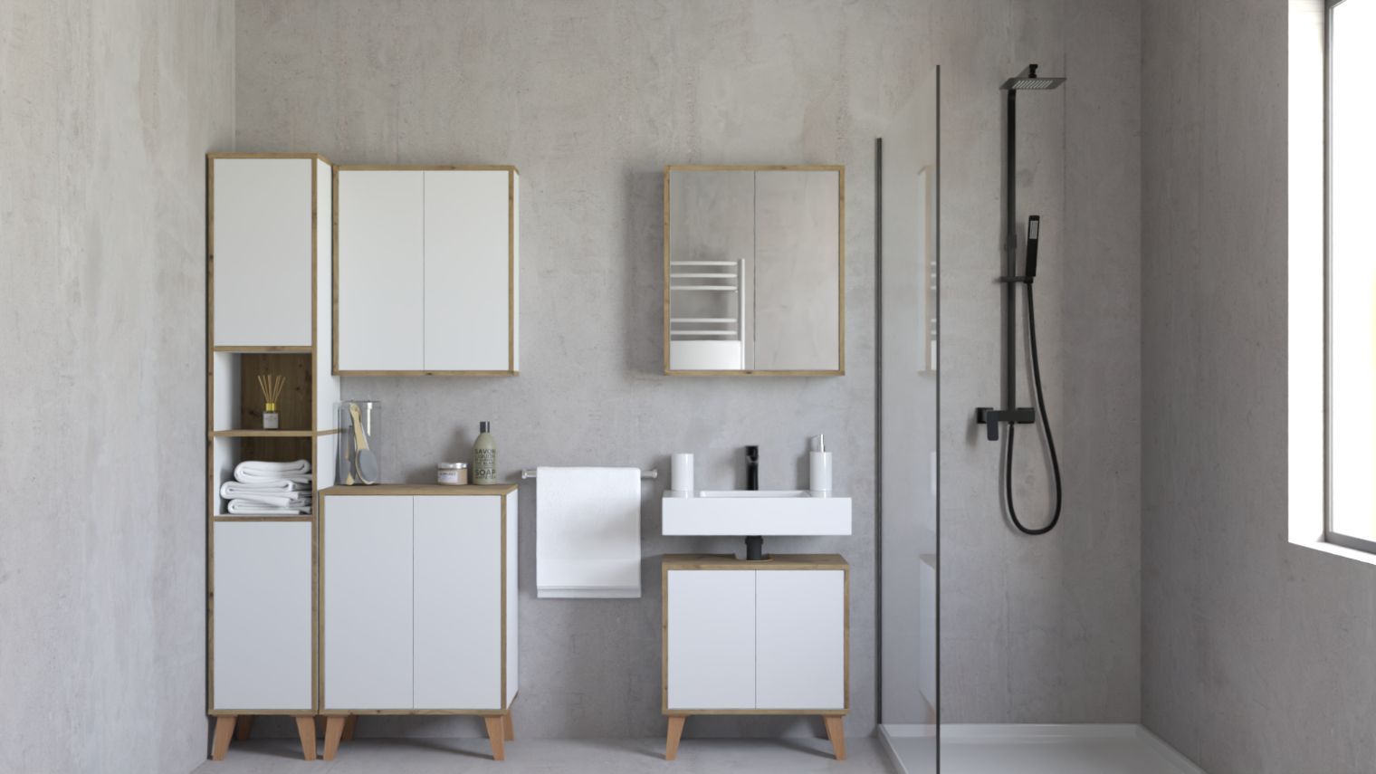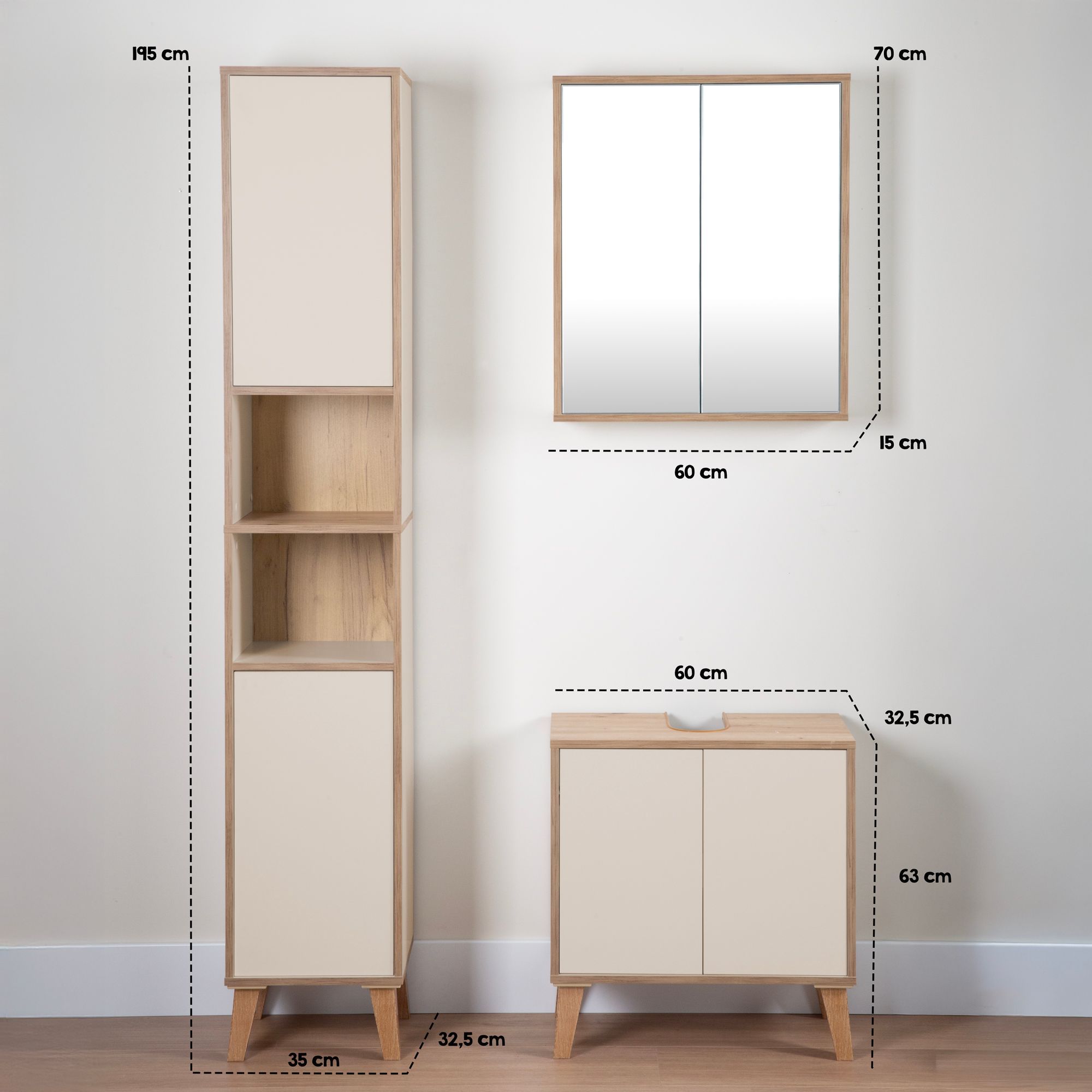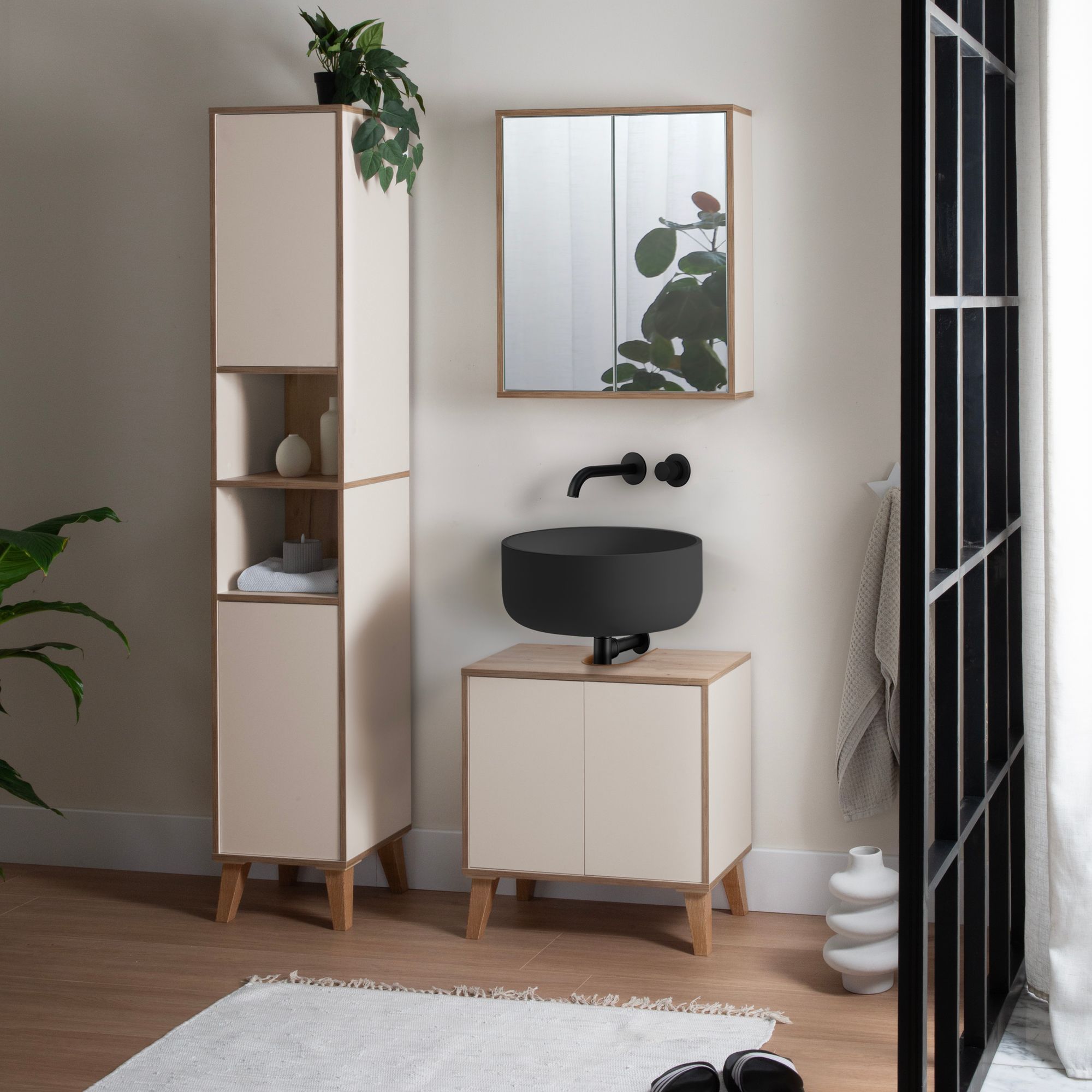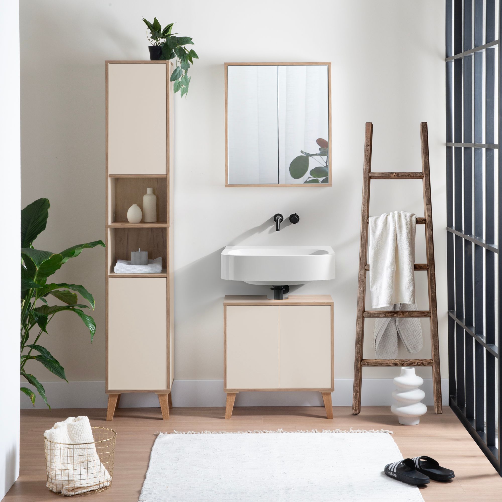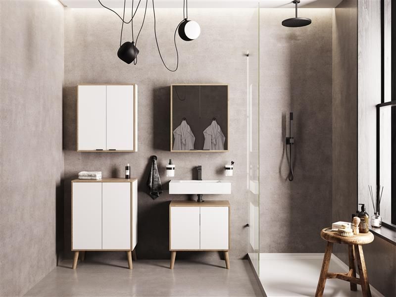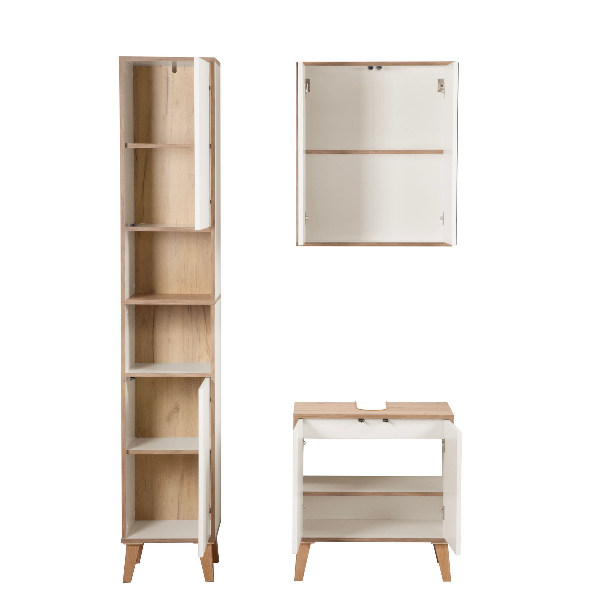 Badschrank MORENA mit 2 Türen und 2 offenen Fächern, cashmere/Eiche