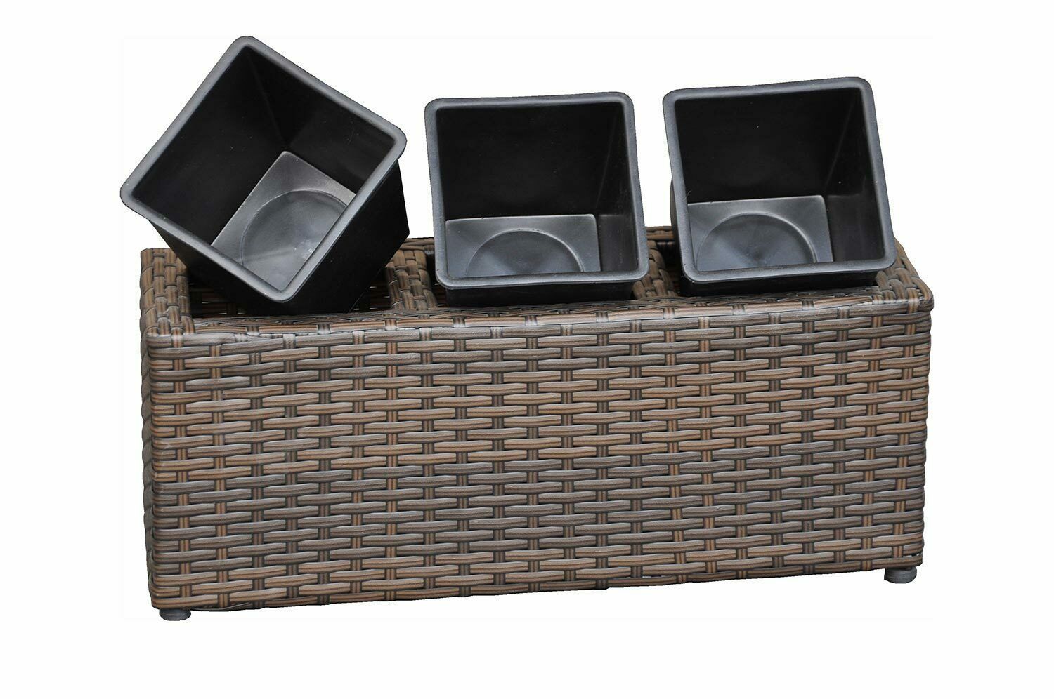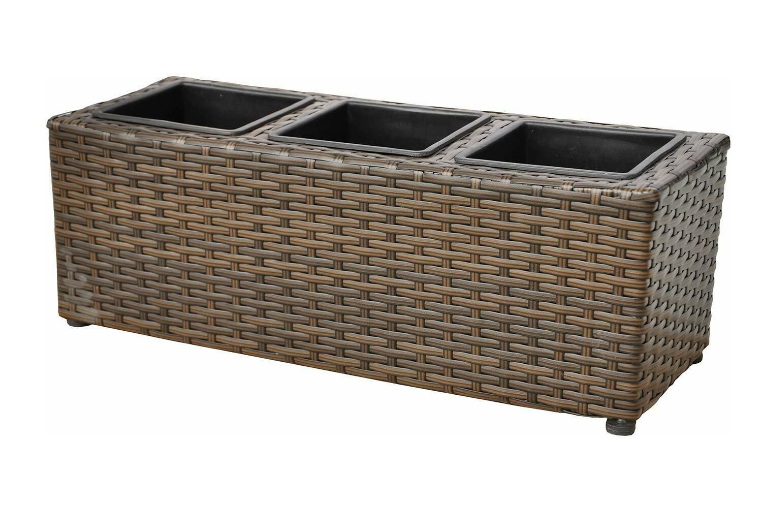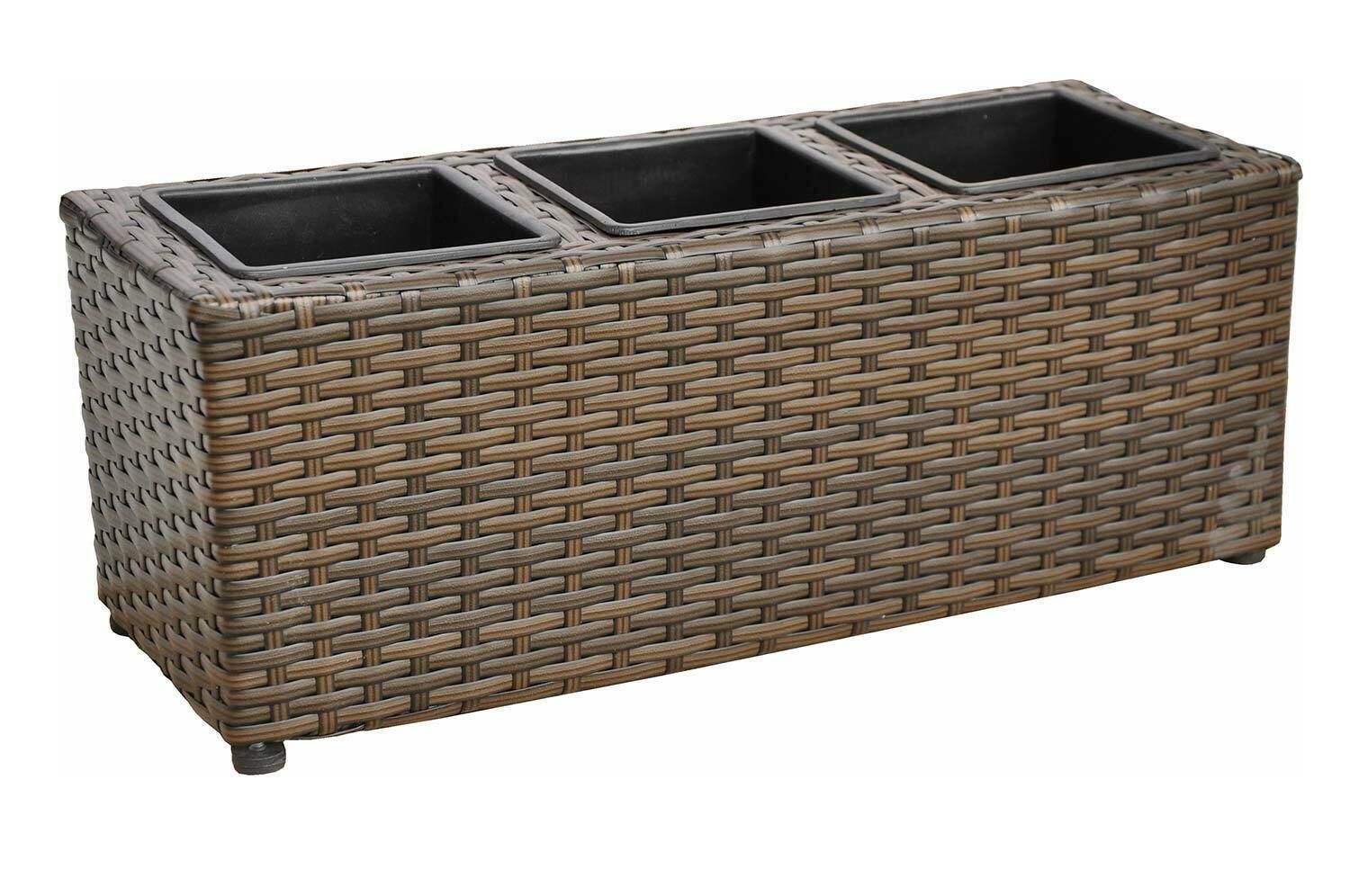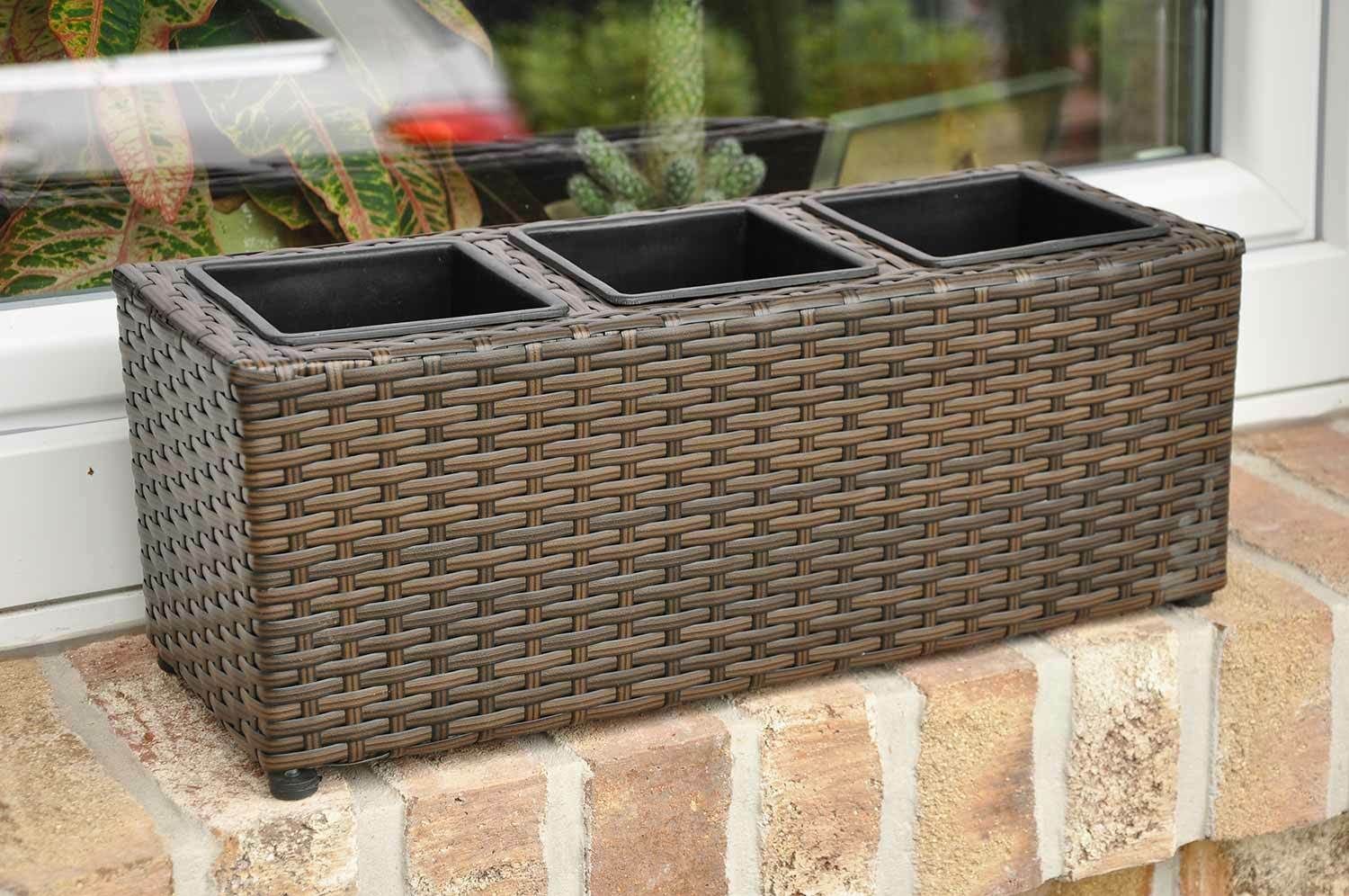 MENÜ Close Bild vergrößern Balkon Pflanzkübel Madeira braun Holen Sie sich die Natur auf Ihren Balkon - Balkonkasten für 3 Pflanzen - braun - wetterfest Euro aus handgeflochtenem Polyrattan Euro für Fensterbank und Garten Euro mit Aufhängung Euro herausnehmbare Kunststoffeinsätze Der handgeflochtene