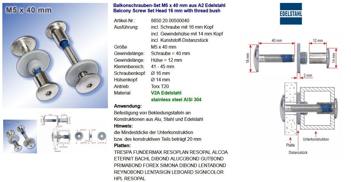 Balkonschrauben-Set M5 x 40 mm V2A TRESPA Edelstahl A2 Schrauben