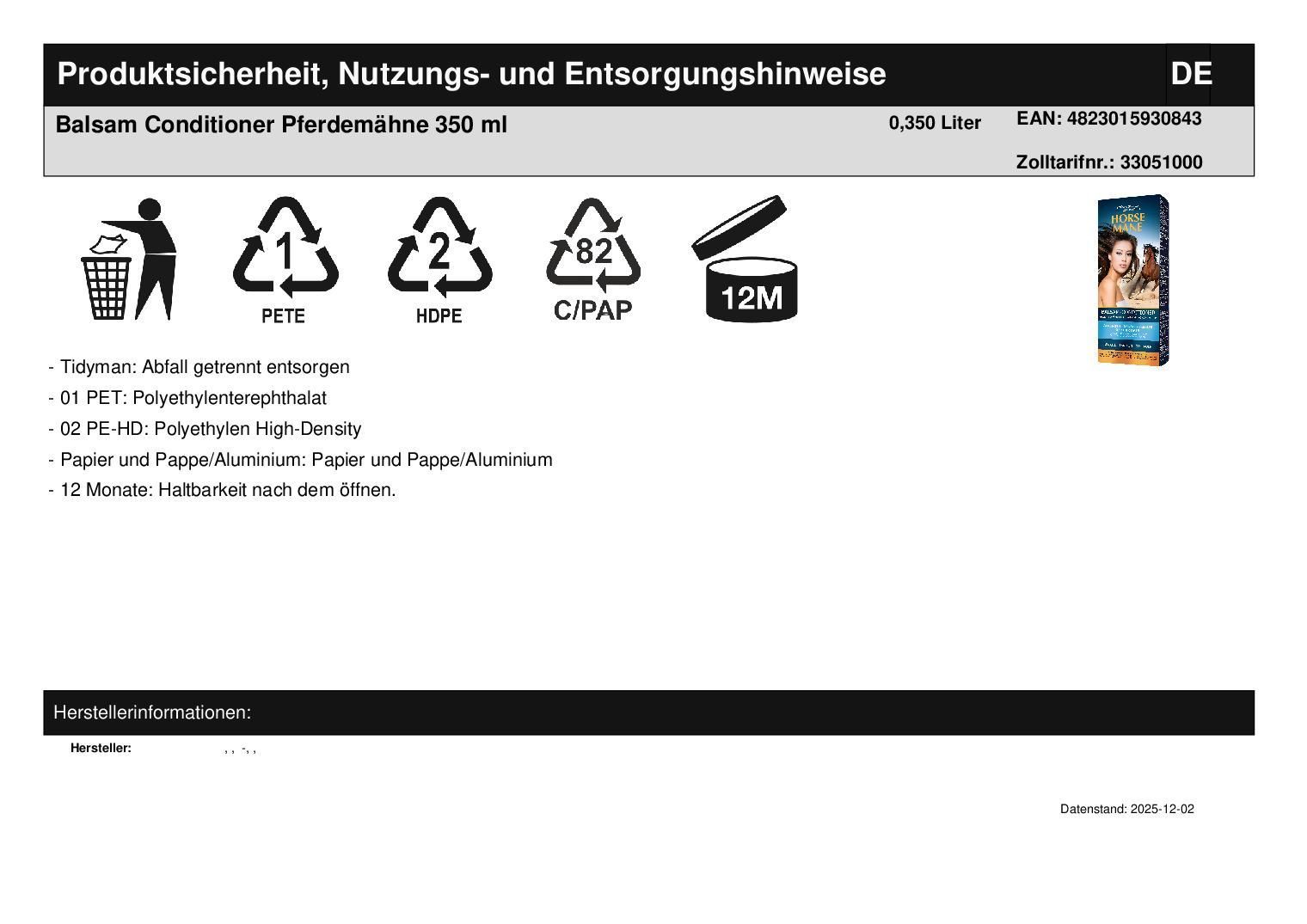 Balsam Conditioner Horse Mane Haarspülung Keratin Lanolin Collagen 350 ml