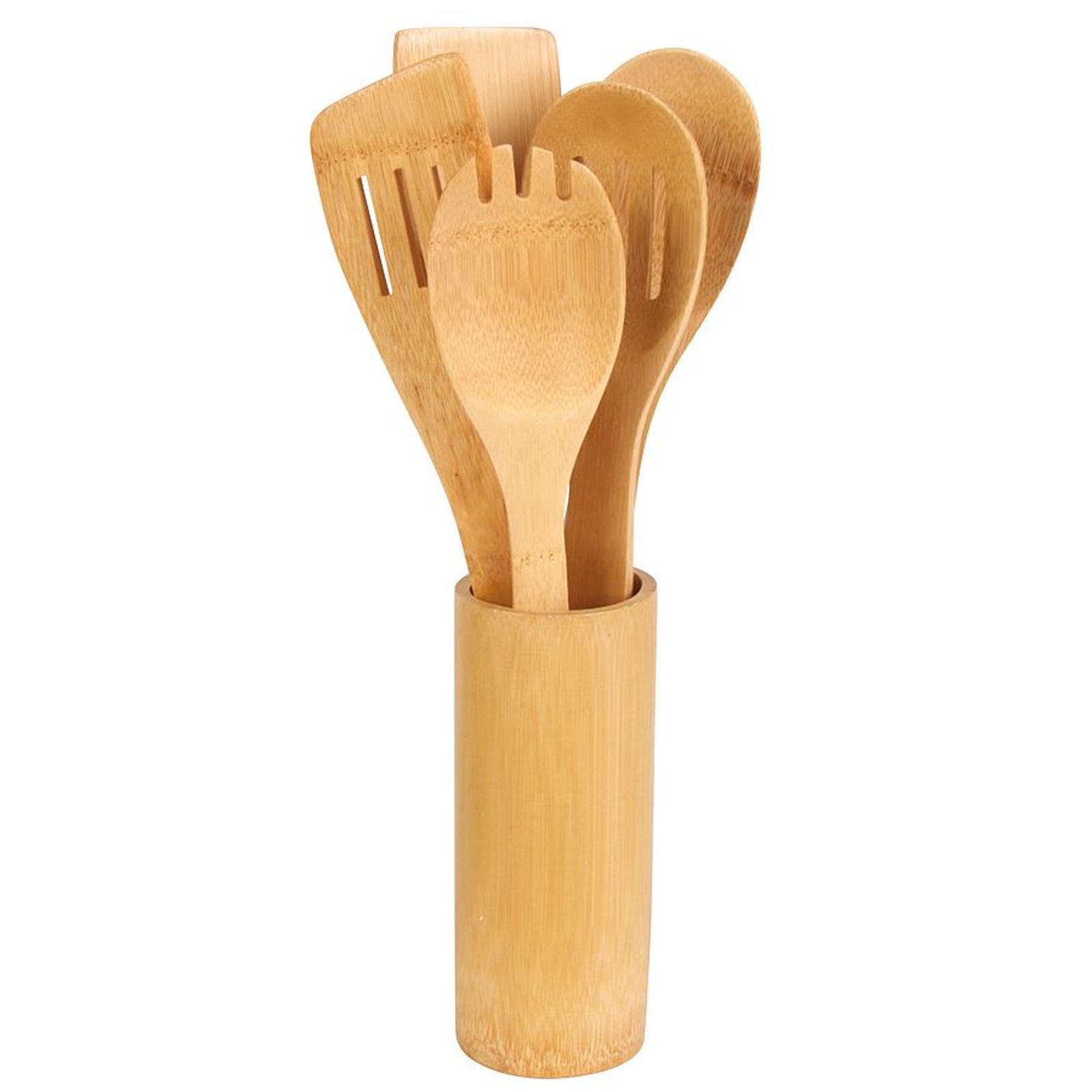 Bambus Küchenhelfer 5er-Set im Utensilienhalter Kochbesteck Löffel Pfannenwender