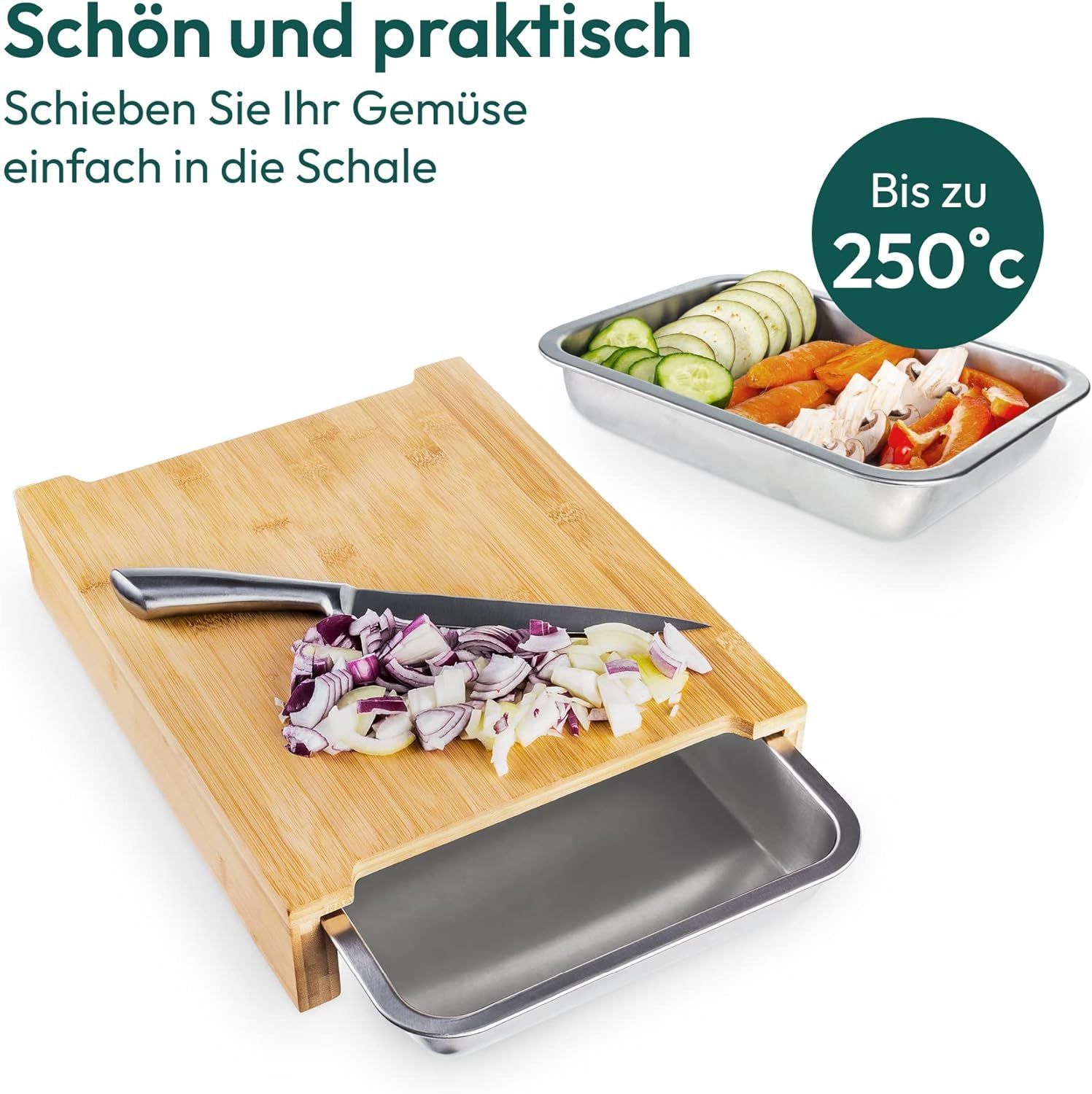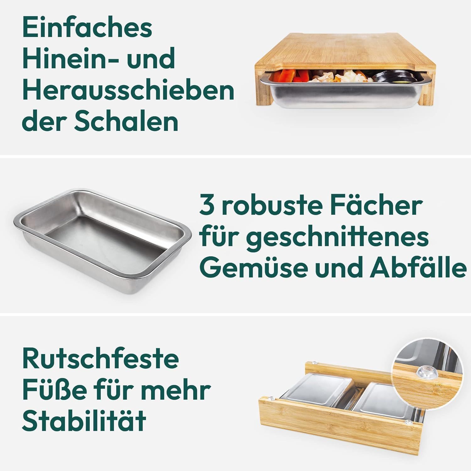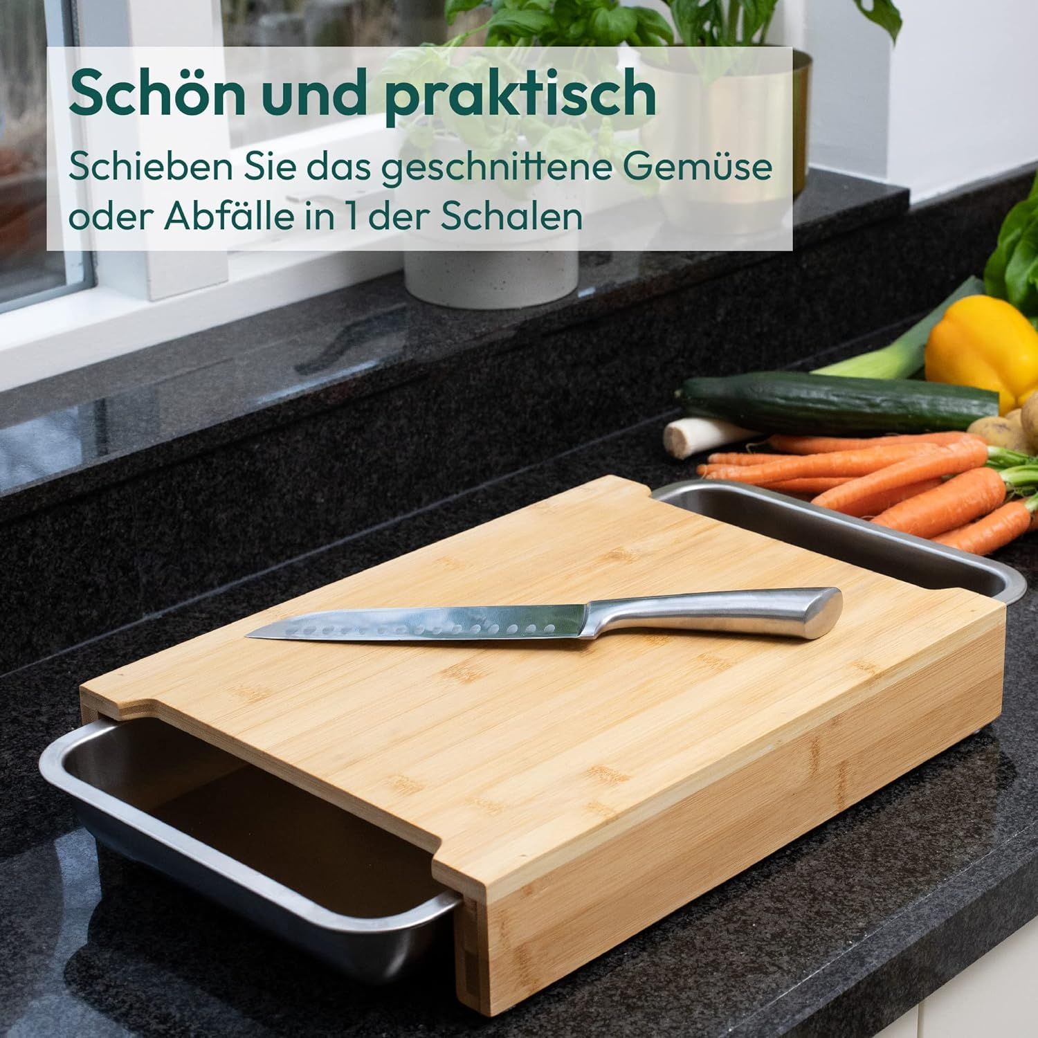 Bambus Schneidebrett mit 2 Auffangschalen aus Edelstahl