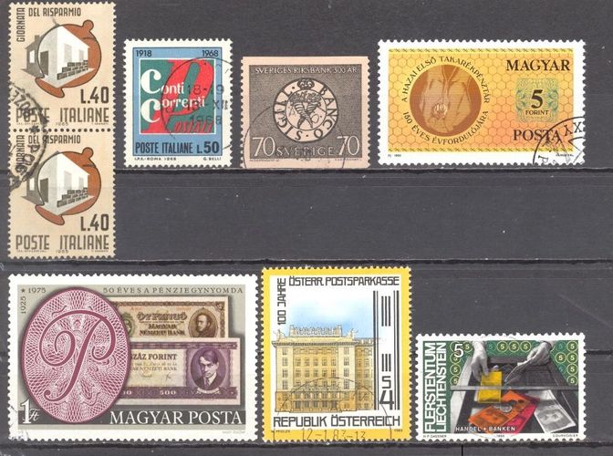 Banken, Geld, Italien, Österreich, Schweden, Ungarn, Liechtenstein, 8 Briefm., gest