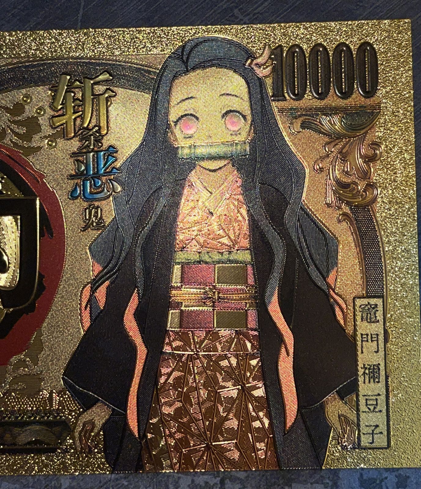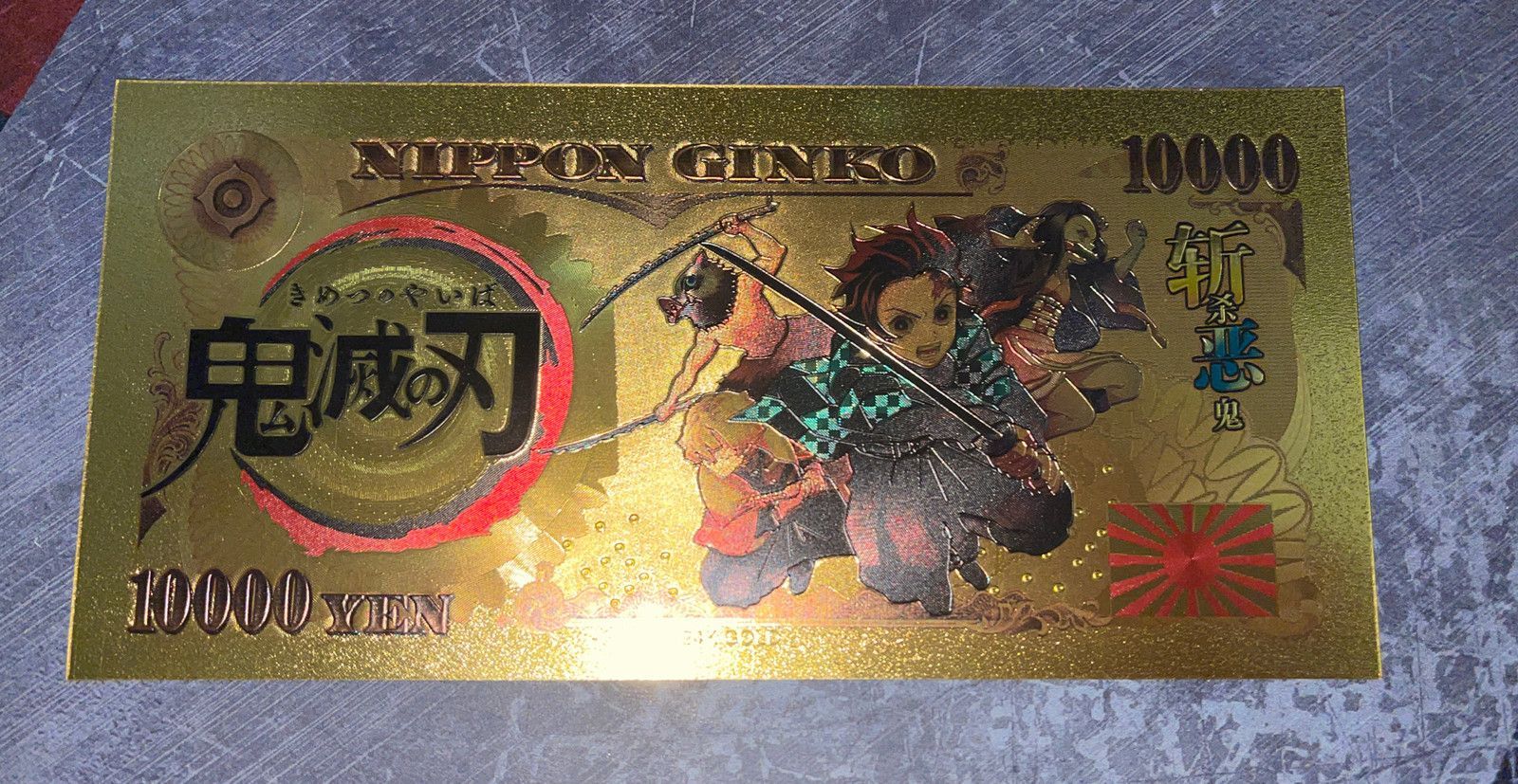 Goldfolie Banknote vergoldet Folie - sehr selten Anime Demon Slayer Kimetsu no Yaiba - Nezuko Kamado Technische Information zum Artikel Material: Goldfolie Größe: original Größe Erhaltung: Neu Verpackung: Folie Das ideale Geschenk oder natürlich auch zum selber sammeln Natürlich handelt es sich nich... Mehr