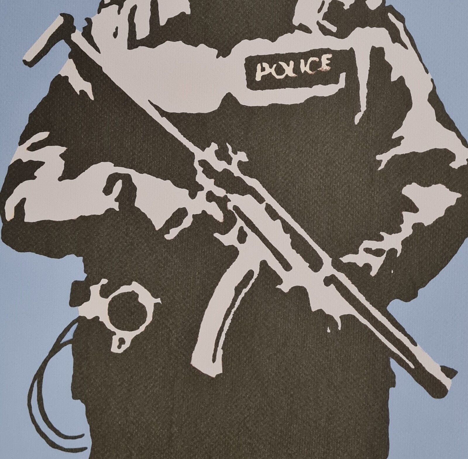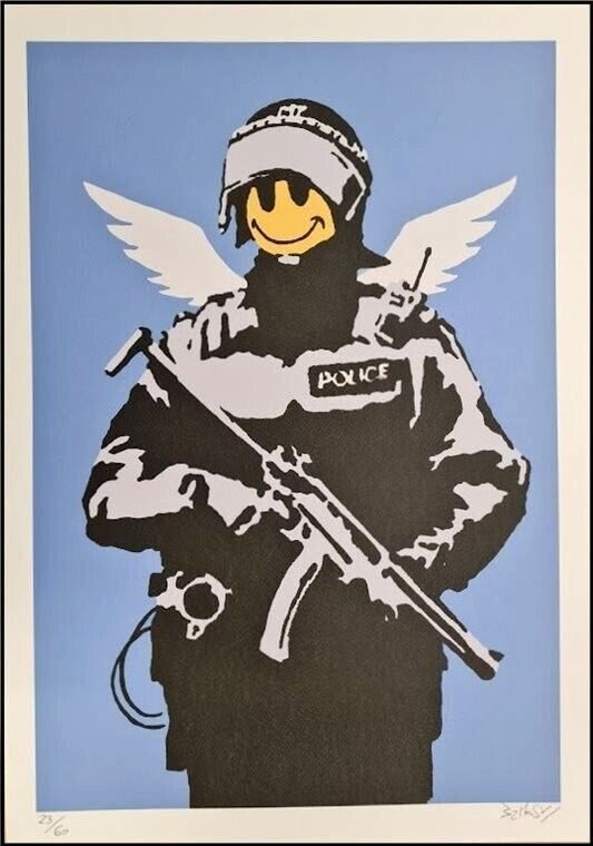 Lithographie Fliegender Polizist Mit der Hand nummeriert Limitierte Auflage von 60 Stück Jedes Stück ist einzeln nummeriert Prägestempel Gesamtgröße : 50 cm x 35 cm Nach dem Original von Banksy Das Blatt wird flach verschickt, nicht gerollt! Alle angebotenen Kunstprodukte werden mit Rechnung und aus
