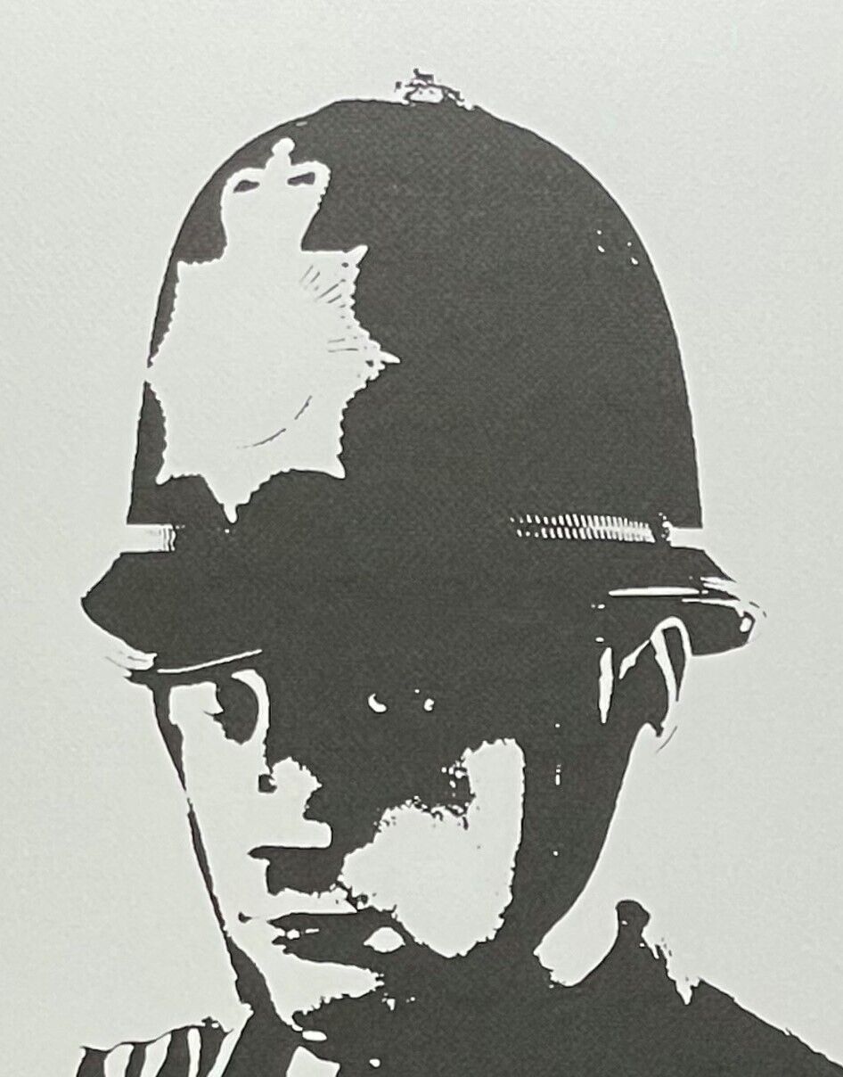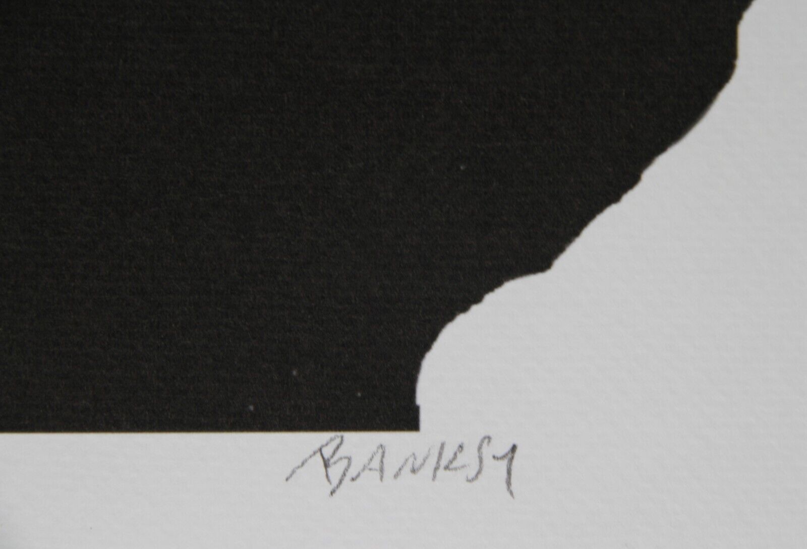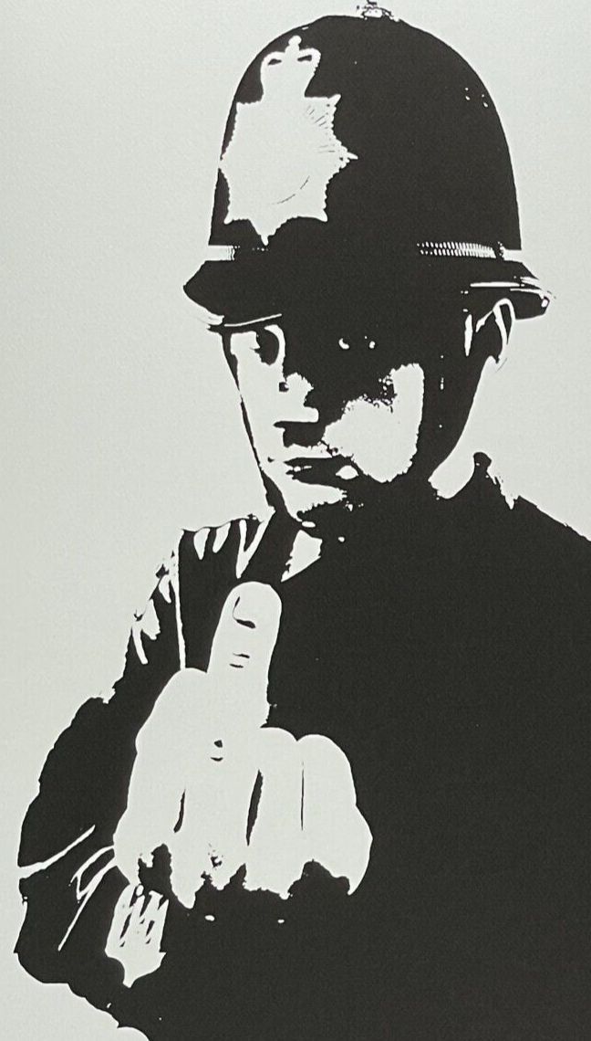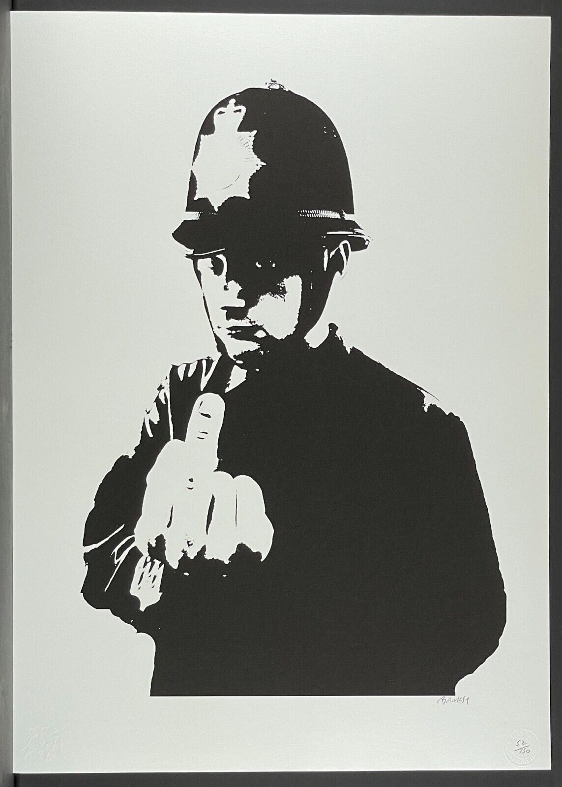 Lithographie Unhöflicher Polizist Mit der Hand nummeriert Limitierte Auflage von 150 Stück Jedes Stück ist einzeln nummeriert Prägestempel von P.O.W. (Pictures on Wall) und Elefant mit Rakete Gesamtgröße : 70 cm x 50 cm Nach dem Original von Banksy Das Blatt wird flach verschickt, nicht gerollt! All