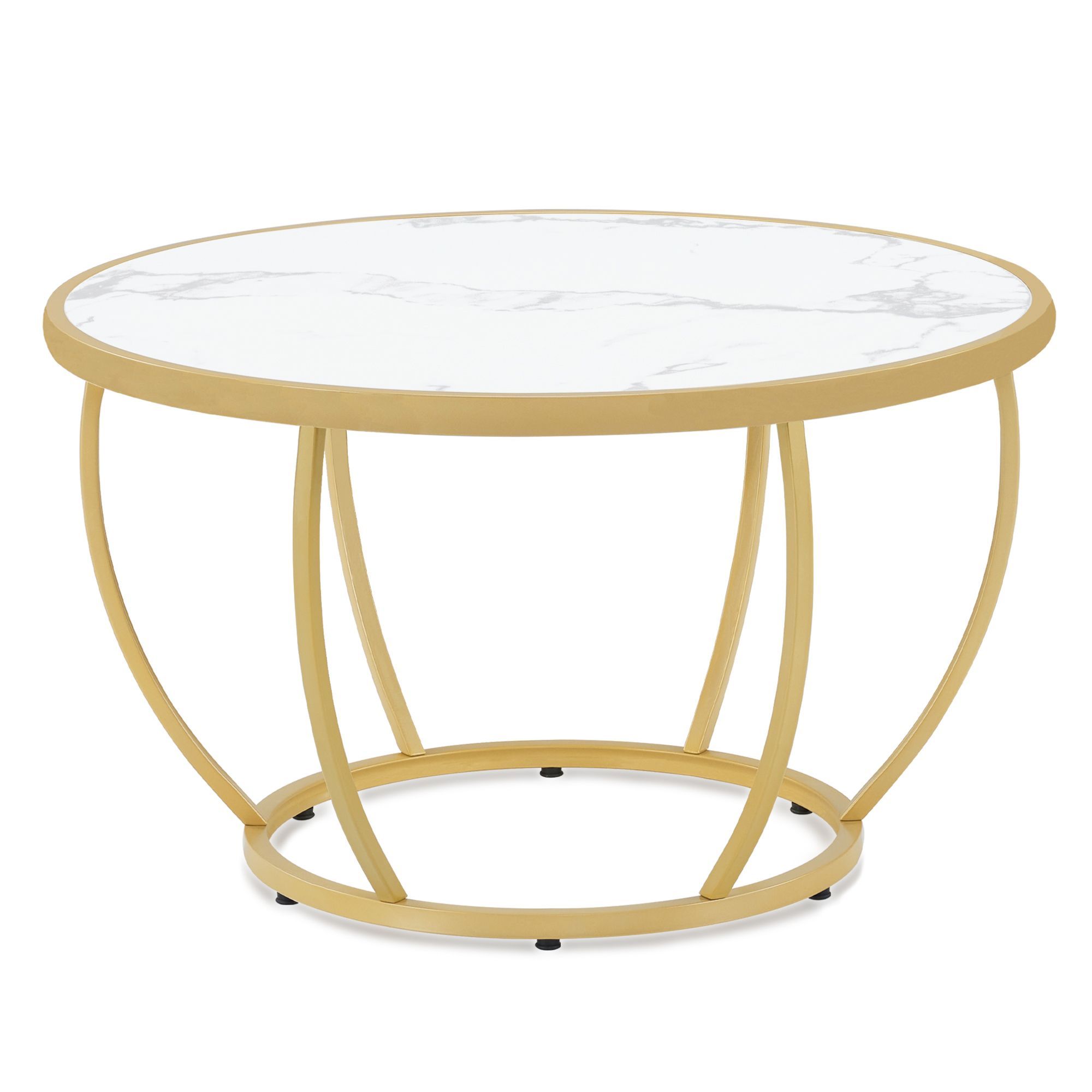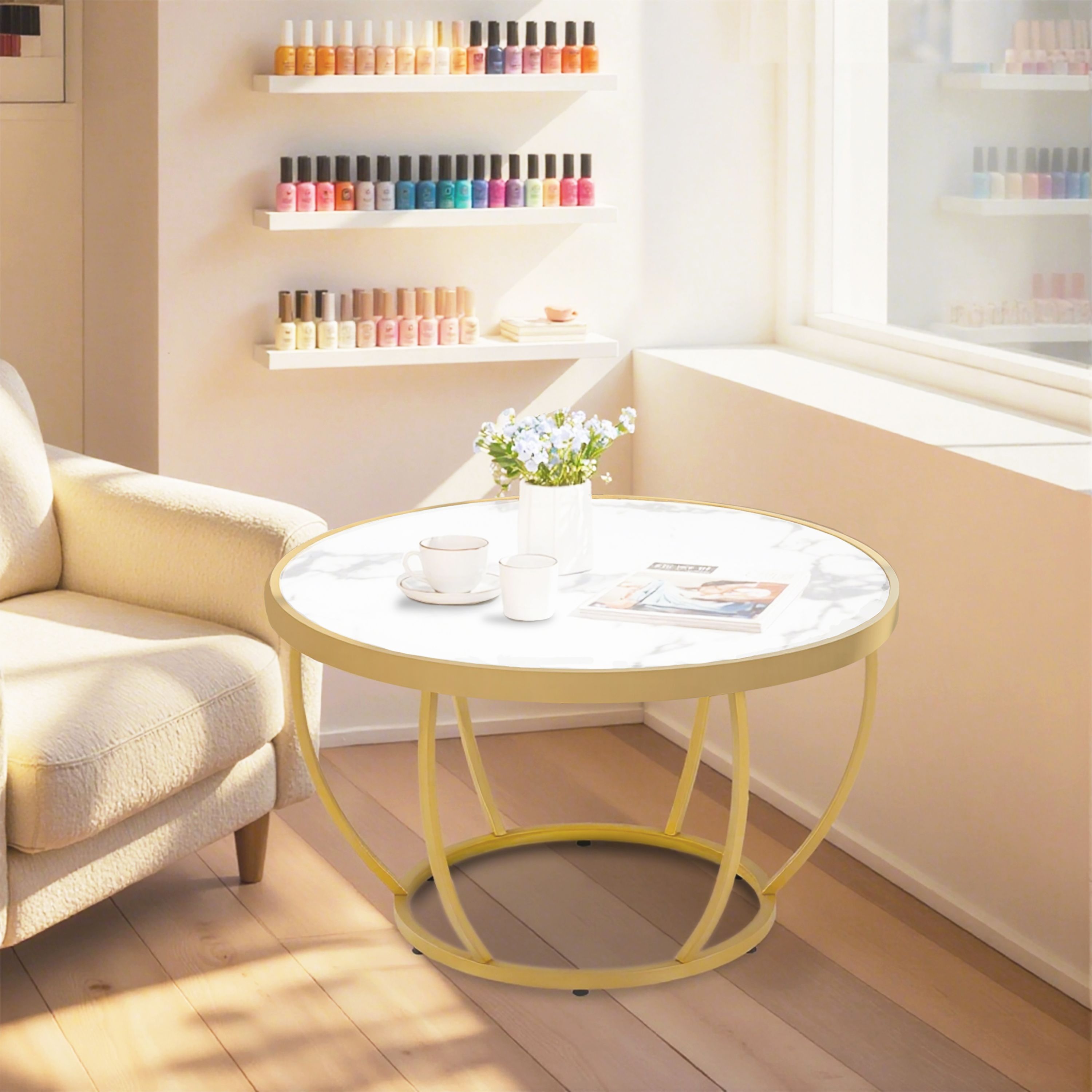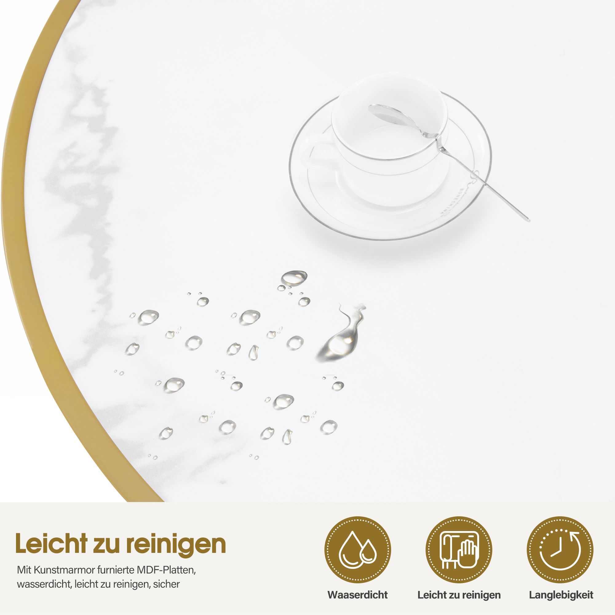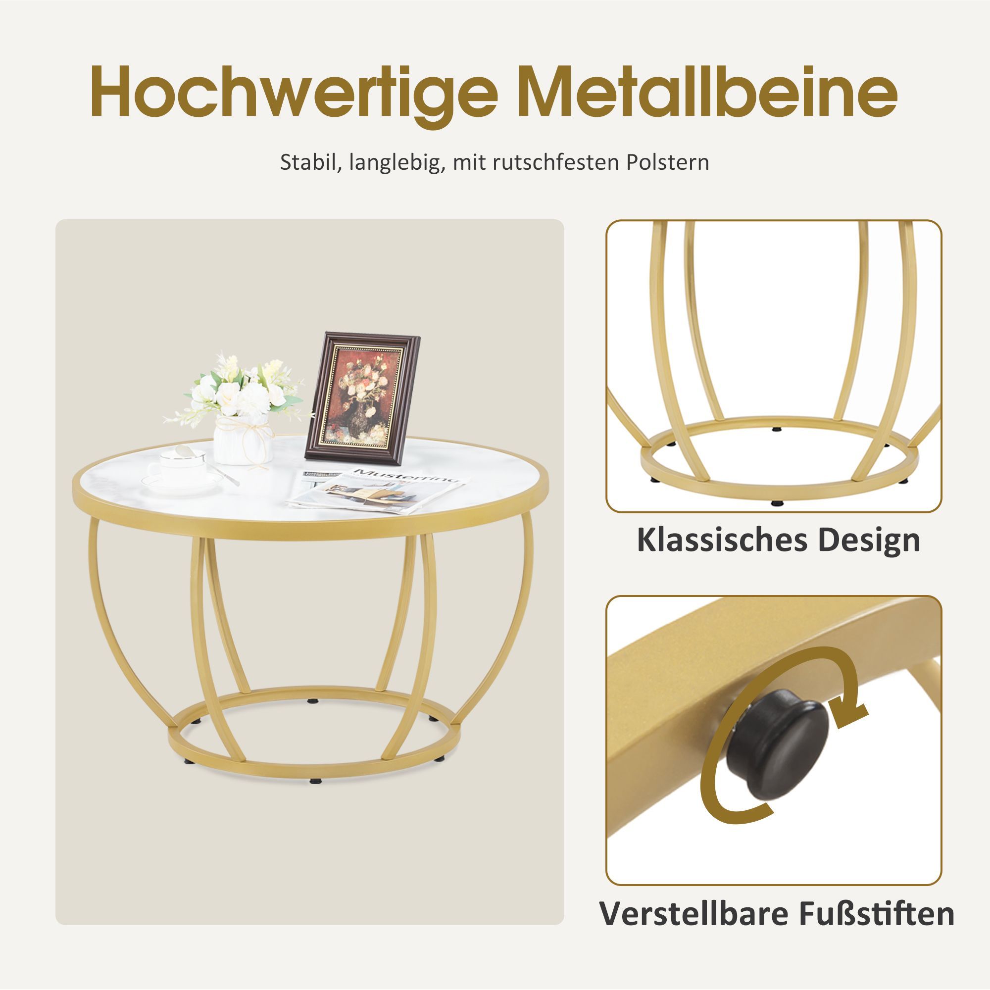 BarberPub Couchtisch Rund Holz, Sofatisch Beistelltisch Weiß-Gold, 2185