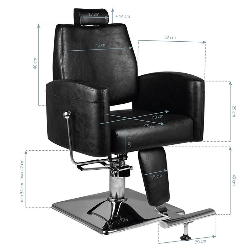 Ein klassischer Friseurstuhl Barbierstuhl von HAIR SYSTEM. Elegant und sehr bequem. Das solide verchromte Gestell sorgt für die Stabilität des Sitzes. Die Polsterung wurde aus einem hochwertigen Ökoleder in Schwarz hergestellt. Er verfügt über eine Rückenlehnen- und Kopfstützenverstellung sowie eine
